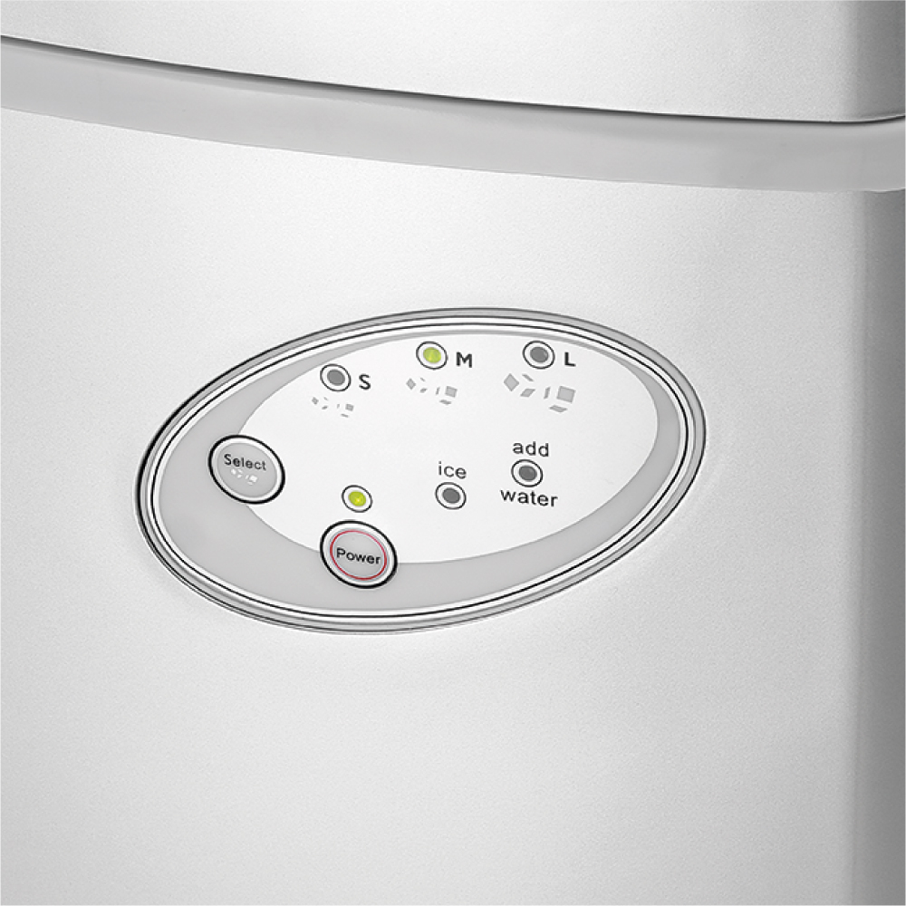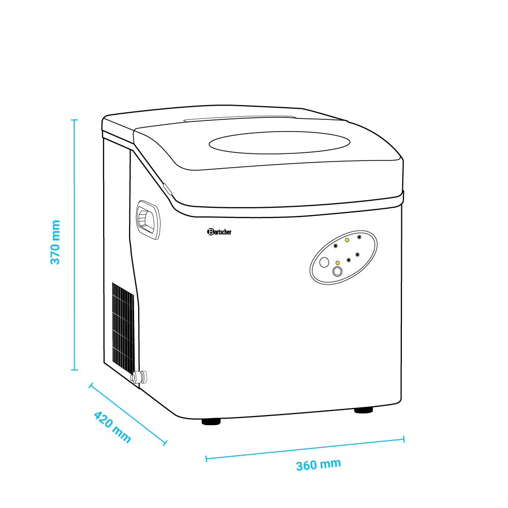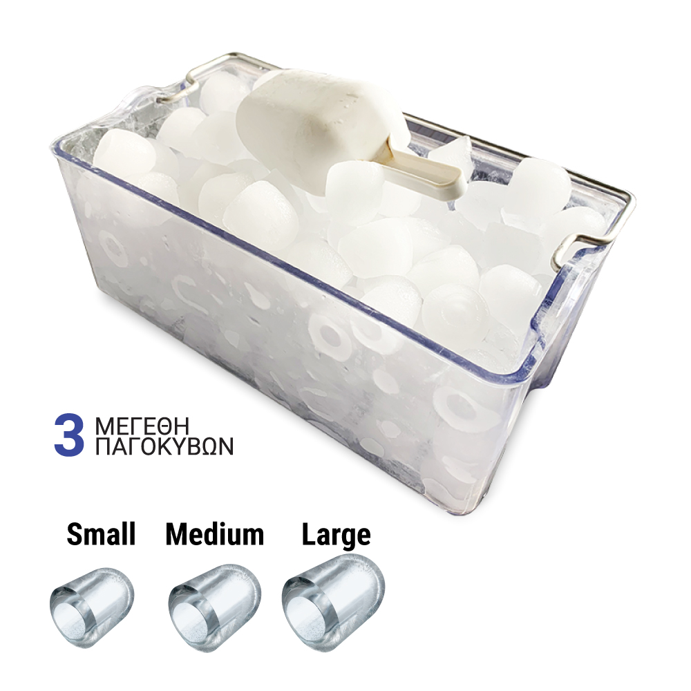 Διαστάσεις 375x420x415(h)mm Iσχύς 320 Watt, 230V / 50Hz Ημερήσια παραγωγή 15 kg Παγάκια σε 3 μεγέθη S:Ø1.5cm|h-3.5cm M:Ø2.2cm|h-3.5cm L:Ø2.5cm|h-3.5cm Χωρητικότητα αποθήκης 150 παγάκια (4,5lt περίπου) Παγάκια ανά κύκλο 12 Ψυκτικό υγρό R290/0.033Kg Απορροή νερού Αριστερά Υλίκο Πλαστικό Βάρος 13.9 kg Κωδικός προϊόντος 100082 Δεν απαιτείται σύνδεση στο δίκτυο ύδρευσης. Αισθητήρας στάθμης πλήρωσης Διακόπτης επιλογής για το μέγεθος των παγόκυβων Διακόπτης on/off Παγάκι : Κωνικό σχήμα (κοίλος κώνος) Συμπεριλαμβάνεται : 1 σέσουλα πάγου