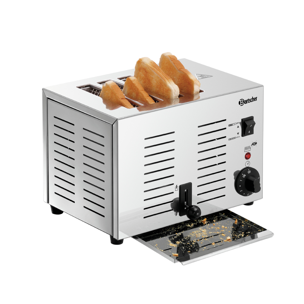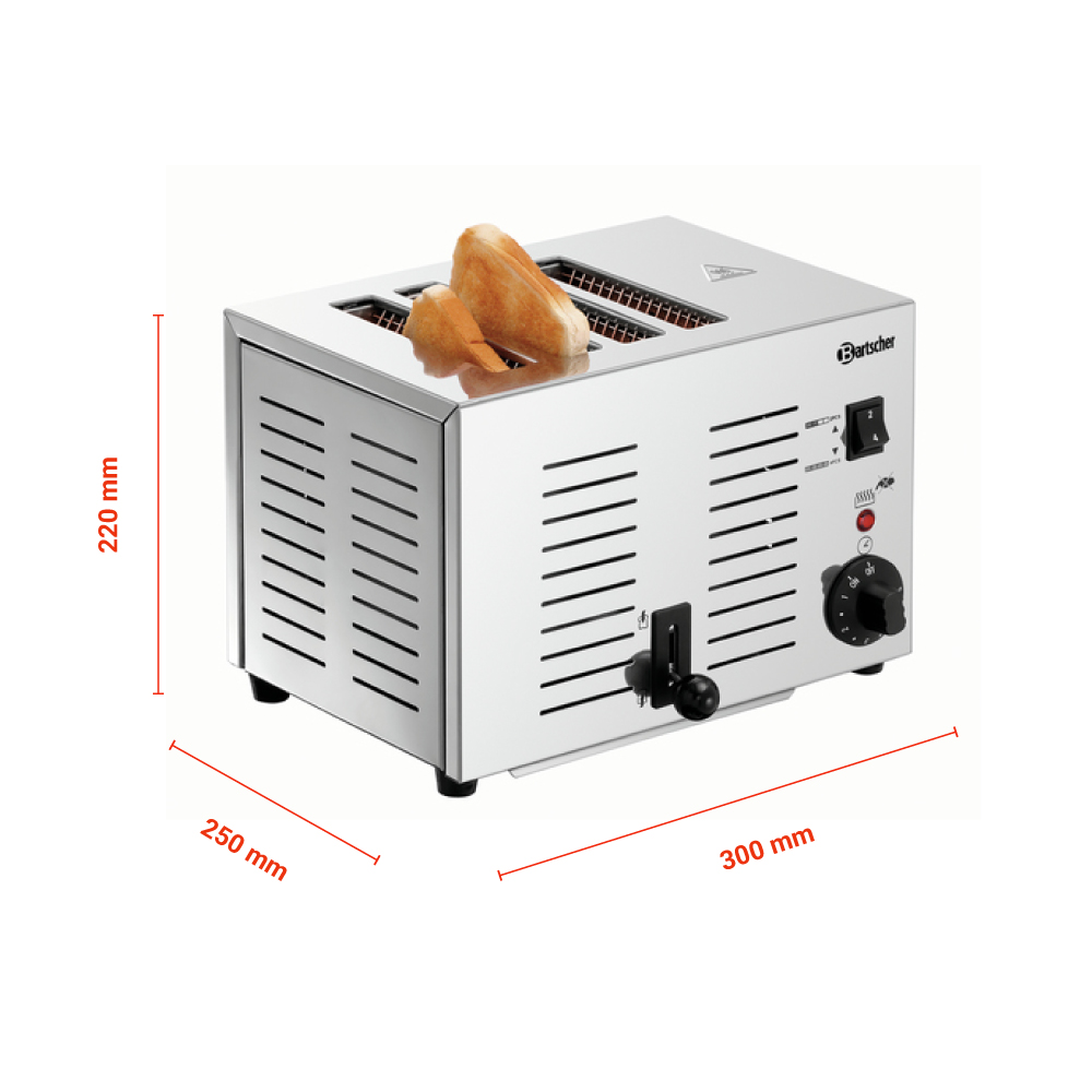 Διαστάσεις 300x250x220(h)mm Διάσταση ανοίγματος υποδοχής 145x20mm Υποδοχές 4 Ισχύς 1800W / 230V / 50 Hz Ρύθμιση χρόνου 1 - 5 Λειτουργίες Φρυγάνισμα Βάρος 4.2 kg Κατασκευή Inox 1 μοχλός για χειροκίνητη (απόρριψη) για τις 4 εγκοπές Διακόπτης επιλογής για θέση σε λειτουργία εξοπών της φρυγανιέρας (2 ομάδων) Συρταράκι για τα τρίμματα Ακουστικό σήμα μετά την λήξη του χρόνου