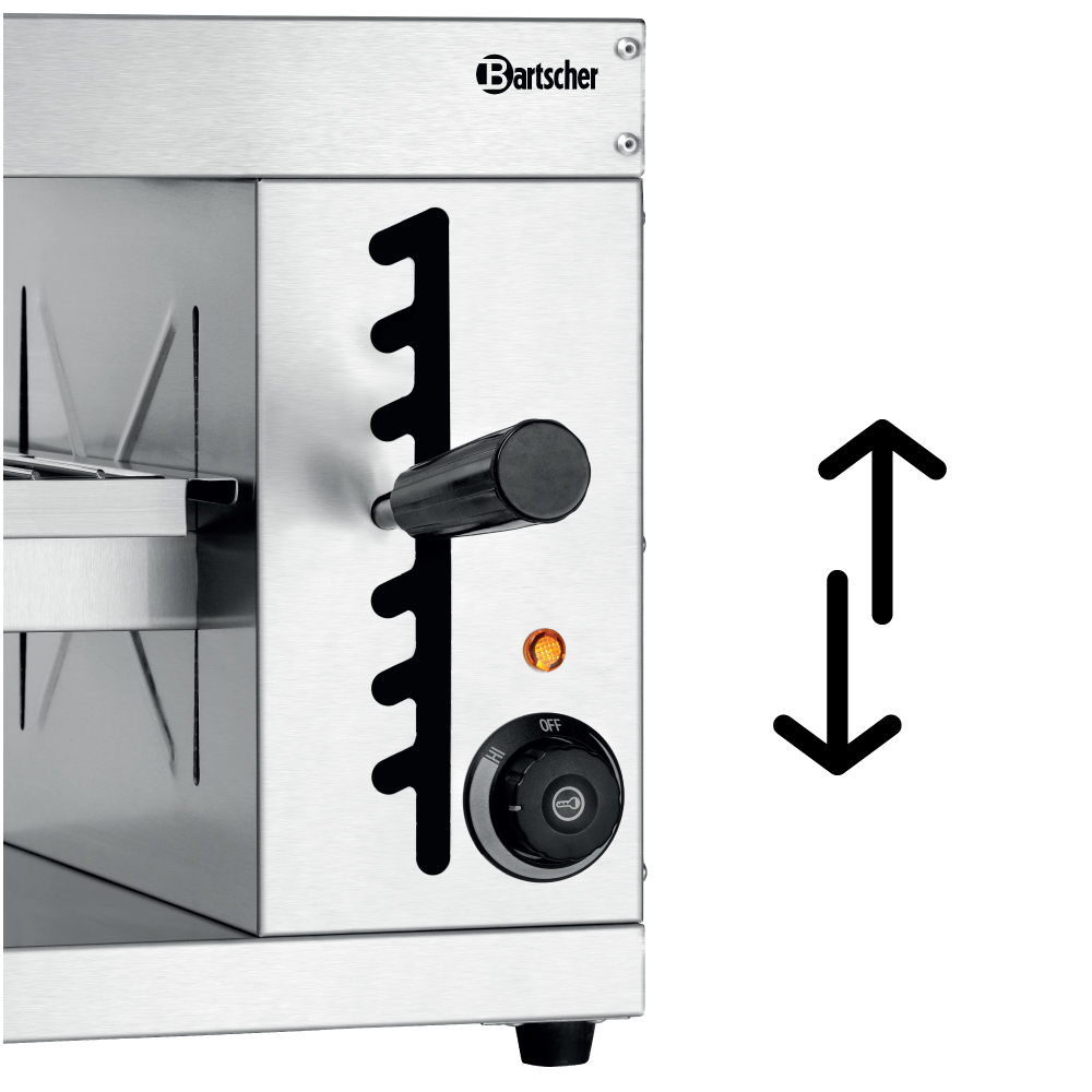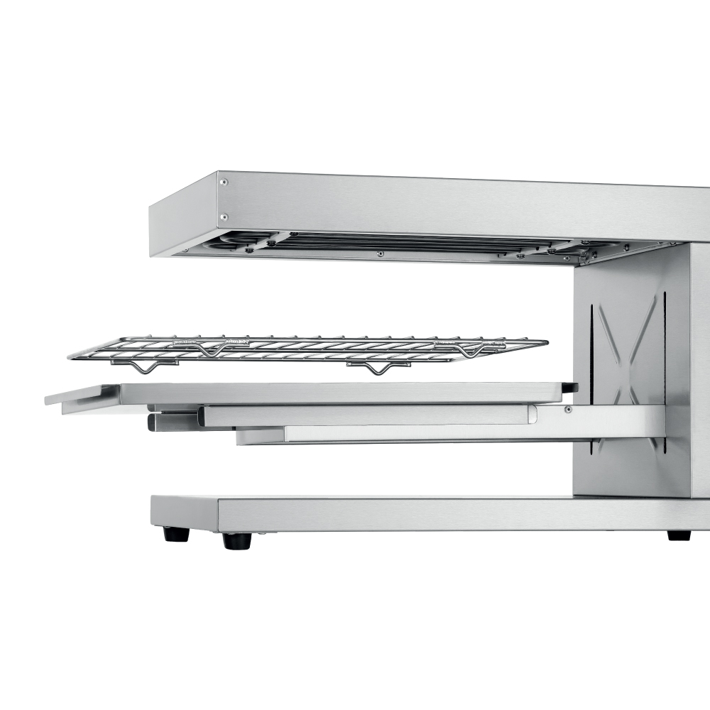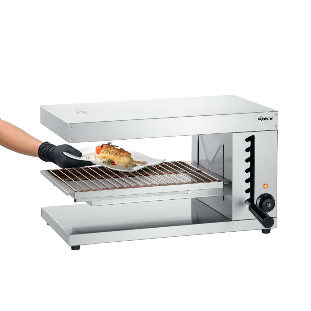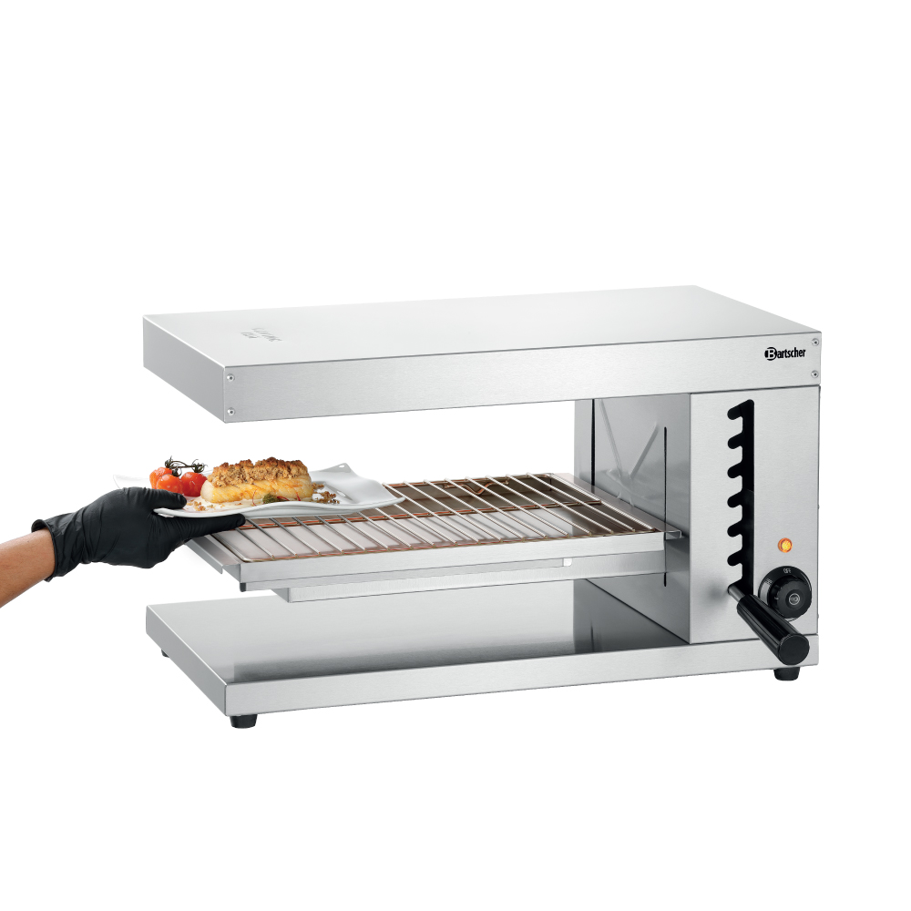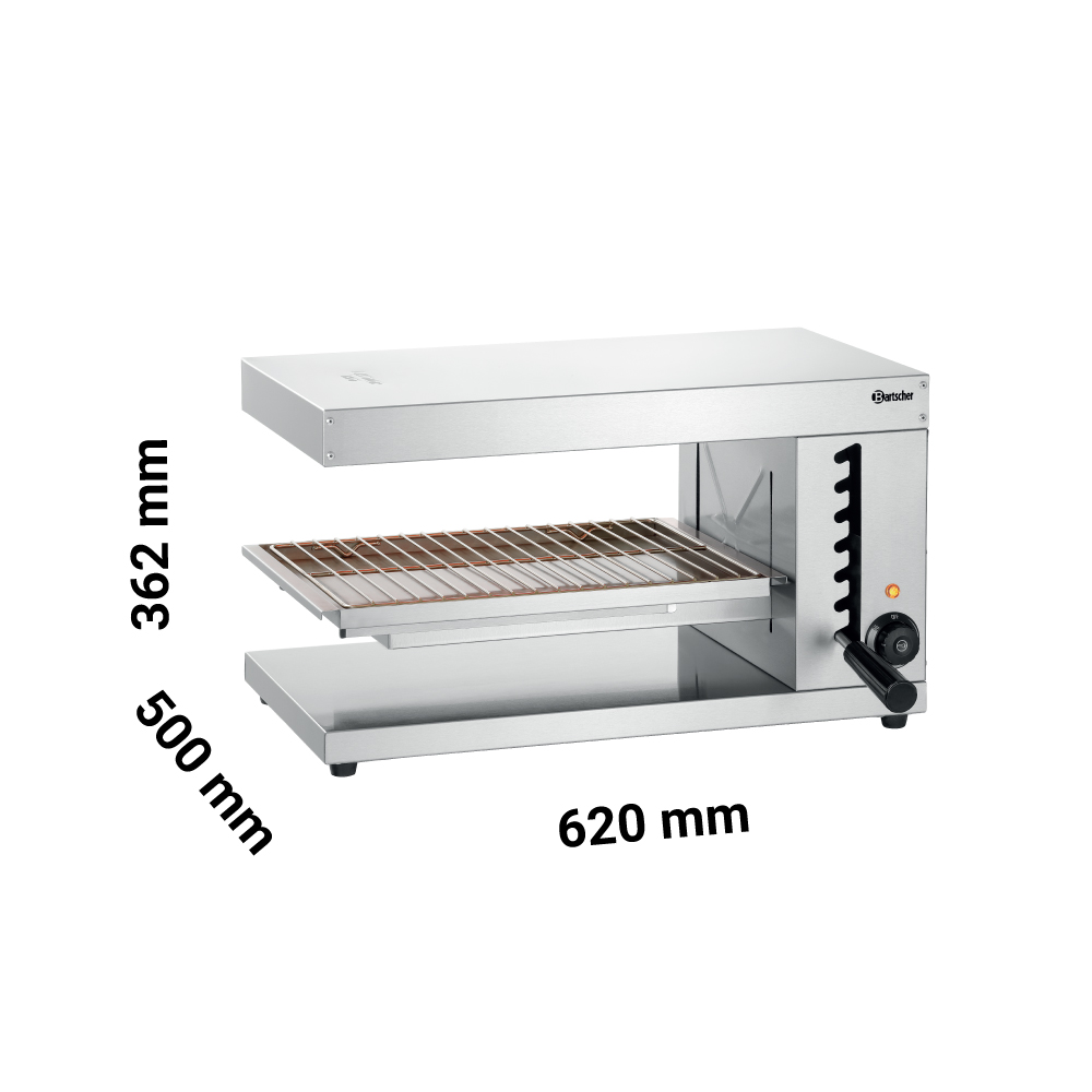 Διαστάσεις 620x500x362(h)mm Διάσταση σχάρας 430x300mm Ελεύθερο ύψος 160 mm Ζώνες θέρμανσης 1 Ισχύς 2,8 KWatt, 230V / 50-60Hz Βάρος 14,2 kg 1 θερμαντικό στοιχείο 1 σχάρα ψησίματος με ρύθμιση ύψους Θερμοστατικός διακόπτης (Simmerstat) Συμπεριλαμβάνεται: Λιποσυλλέκτης