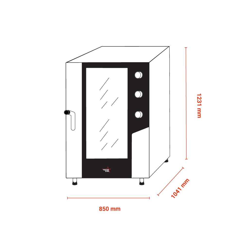 Διαστάσεις 850x1041x1231(h)mm Χωρητικότητα 10 λαμαρίνες (600x400mm) ή 10 GN 1/1 Απόσταση μεταξύ των λαμαρινων 80 mm Θερμοστάτης 100°C - 260°C Ανεμιστήρες 3 εναλλασόμενης φοράς Ισχύς 18 KWatt / 15.480Kcal Βάρος 158 Kg ΔΕΝ περιλαμβάνονται λαμαρίνες η GN Υγραντήρας απευθείας ψεκασμού (5 στάδια)