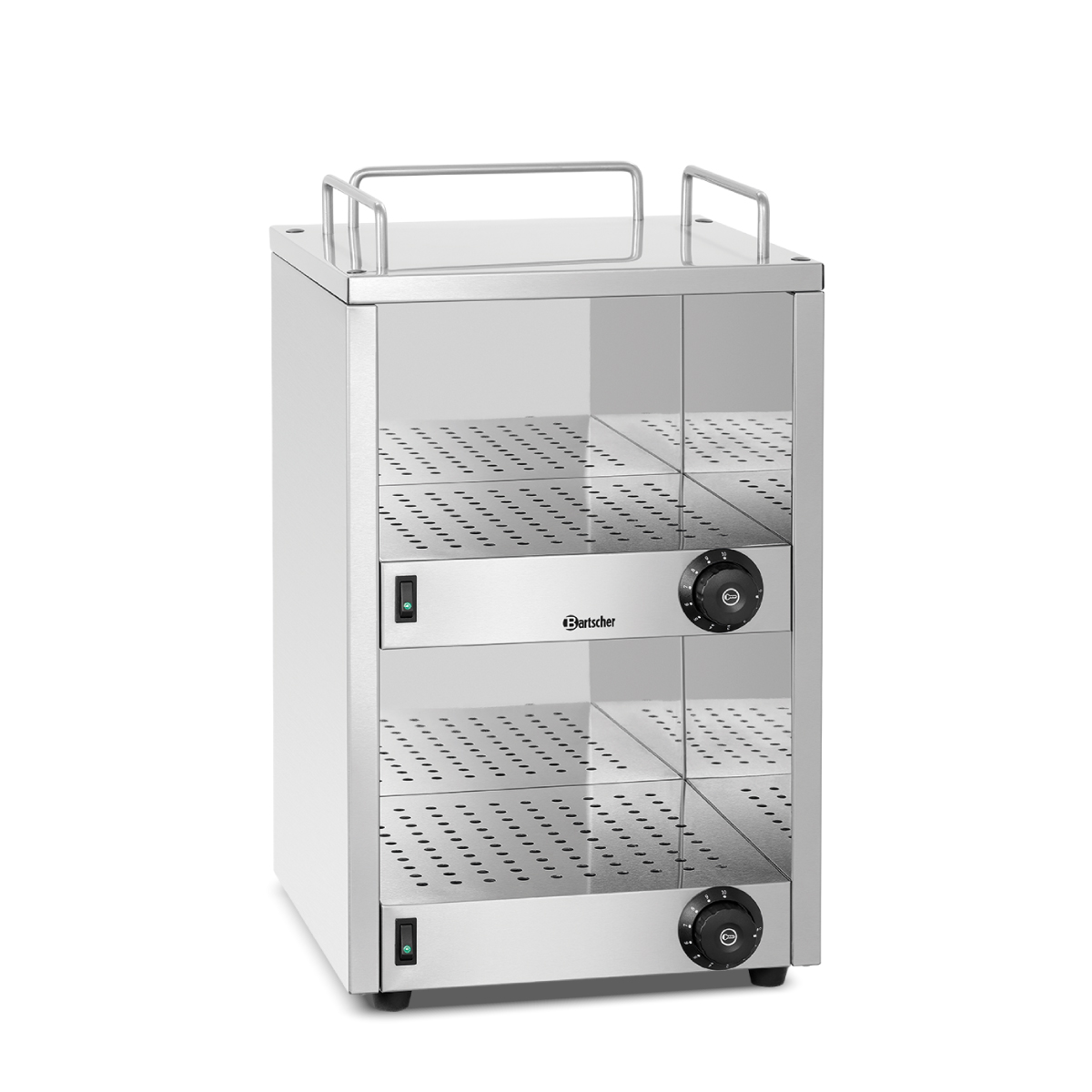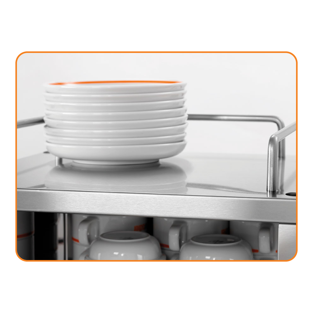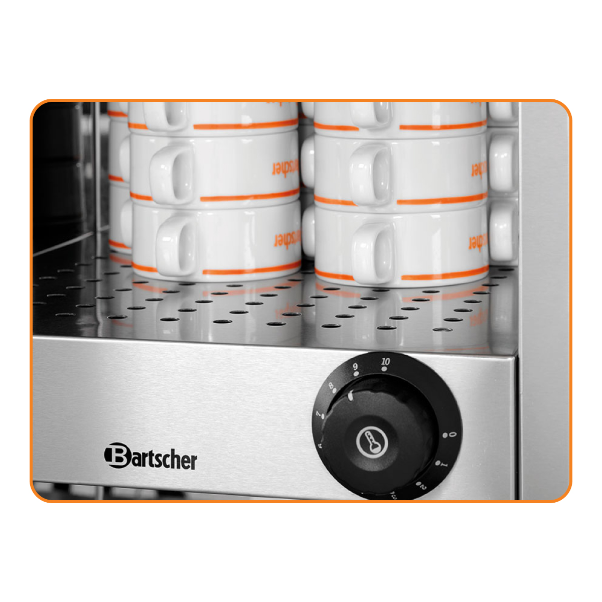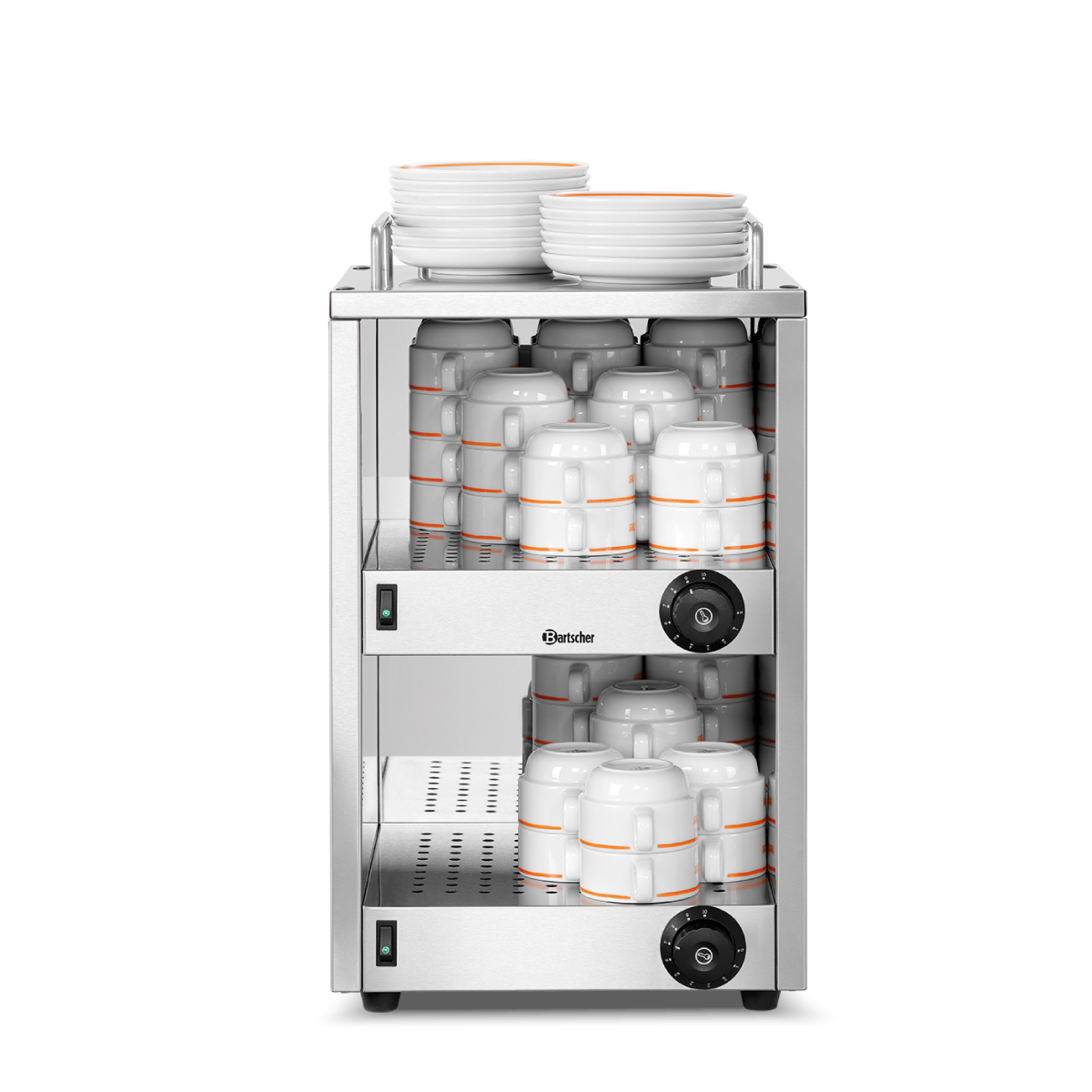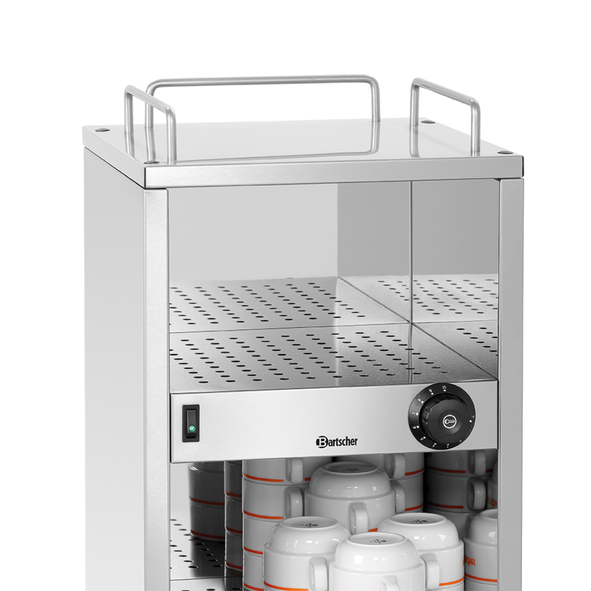 Διαστάσεις 320x345x550(h)mm Διαστάσεις επιφανειών τοποθέτησης 280x295x175(h)mm Μέγιστη χωρητικότητα σε φλιτζάνια 72 Εύρος θερμοκρασίας έως 60°C Ισχύς 140 W / 230 V / 50-60 Hz Υλικό Inox Βάρος 10.7 Kg Κωδικός προϊόντος 103076 Διακόπτης on/off Θερμοστάτης ασφαλείας Δεν συμπεριλαμβάνονται φλιτζάνια & πιατάκια.