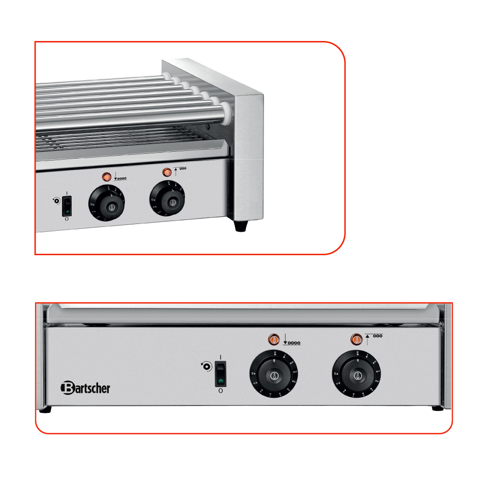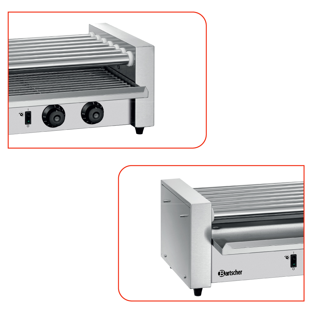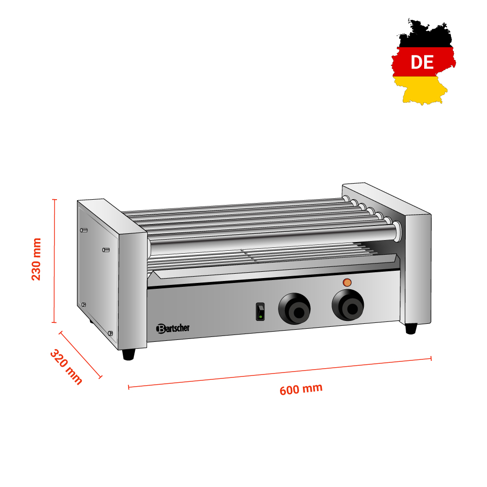 Διαστάσεις 600x320x230(h)mm Χωρητικότητα σε λουκάνικα 18 Ισχύς 590 Watt, 230V / 50Hz Θερκοκρασία λειτουργίας 20 - 110 οC Μήκος κυλίνδρου 460 mm Αριθμός κυλίνδρων 7 περιστρεφόμενοι Βάρος 13,3 kg Κωδικός προϊόντος 104922 Κατασκευή Inox 2 ζώνες ξεχωριστά θερμαινόμενες (4+3 περιστρεφόμενοι κύλινδροι) Διακόπτης ON / OFF Περιλαμβάνεται λιποσυλλέκτης.