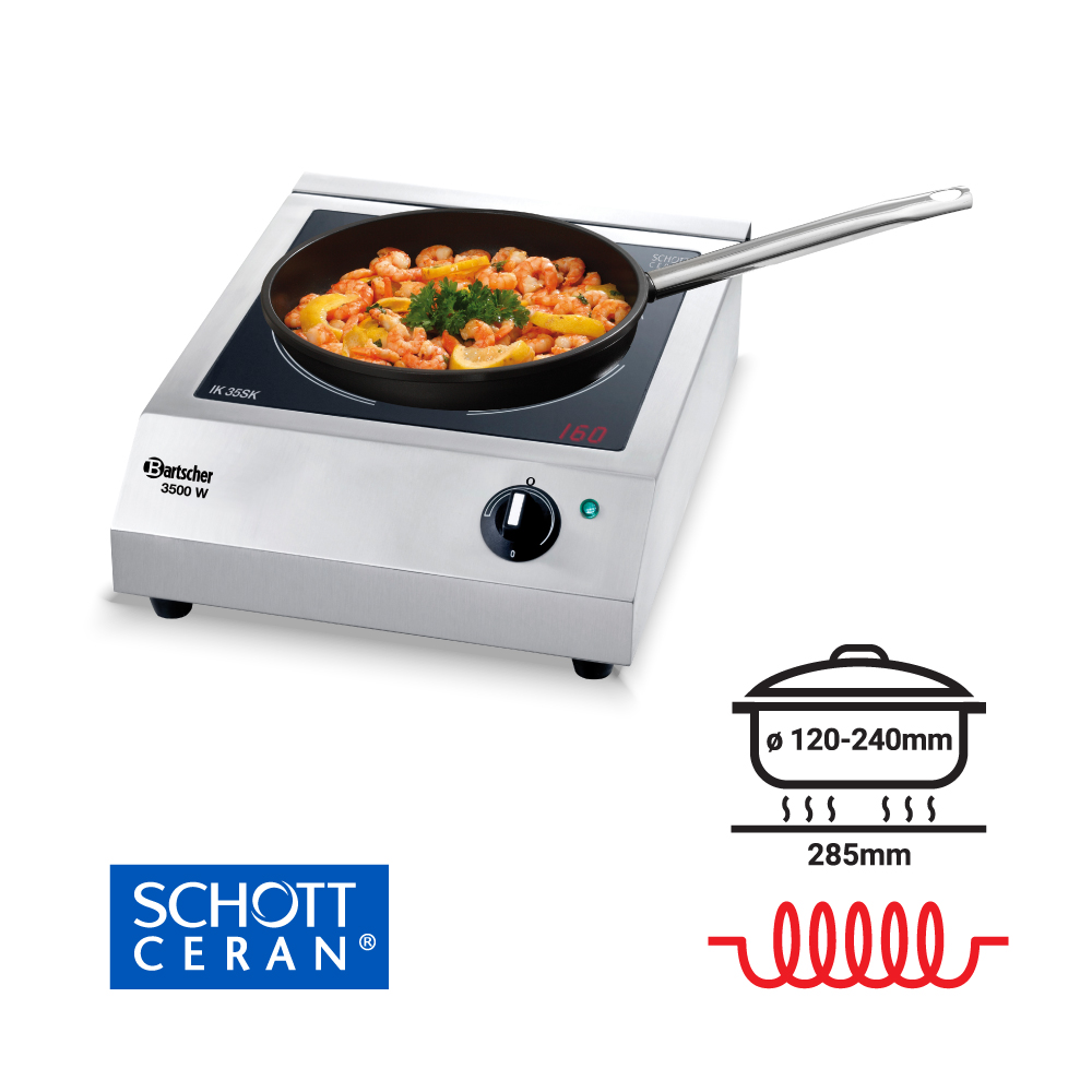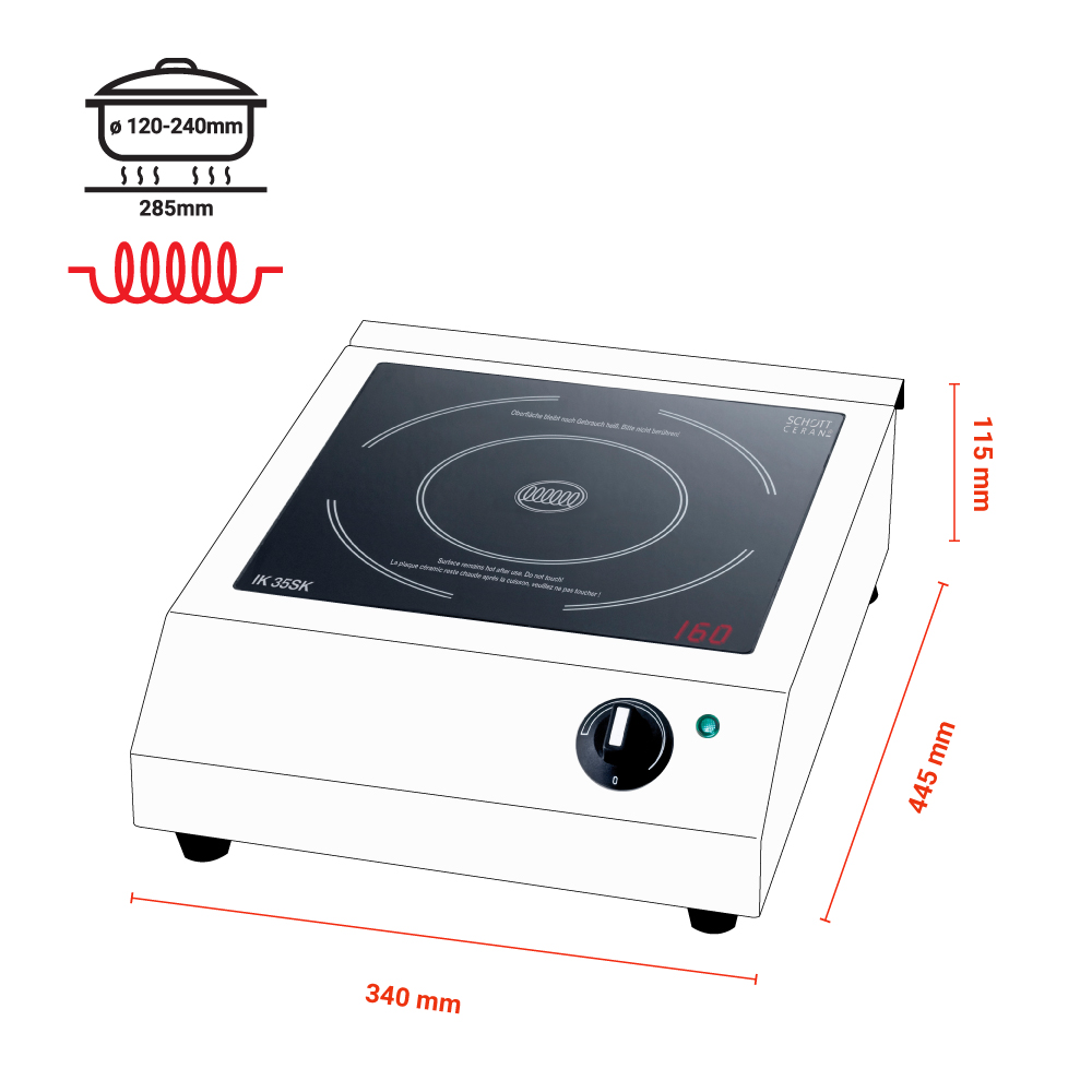 Διαστάσεις 340x445x115(h)mm Διάμετρος εστίας Ø 228mm Διαστάσεις γυάλινης επιφάνειας 285x285mm Ιδανική επιφάνεια ψησίματος min Ø 120mm / max Ø 240mm Θερμοκρασία 60 έως 240oC Ισχύς 3500Watt / 230V / 50Hz Στάδια ρυθμίσεων θερμοκρασίας 10 (ανά 20ºC) Υλικό επιφάνεια ψησίματος Scott Ceran® Καθαρό Βάρος 7,2 kg Ηλεκτρονική προστασία υπερθέρμανσης