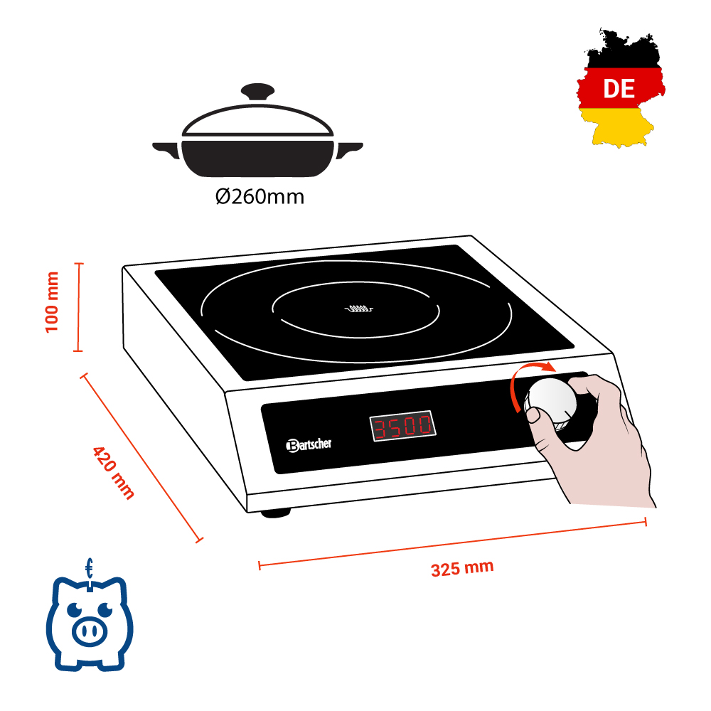 Διαστάσεις 325x420x100(h)mm Διάμετρος εστίας Ø 260mm Διαστάσεις γυάλινης επιφάνειας 280x280mm Ισχύς 3500Watt / 230V / 50-60Hz Στάδια ρυθμίσεων ισχύος 9 Καθαρό Βάρος 4,5 kg Ηλεκτρονική προστασία υπερθέρμανσης