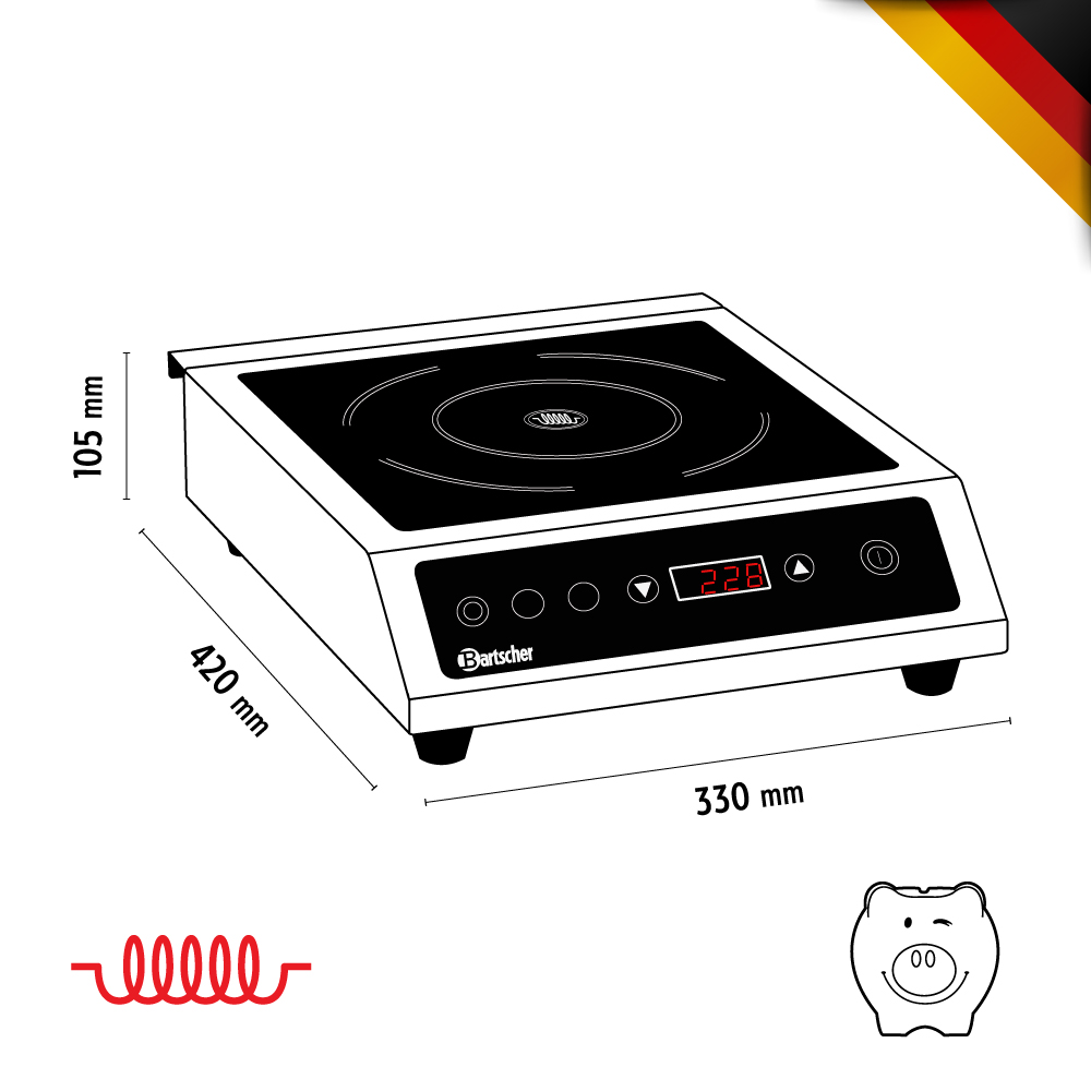 Διαστάσεις 330x420x105(h)mm Διάμετρος εστίας Ø 230mm Διαστάσεις γυάλινης επιφάνειας 280x280mm Ιδανική επιφάνεια ψησίματος min Ø 150mm / max Ø 260mm Θερμοκρασία 60 έως 240oC Ισχύς 3500Watt / 230V / 50-60Hz Στάδια ρυθμίσεων ισχύος 13 (500-2700 Watt) Στάδια ρυθμίσεων θερμοκρασίας 10 (ανά 20ºC) Ρύθμιση χρόνου 0 εώς 180 λέπτα Καθαρό Βάρος 5,2 kg Ηλεκτρονική προστασία υπερθέρμανσης Διακόπτης On / Off