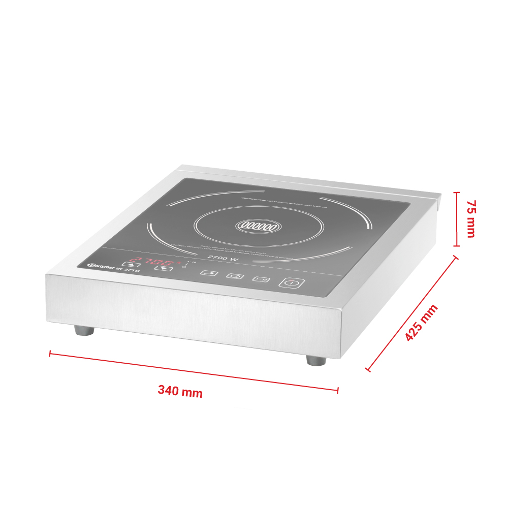 Διαστάσεις 340x425x75(h)mm Διάμετρος εστίας Ø 260mm Διαστάσεις γυάλινης επιφάνειας 285x275mm Ιδανική επιφάνεια ψησίματος min Ø 120mm / max Ø 260mm Θερμοκρασία 60 έως 240oC Ισχύς 2700Watt / 230V / 50-60Hz Στάδια ρυθμίσεων ισχύος 10 (500-2700 Watt) Στάδια ρυθμίσεων θερμοκρασίας 10 (ανά 20ºC) Ρύθμιση χρόνου 1 εώς 180 λέπτα Καθαρό Βάρος 4,8 kg Κατάλληλη για χρήση σε μπουφέδες Ηλεκτρονική προστασία υπερθέρμανσης Διακόπτης On / Off Δεν ενδείκνυται για συνεχή & εντατική επαγγελματική χρήση