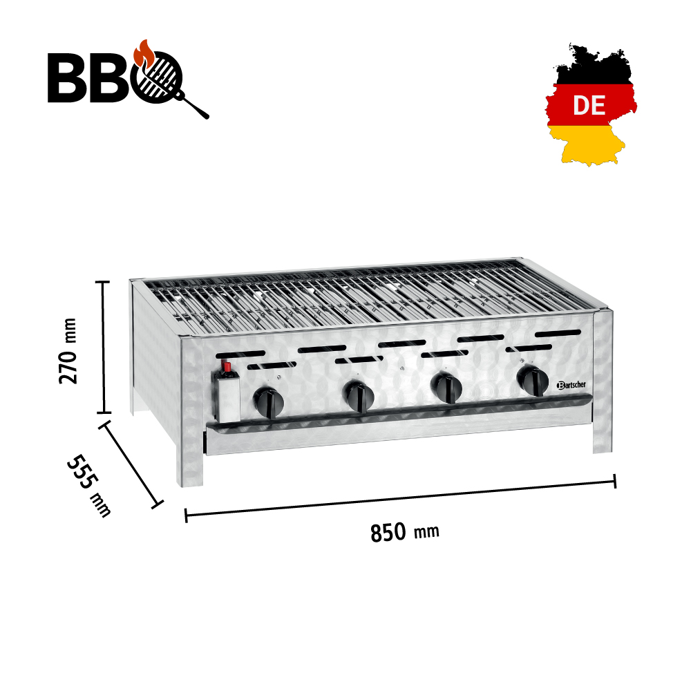 Διαστάσεις 850x555x270(h) mm Επιφάνεια ψησίματος 760 x 470 mm Ισχύς 14.7ΚW Καυστήρες 4 Ρύθμιση πίεσης 50mbar Κατανάλωση 1140 g/h Βάρος 23 Kg Κατασκευή : Inox Συμπεριλαμβάνονται 1 εύκαμπτος σωλήνας , 1 ασφάλεια ρήξης εύκαμπτου σωλήνα & ένας επαγγελματικός ρυθμιστής πίεσης Λειτουργεί μόνο με υγραέριο!