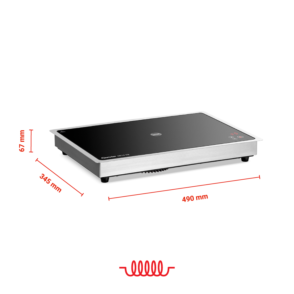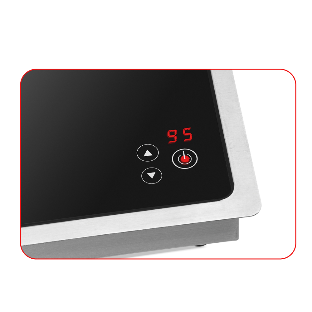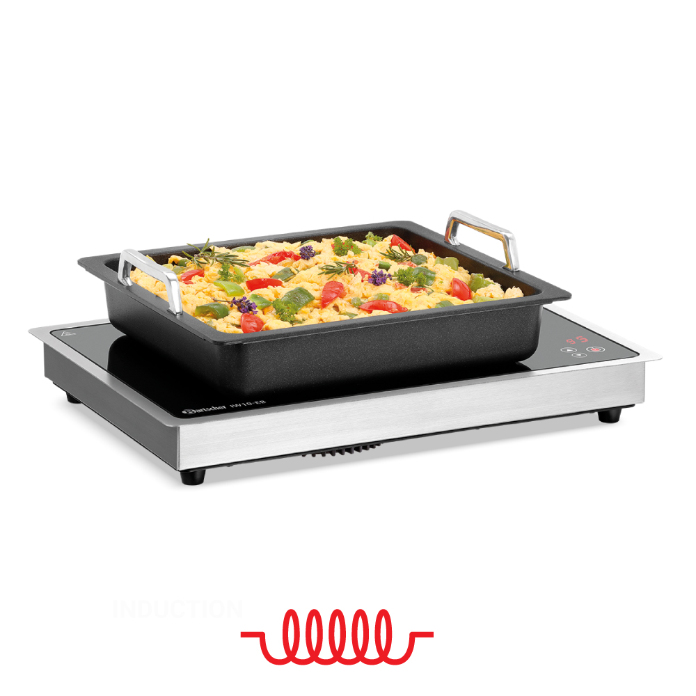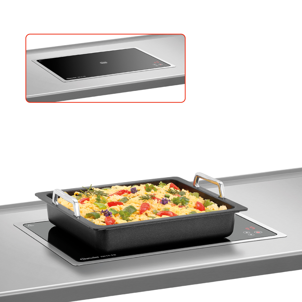 Διαστάσεις 490x345x67(h)mm Διαστάσεις γυάλινης επιφάνειας 455x310mm Θερμοκρασία ρυθμιζόμενη 40 - 100οC Ισχύς 1000 Watt, 230V / 50HZ Αριθμός βαθμίδων θερμοκρασίας 13 Βάρος 3,45 kg Ψηφιακός πίνακας λειτουργιών Κατασκευή από αλουμίνιο Επιφάνεια απο γυαλί Ηλεκτρινική προστασία υπερθέρμανσης Με δυνατότητα εντοιχίσης σε πάγκο Τα GN δε συμπεριλαμβάνονται