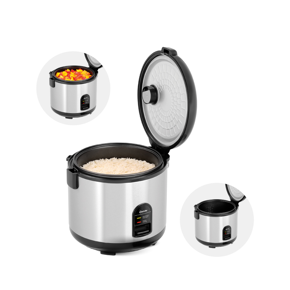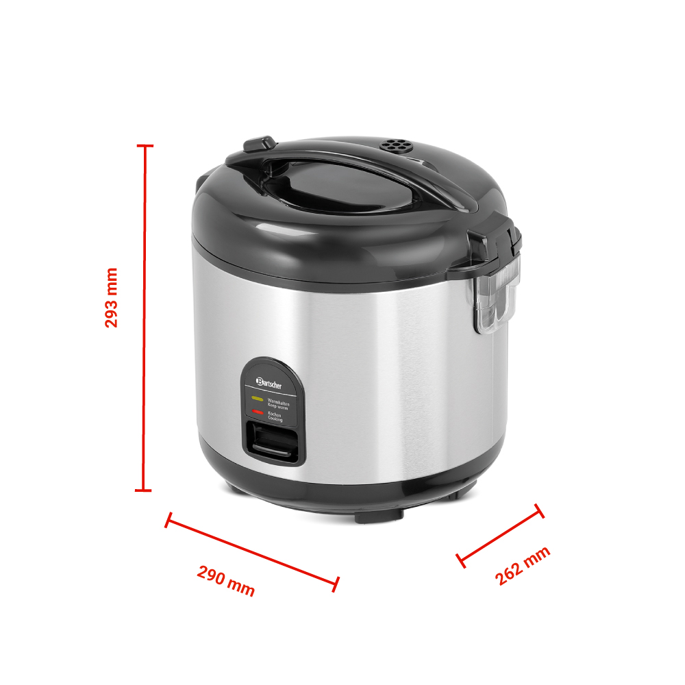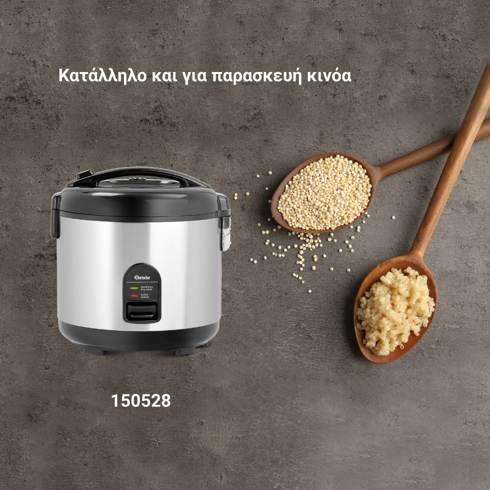 Διαστάσεις 290x262x293(h)mm Ισχύς 700 Watt, 230V / 50-60Hz Χωρητικότητα 1,8 lt (από 2 έως 10 μερίδες) Βάρος 2,7 kg Κωδικός προϊόντος 150528 Κατάλληλος για μαγείρεμα ρυζιού αλλά και ως ατμομάγειρας (με τη χρήση κόσκινου) για λαχανικά, ψάρι ή κρέας Σώμα INOX, καπάκι και βάση από πλαστικό Αντικολλητική επίστρωση στο εσωτερικό δοχείο Συμπεριλαμβάνονται μεζούρα,κουτάλι ρυζιού & ένθετο επεξαργασίας με ατμό.