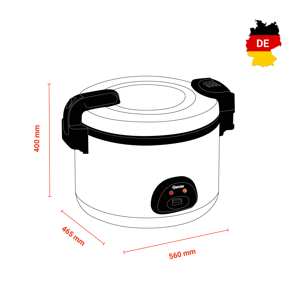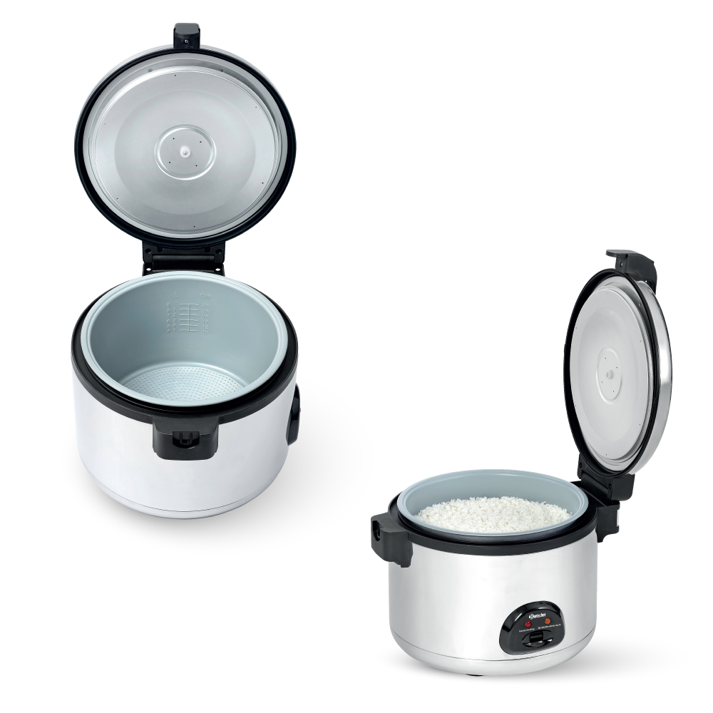 Διαστάσεις 560x465x400(h)mm Ισχύς 2,85 KWatt, 230V / 50-60Hz Χωρητικότητα 12 lt (40-60 μερίδες) Βάρος 15,7 kg Κωδικός προϊόντος 150529 Στρώμα πυριτίου ως προστασία από καταιονισμό Σώμα INOX Εσωτερική κατσαρόλα μη επικολλημένη, ανθεκτική στην υψηλή θερμοκρασία στο εσωτερικό δοχείο Συμπεριλαμβάνονται μεζούρα, κουτάλι για ρύζι , κουτάλι ανάδευσης & επιφάνεια σιλικόνης