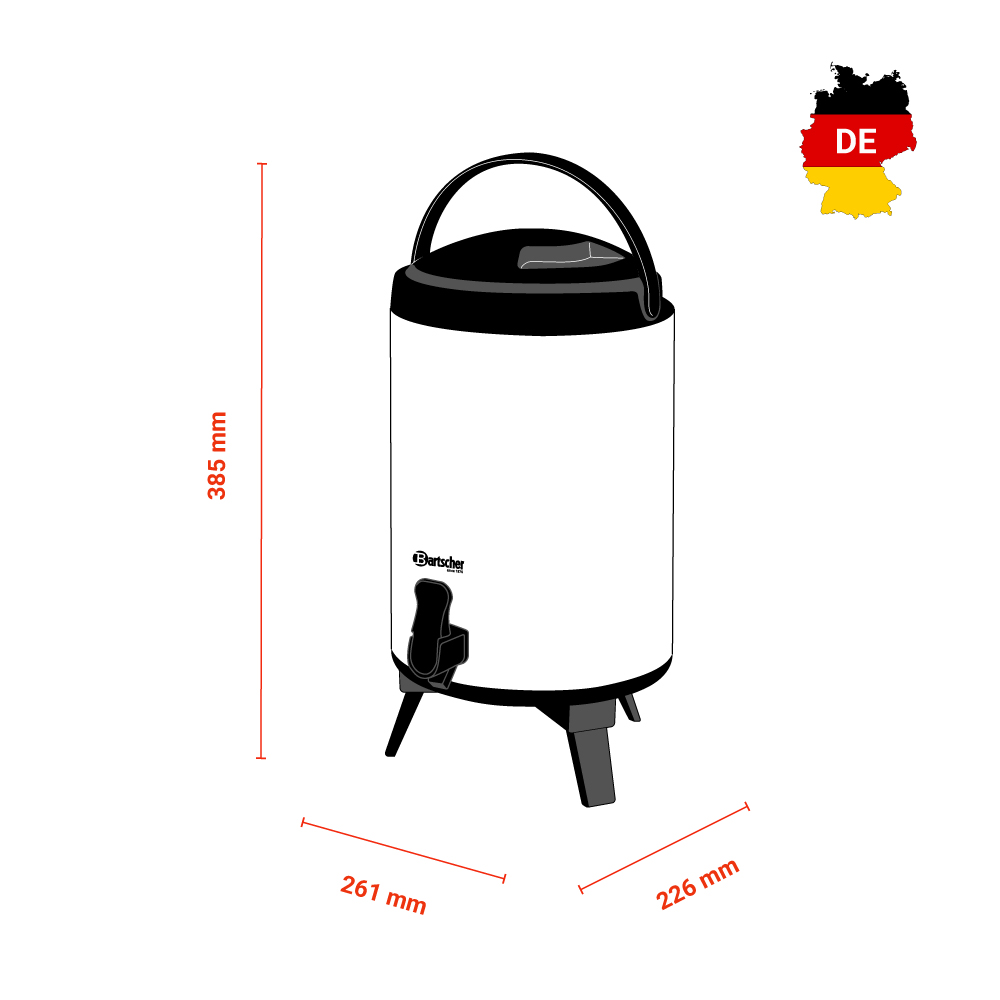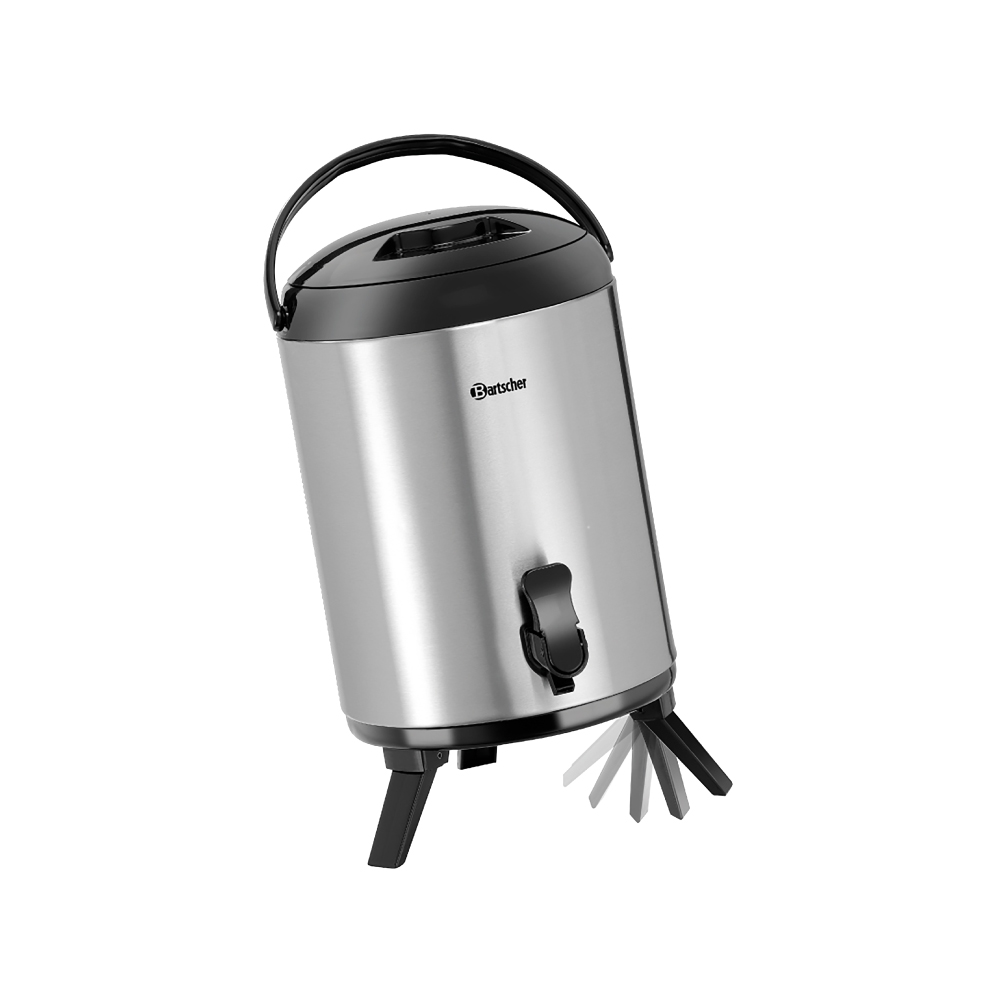 Διαστάσεις 261x226x385(h)mm Χωρητικότητα 9 lt Μέγιστο ύψος ποτηριών 10 cm Υλικό κατασκευής Inox & πλαστικό Βάρος 2 kg Κατάλληλο για ζεστά και κρύα ροφήματα Δοχείο από ανοξείδωτο χάλυβα Με διπλά τοιχώματα Λαβή μεταφοράς Εύκολος καθαρισμός / Αναδιπλούμενα πόδια Το καπάκι & η βρύση αφαιρούνται πλήρως.