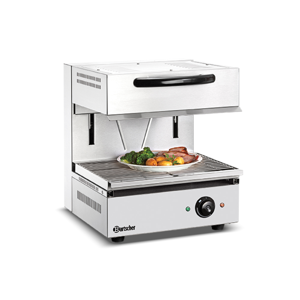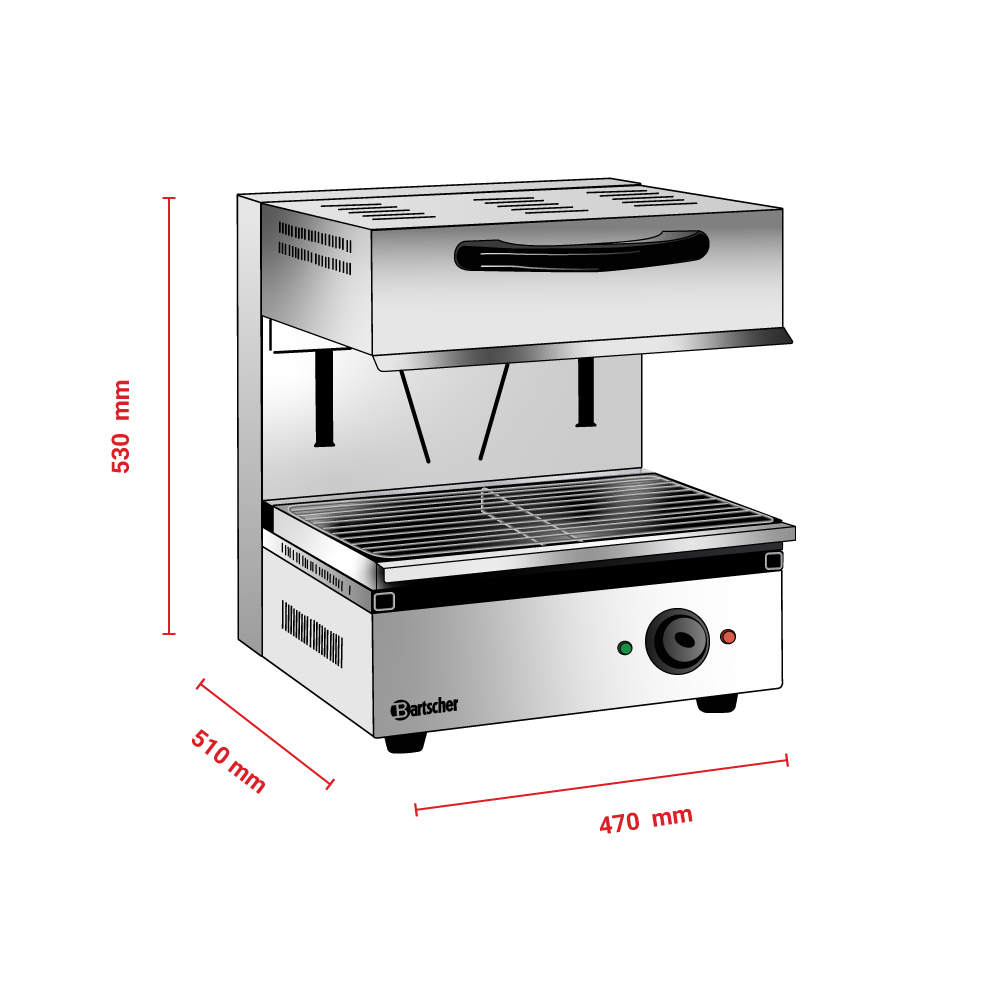 Διαστάσεις 470x510x530(h)mm Διάσταση σχάρας 445x325mm (μετακινούμενη) Ισχύς 2,8 KWatt, 220-240V / 50-60Hz Βάρος 38,8 kg Κωδικός Προϊόντος 151510 Υπέρυθρες αντιστάσεις Θερμοστατικός διακόπτης (Simmerstat) Χειροκίνητη ανύψωση άνω μέρους (με λαβή) Συμπεριλαμβάνεται: Λιποσυλλέκτης