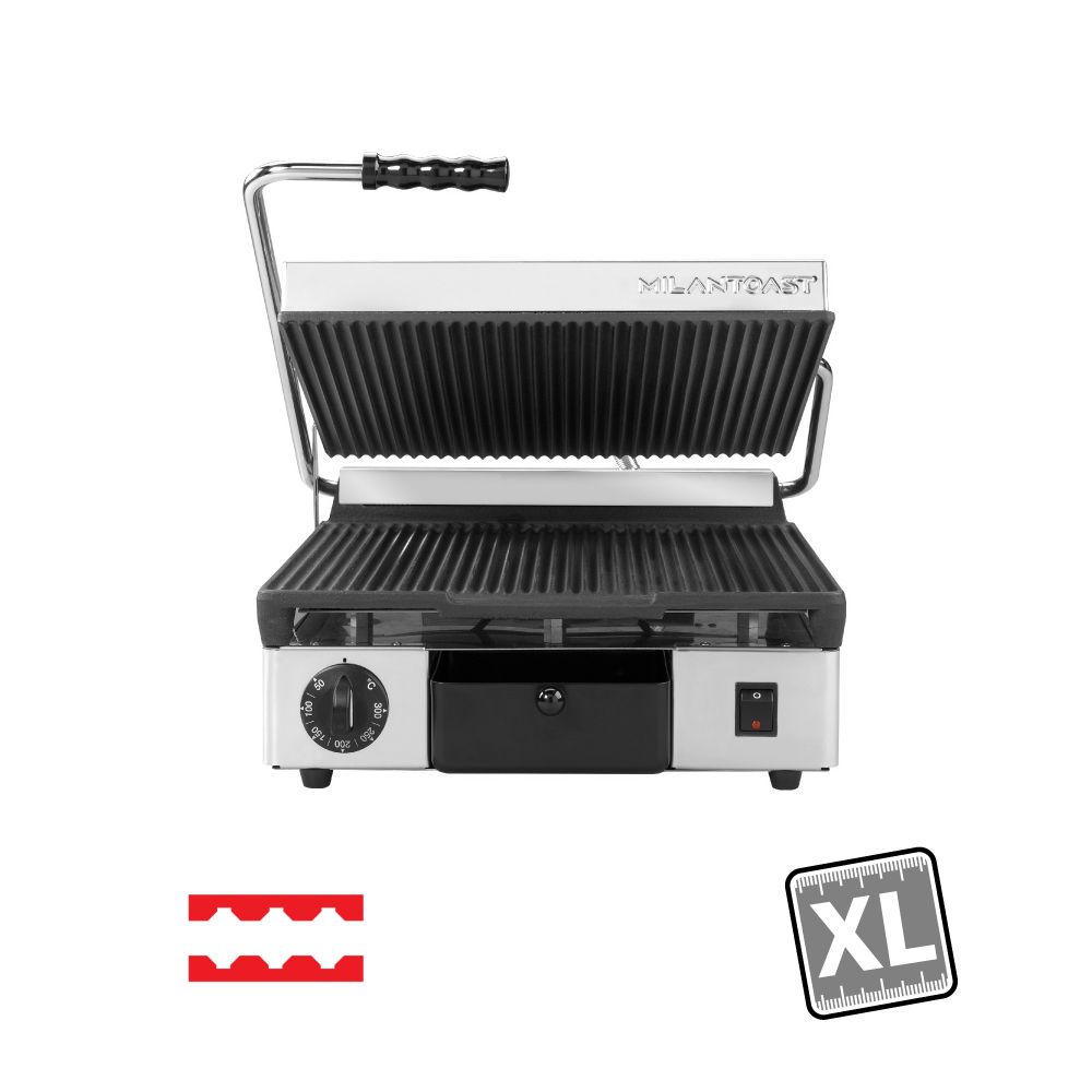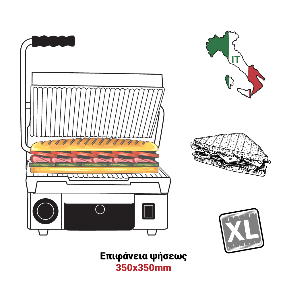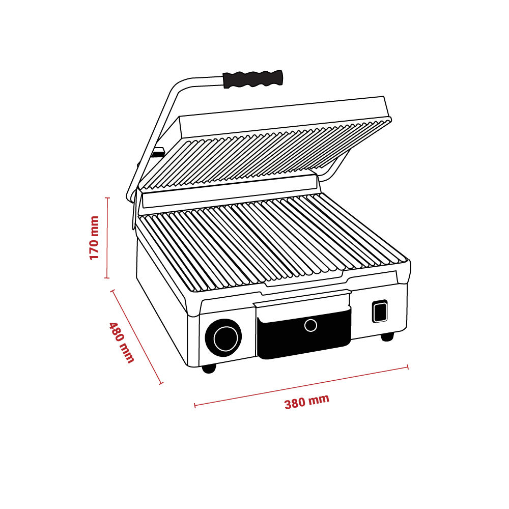 Διαστάσεις 380x480x170(h)mm Επιφάνεια ψήσεως 350x350mm Ισχύς 2,9 KWatt, 230V / 50-60Hz Θερμοστάτης 50 / 300oC Αντιστάσεις ανοξείδωτες μεγάλης αντοχής Ανοξείδωτο περίβλημα Αποσπώμενο συρτάρι / λιποσυλλέκτης Εργονομικοί διακόπτες