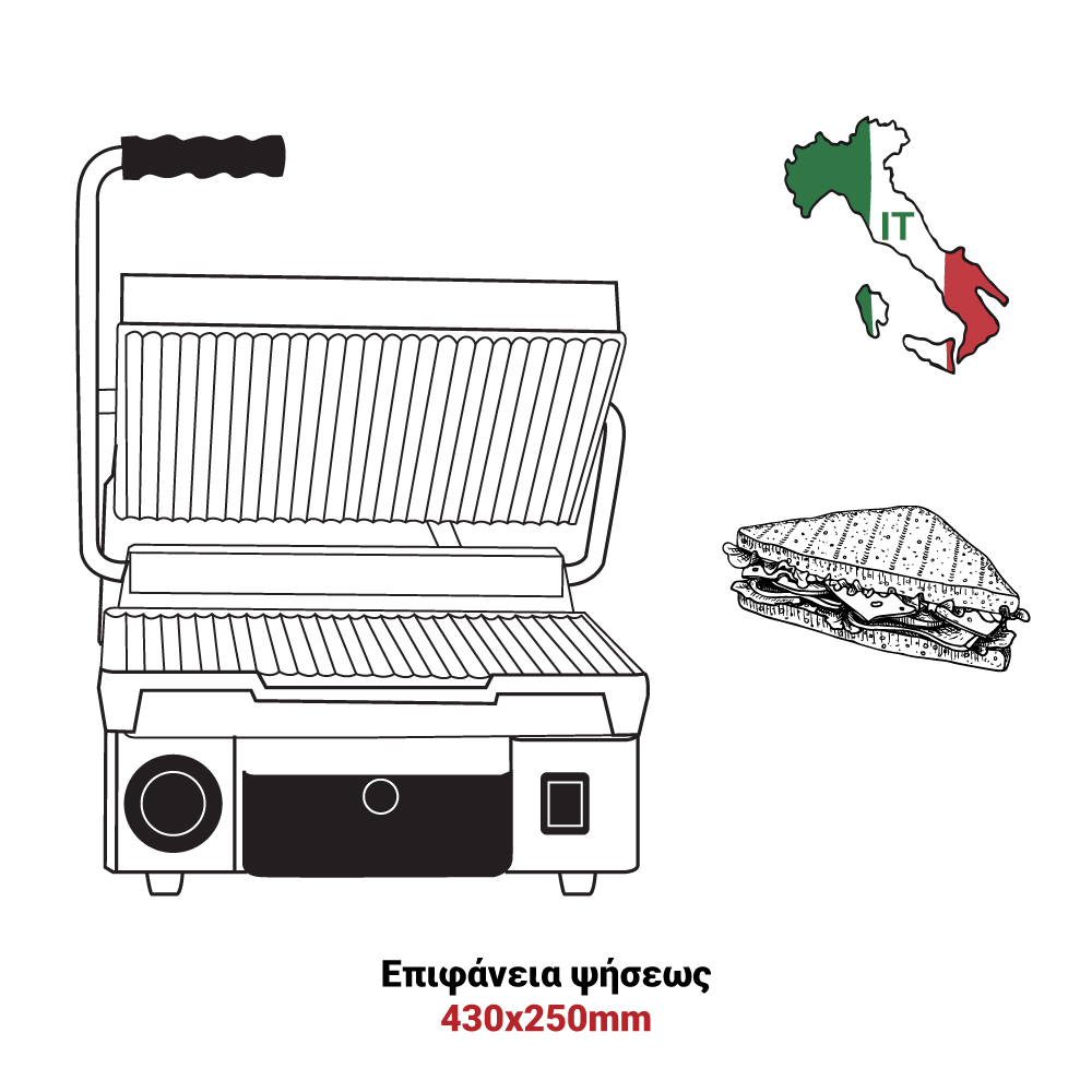 Διαστάσεις 460x380x170(h)mm Επιφάνεια ψήσεως 430x250mm Ισχύς 2,8 KWatt, 230V / 50-60Hz Θερμοστάτης 50 / 300oC Αντιστάσεις ανοξείδωτες μεγάλης αντοχής Ανοξείδωτο περίβλημα Αποσπώμενο συρτάρι / λιποσυλλέκτης Εργονομικοί διακόπτες
