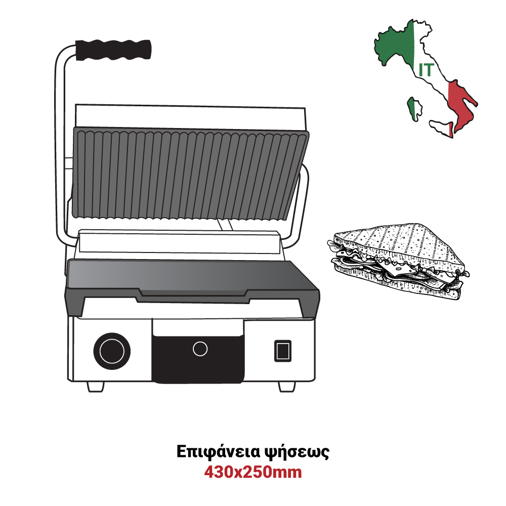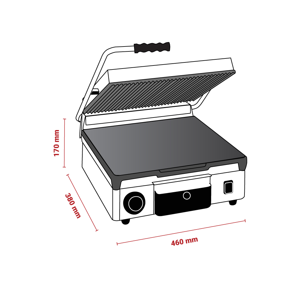 Διαστάσεις 460x380x170(h)mm Επιφάνεια ψήσεως 430x250mm Ισχύς 2,8 KWatt, 220-240V / 50-60Hz Θερμοστάτης 50 / 300oC Αντιστάσεις ανοξείδωτες μεγάλης αντοχής Ανοξείδωτο περίβλημα Αποσπώμενο συρτάρι / λιποσυλλέκτης Εργονομικοί διακόπτες