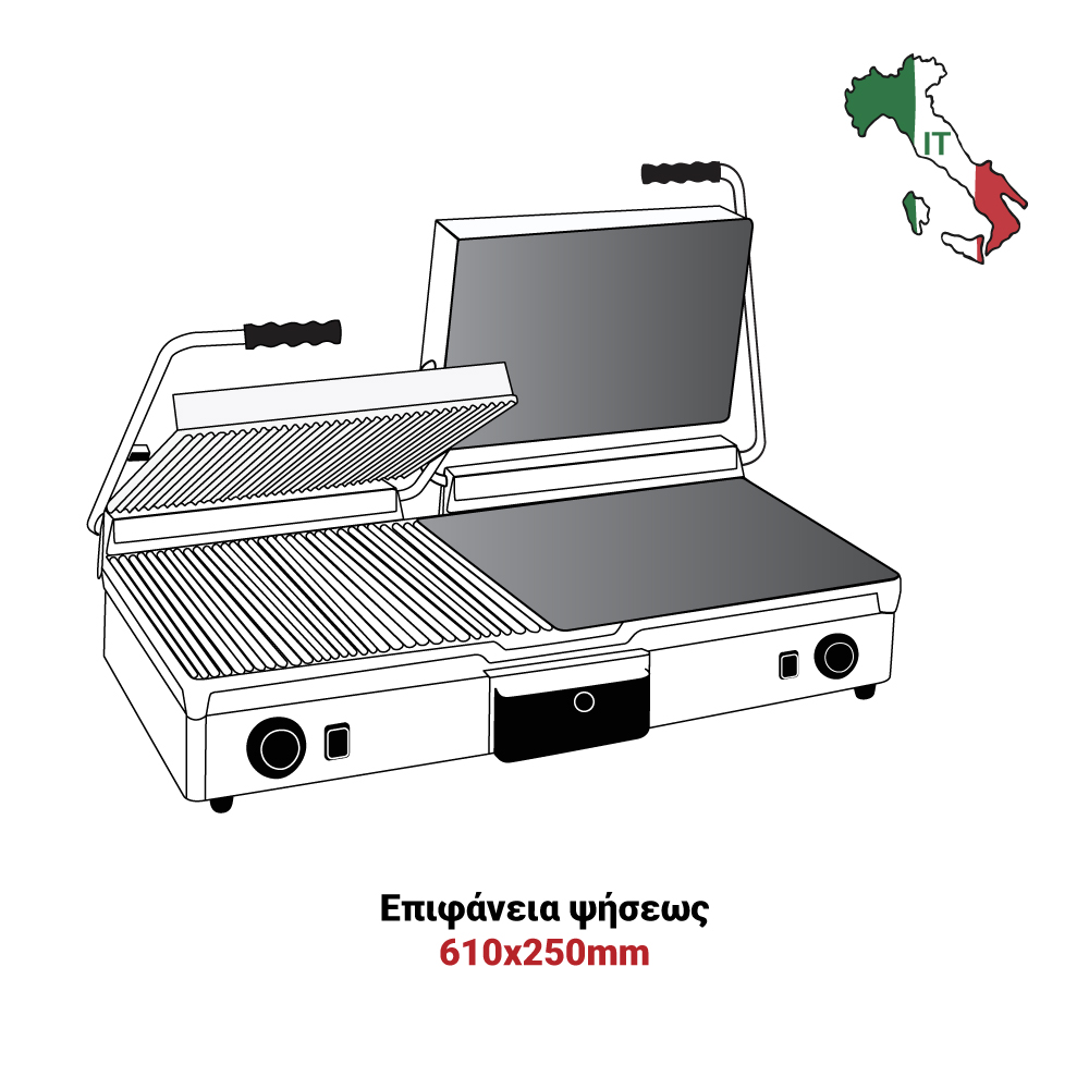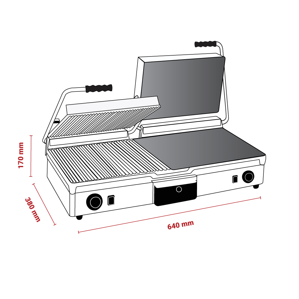 Διαστάσεις 640x380x170(h)mm Επιφάνεια ψήσεως 610x250mm Ισχύς 3,5 KWatt, 230V / 50Hz Θερμοστάτης 50 / 300oC Αντιστάσεις ανοξείδωτες μεγάλης αντοχής Ανοξείδωτο περίβλημα Αποσπώμενο συρτάρι / λιποσυλλέκτης Εργονομικοί διακόπτες