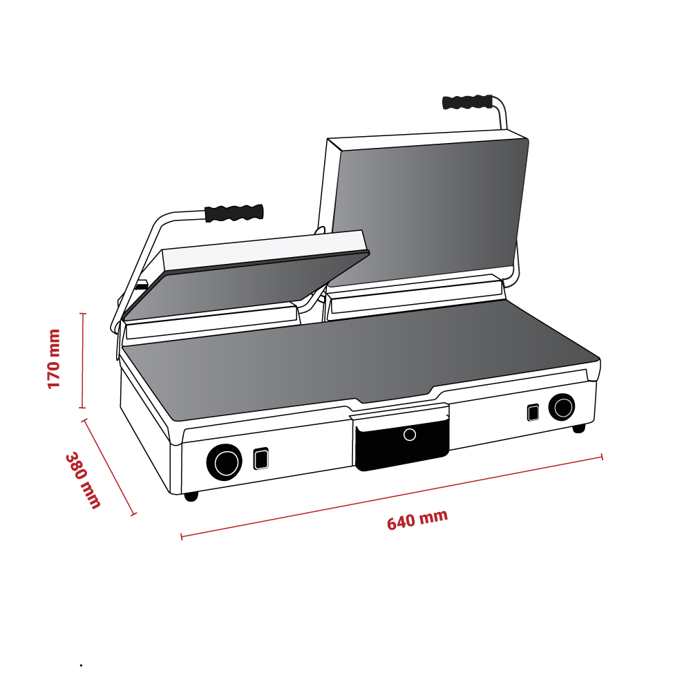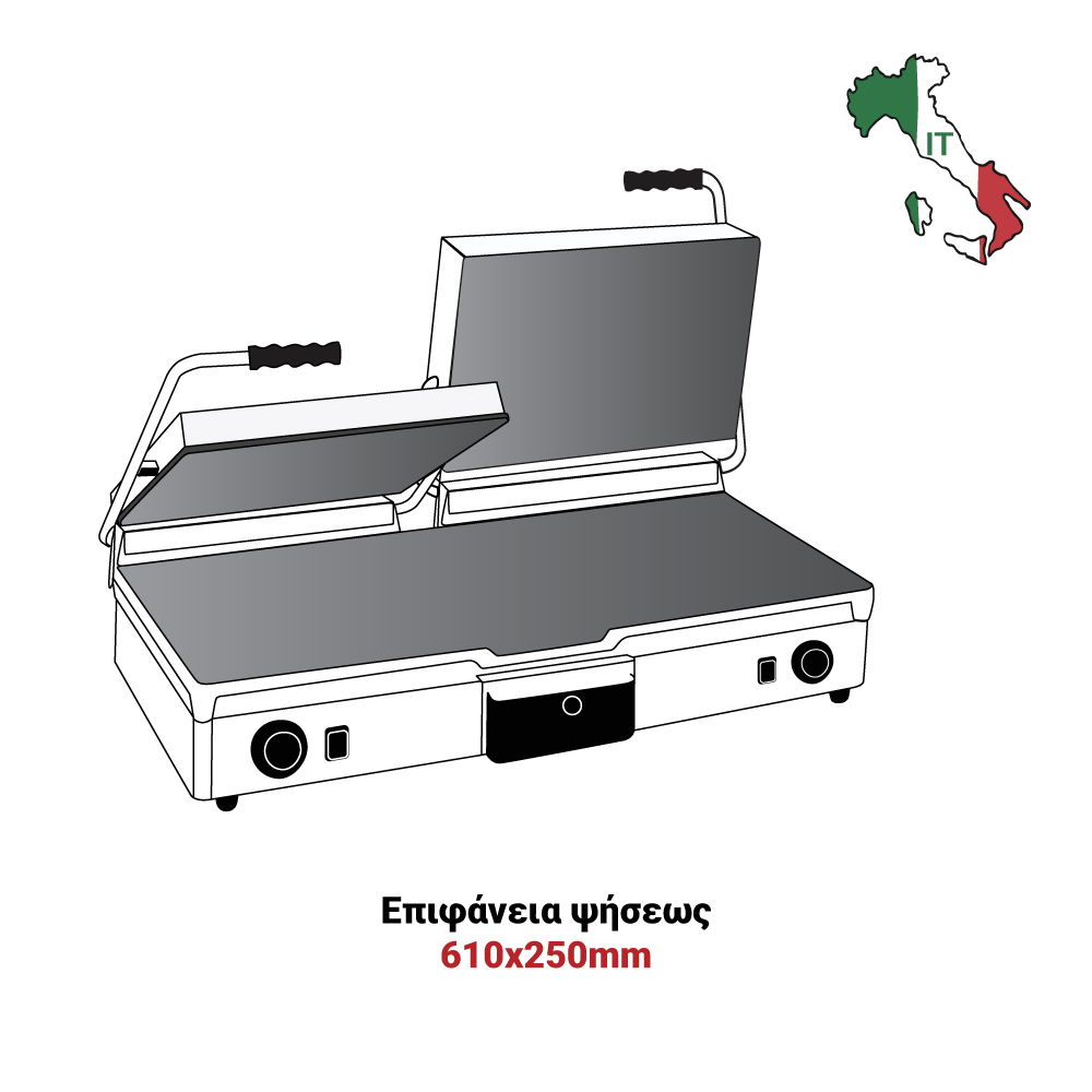 Διαστάσεις 640x380x170(h)mm Επιφάνεια ψήσεως 610x250mm Ισχύς 3,5 KWatt, 230V / 50Hz Θερμοστάτης 50 / 300oC Αντιστάσεις ανοξείδωτες μεγάλης αντοχής Ανοξείδωτο περίβλημα Αποσπώμενο συρτάρι / λιποσυλλέκτης Εργονομικοί διακόπτες