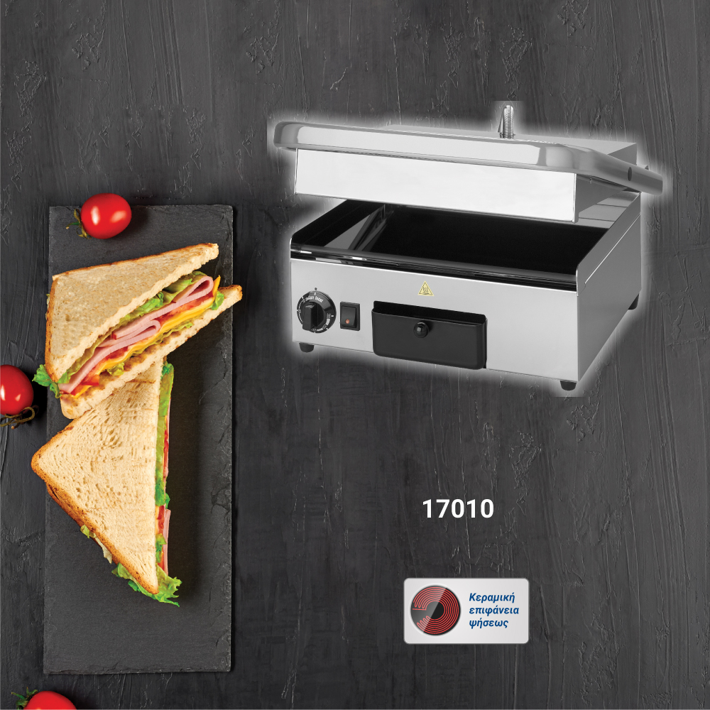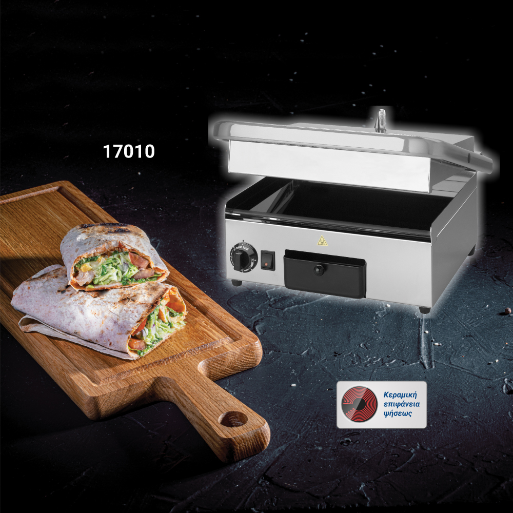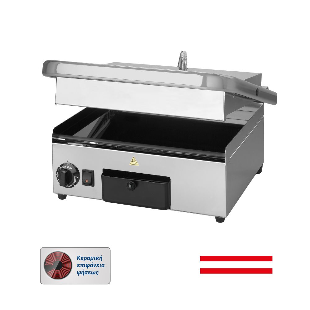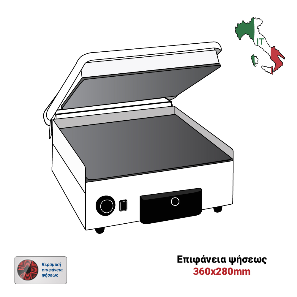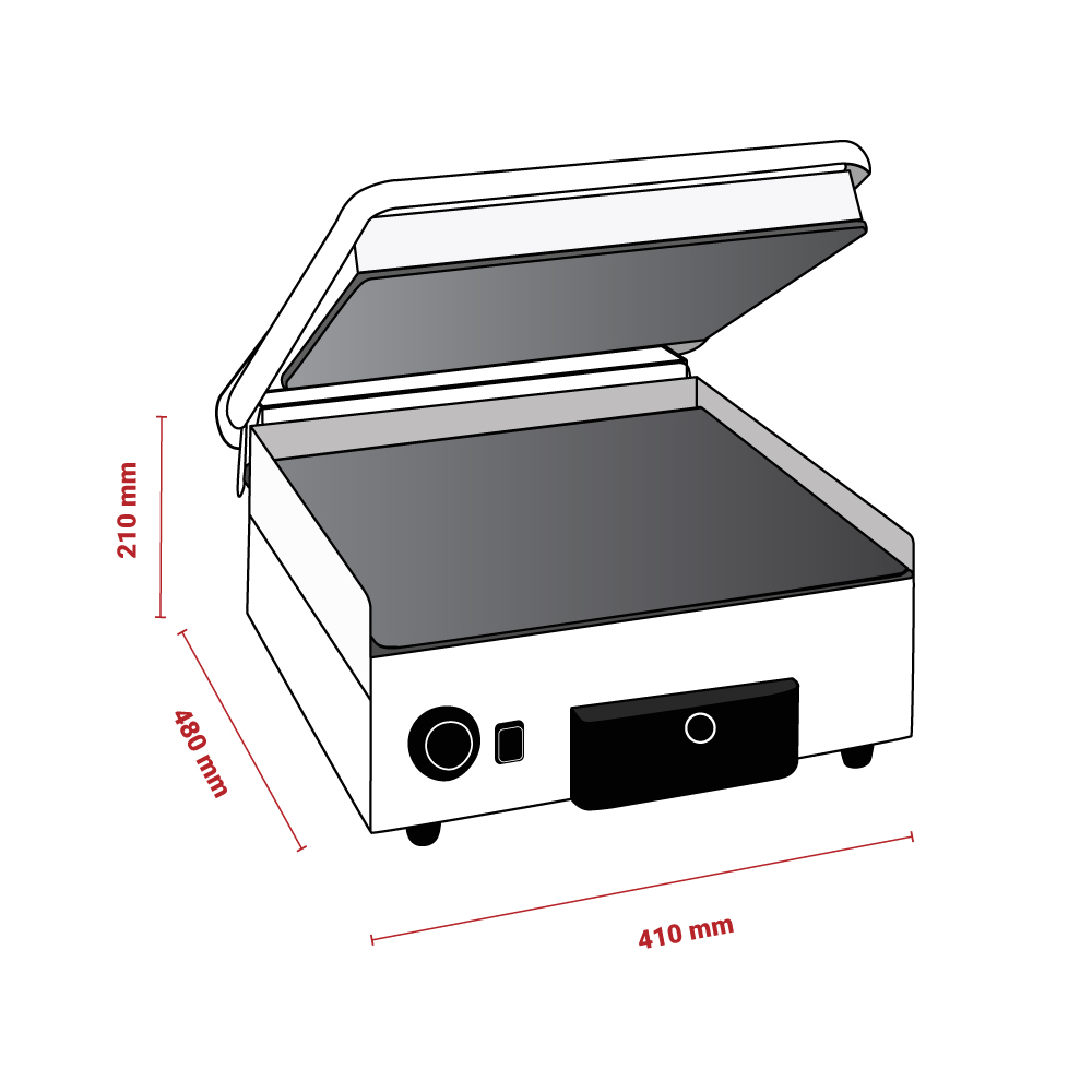 Διαστάσεις 410x480x210(h)mm Επιφάνεια ψήσεως 360x280mm Ισχύς 2 KWatt, 230V / 50-60Hz Θερμοστάτης 50 / 300oC Αντιστάσεις ανοξείδωτες μεγάλης αντοχής Ανοξείδωτο περίβλημα Αποσπώμενο συρτάρι / λιποσυλλέκτης Εργονομικοί διακόπτες