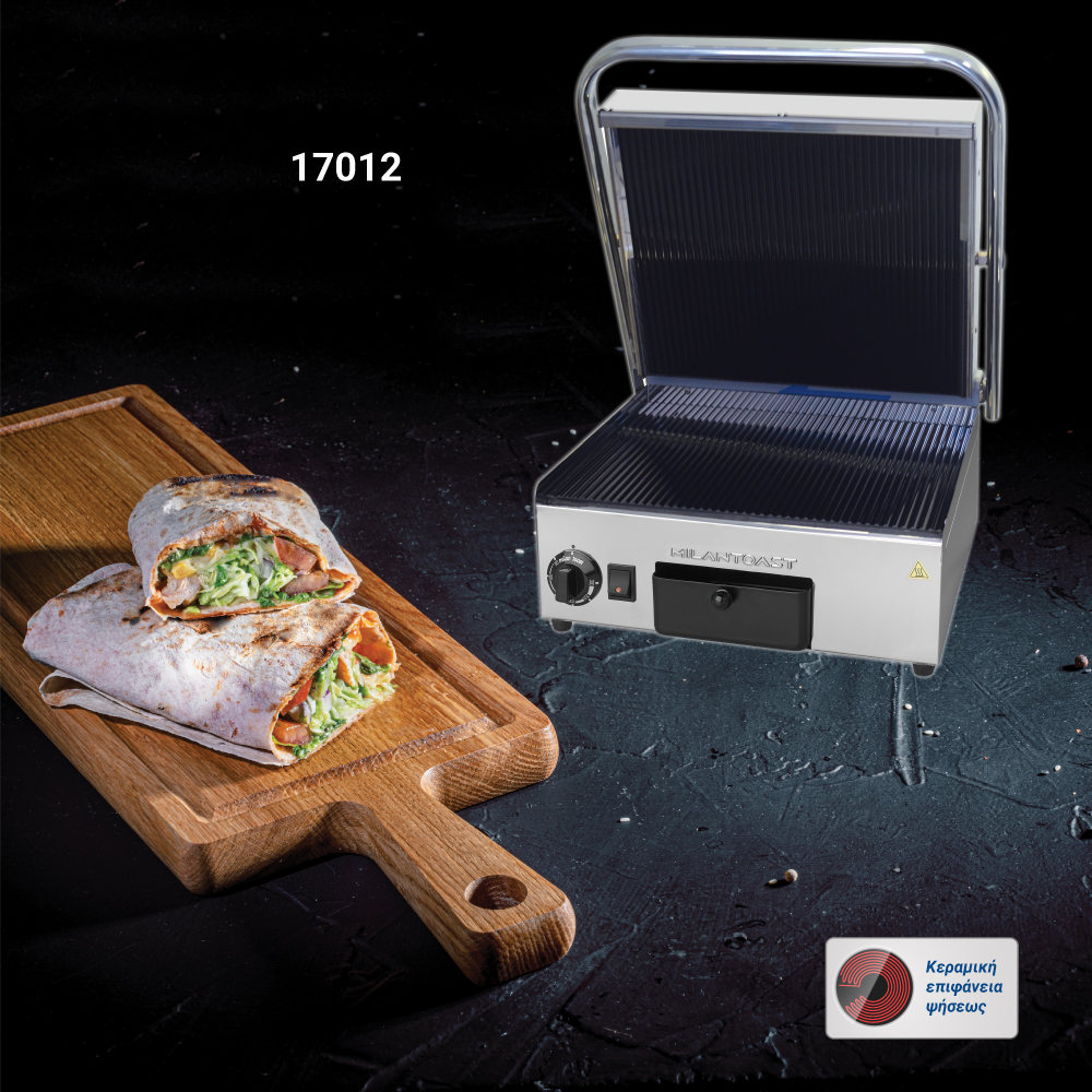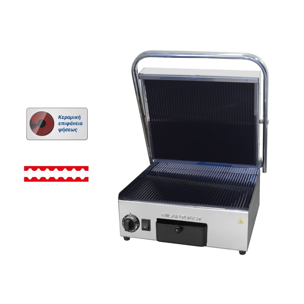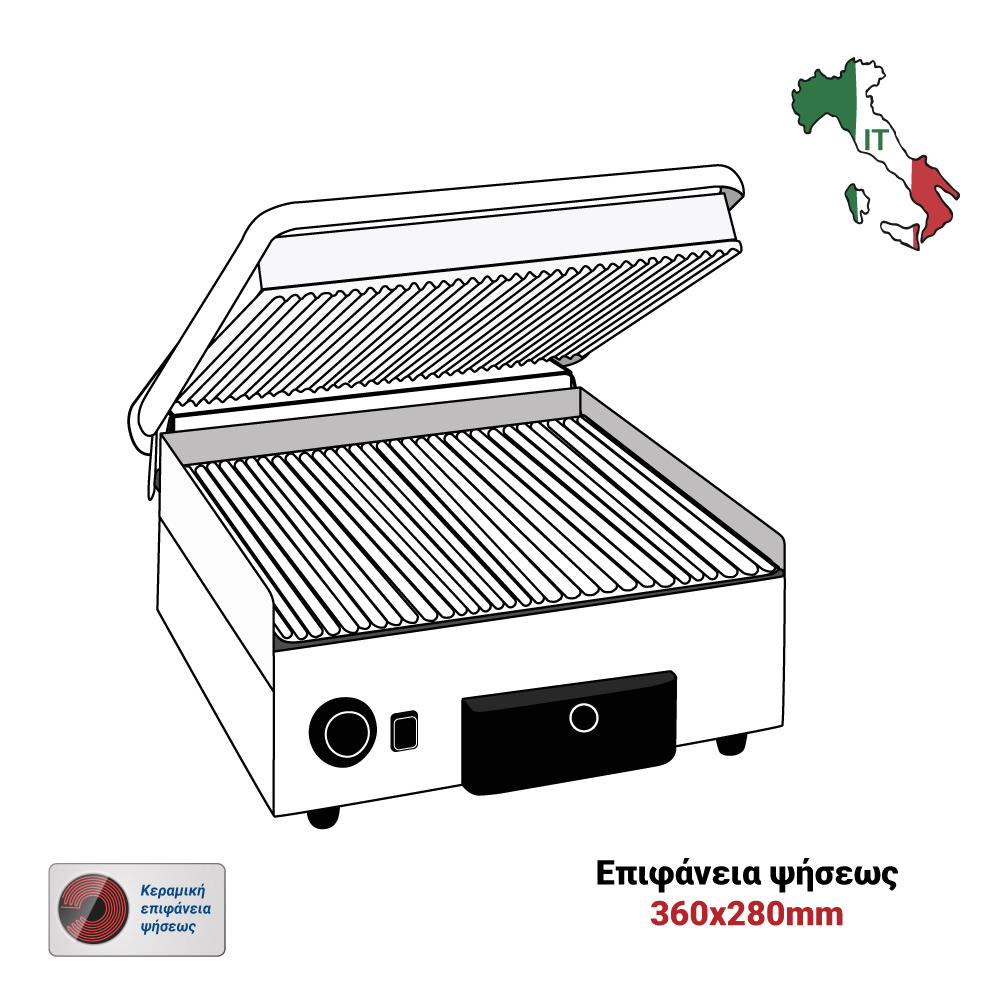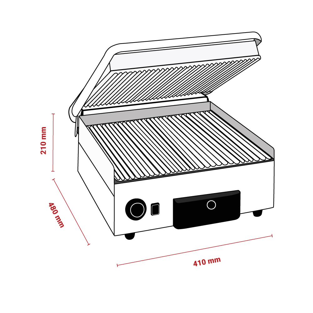 Διαστάσεις 410x480x210(h)mm Επιφάνεια ψήσεως 360x280mm Ισχύς 2 KWatt, 230V / 50Hz Θερμοστάτης 50 / 300oC Αντιστάσεις ανοξείδωτες μεγάλης αντοχής Ανοξείδωτο περίβλημα Αποσπώμενο συρτάρι / λιποσυλλέκτης Εργονομικοί διακόπτες