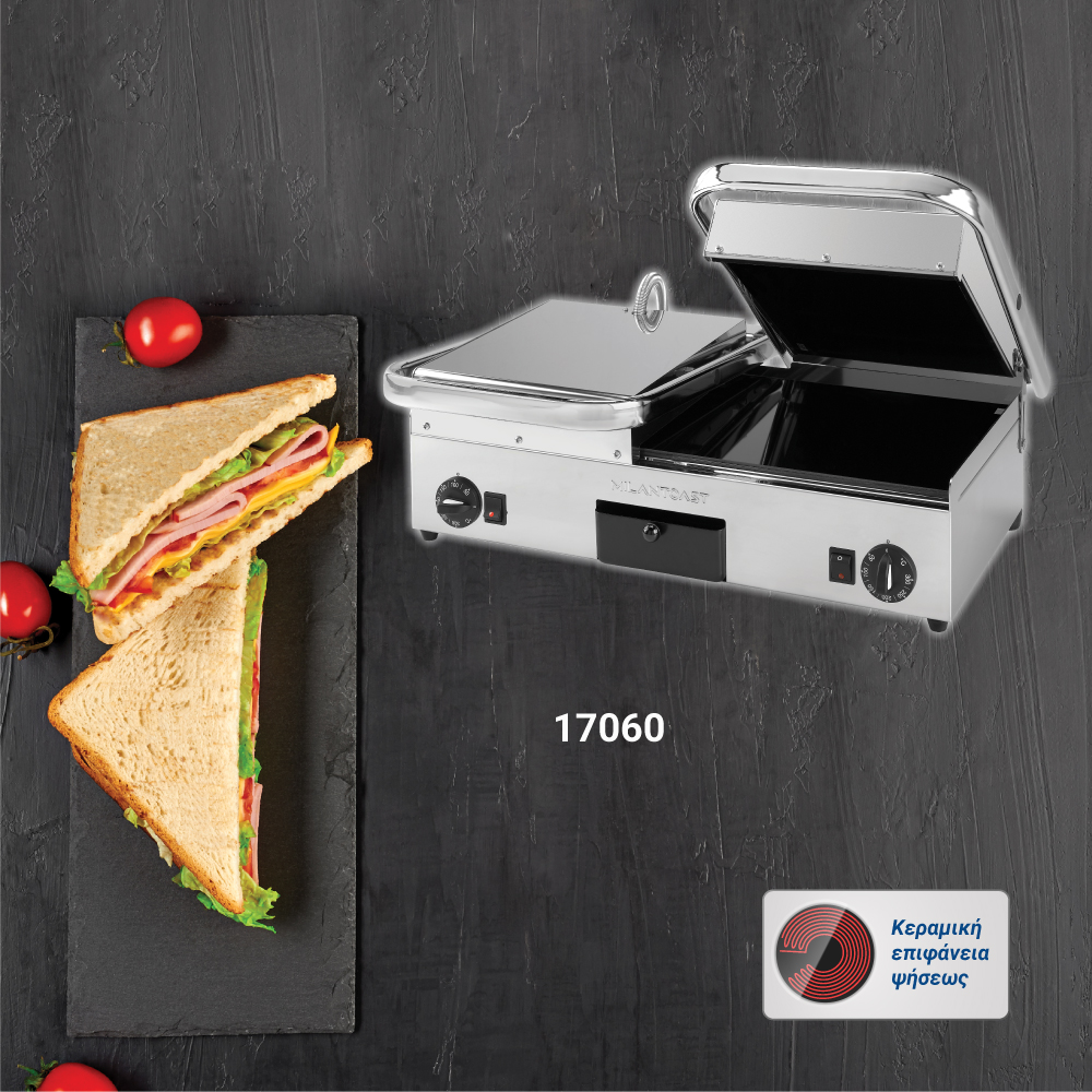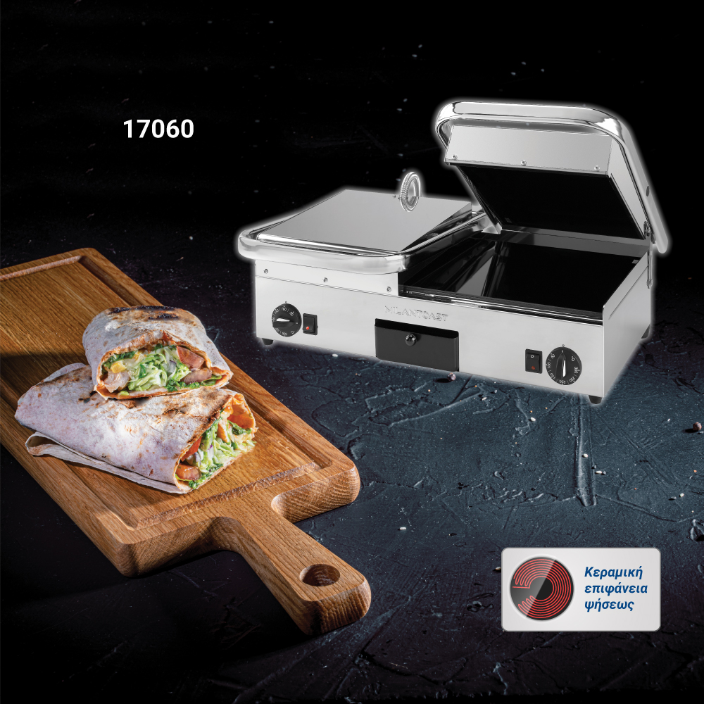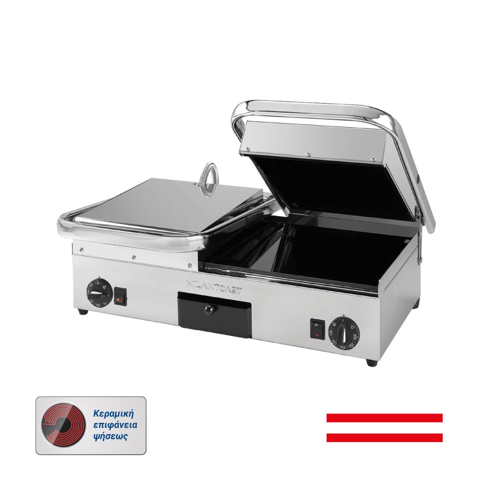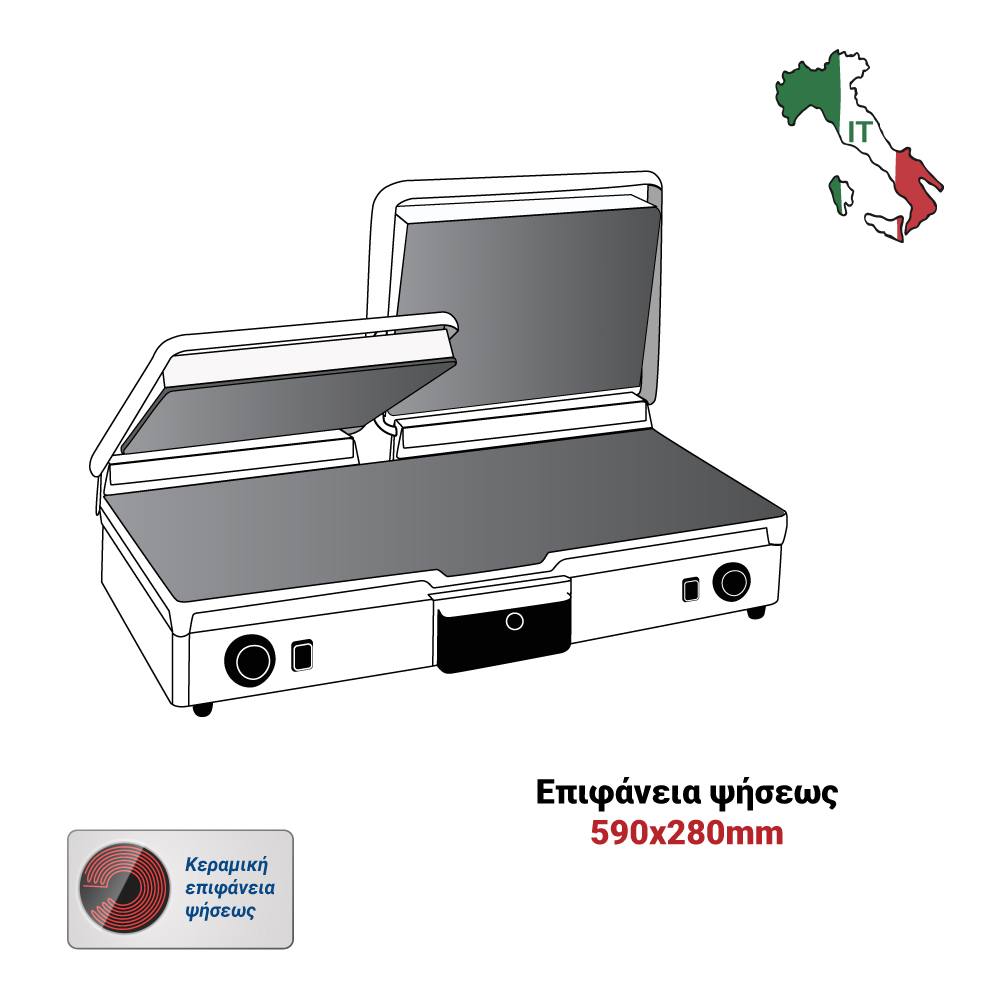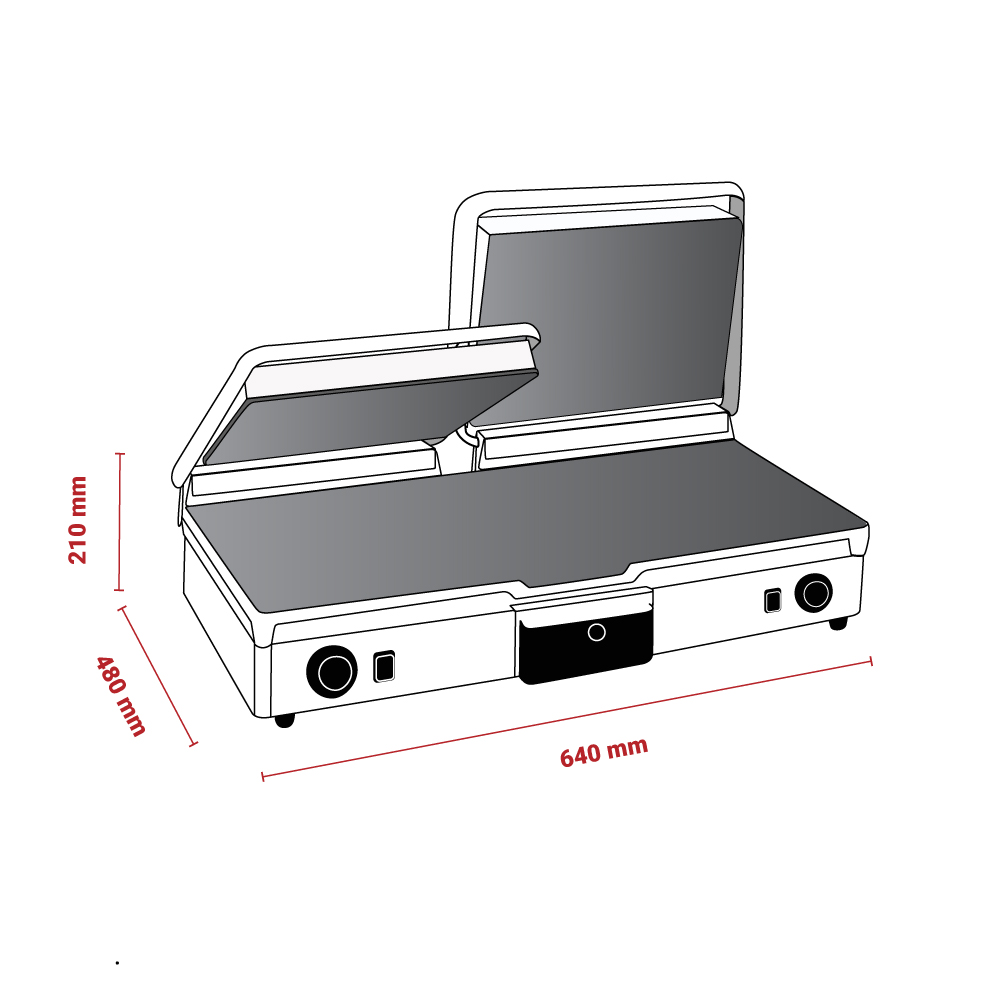 Διαστάσεις 640x480x210(h)mm Επιφάνεια ψήσεως 590x280mm Ισχύς 3 KWatt, 230V / 50Hz Θερμοστάτης 50 / 300oC Αντιστάσεις ανοξείδωτες μεγάλης αντοχής Ανοξείδωτο περίβλημα Αποσπώμενο συρτάρι / λιποσυλλέκτης Εργονομικοί διακόπτες