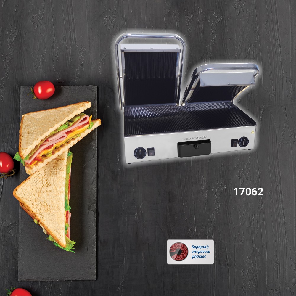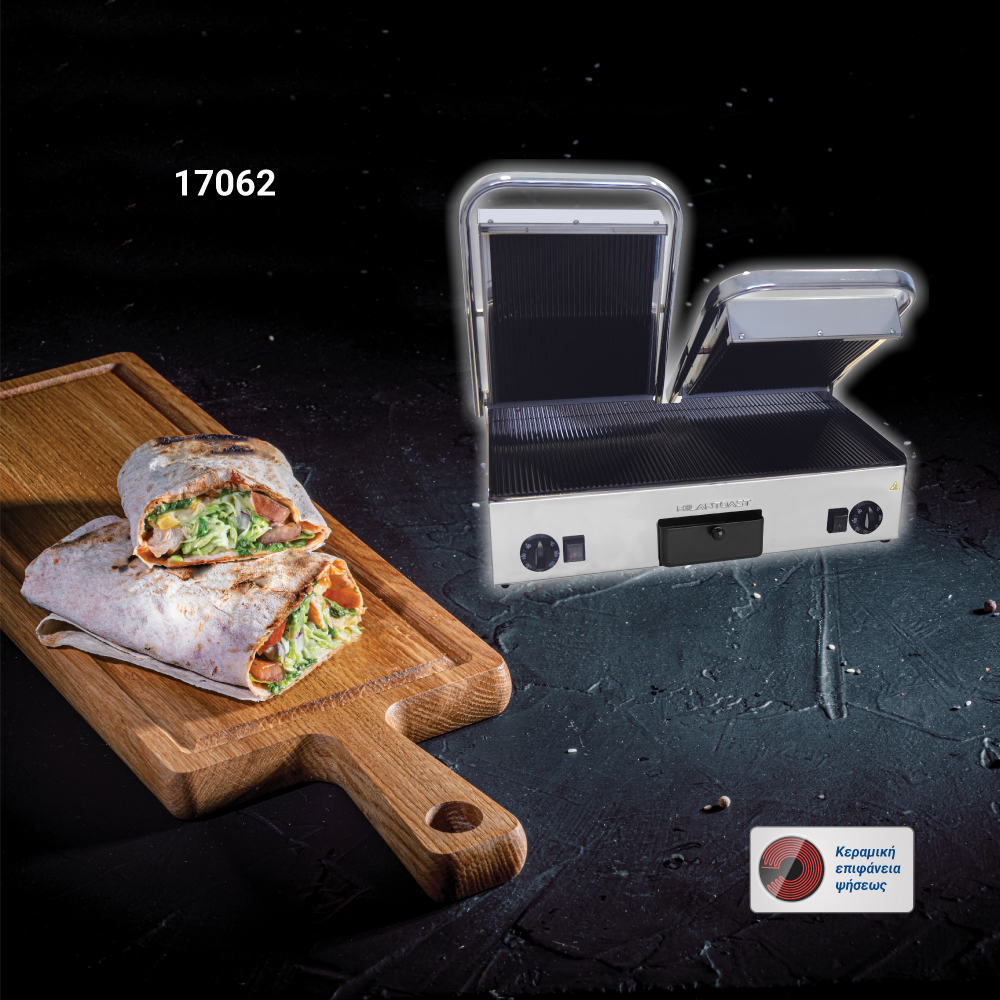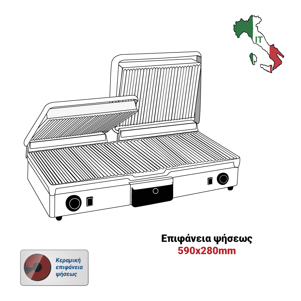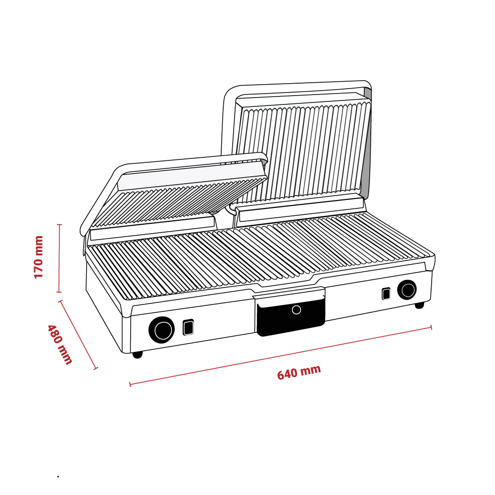 Διαστάσεις 640x480x170(h)mm Επιφάνεια ψήσεως 590x280mm Ισχύς 3 KWatt, 230V / 50Hz Θερμοστάτης 50 / 300oC Αντιστάσεις ανοξείδωτες μεγάλης αντοχής Ανοξείδωτο περίβλημα Αποσπώμενο συρτάρι / λιποσυλλέκτης Εργονομικοί διακόπτες