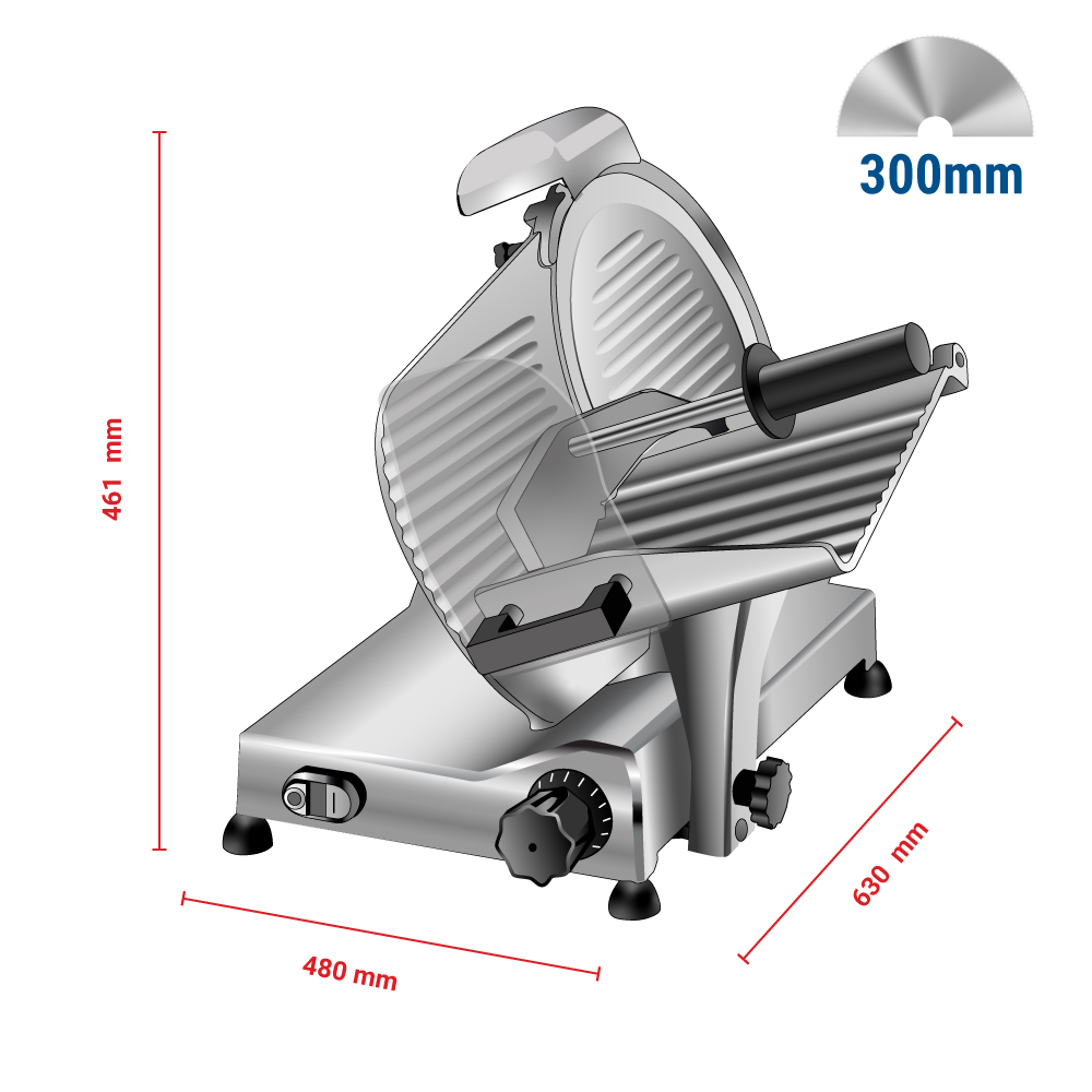 Διαστάσεις 480x630x461(h)mm Διάμετρος λάμας Ø 300 mm Μήκος κοπής 230 mm Πάχος κοπής 1 έως 15 mm Ύψος κοπής 175 mm Ισχύς 200 Watt , 230V / 50Hz Βάρος 20,8 Kg Κωδικός προϊόντος 174301 Υλικό : Αλουμίνιο Διακόπτης : On/Off Οδηγός κοπής σε φέτες Ακονιστής μαχαιριού Συμπεριλαμβάνονται 1 μαχαίρι 300 Basic & εργαλείο για την αντικατάσταση μαχαιριού.