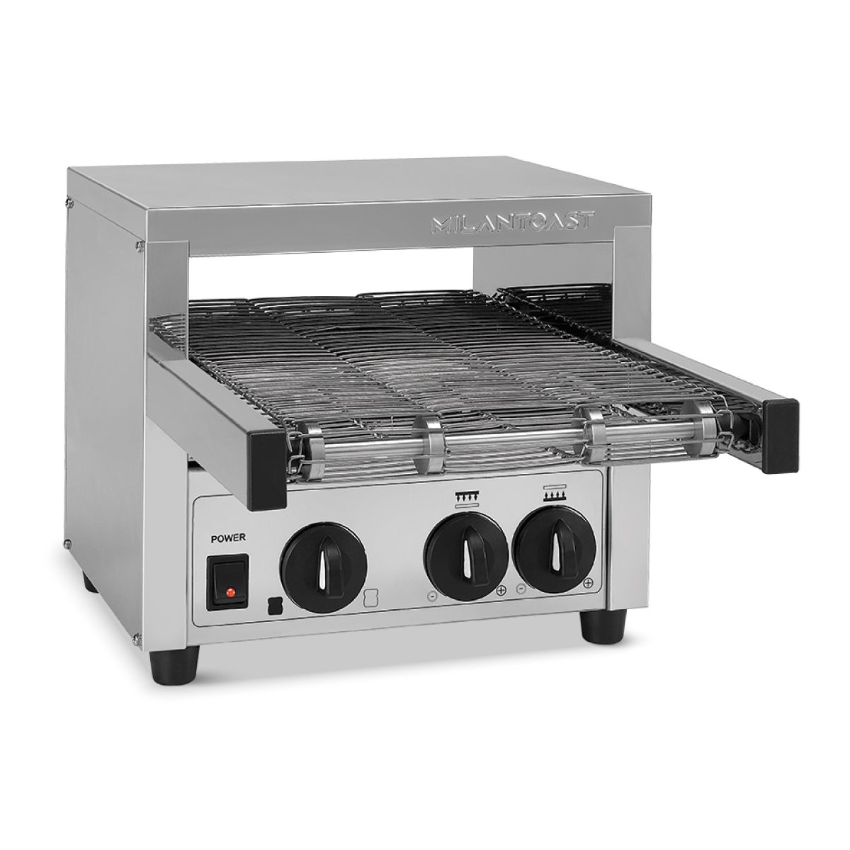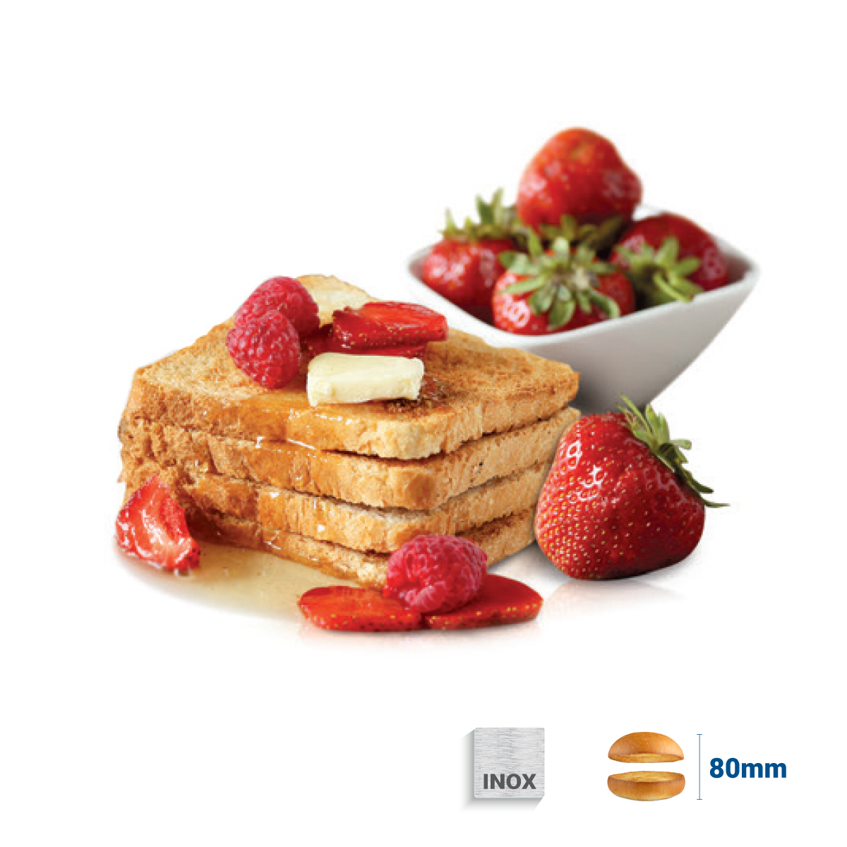 Διαστάσεις 330x460x290(h)mm Ισχύς 2,1 ΚWatt, 220-240V / 50Hz Μήκος αλυσίδας 25 cm Χωρητικότητα ταινίας 2 φέτες Παραγωγή/h 600 φέτες Μέγιστο ύψος φόρτωσης 8 cm Έξοδοι Μόνο πίσω Κωδικός προϊόντος 18002 Ξεχωριστή ρύθμιση θερμοκρασίας πάνω & κάτω αντίστασης Ρυθμιζόμενη ταχύτητα «αλυσίδας» Ανοξείδωτες αντιστάσεις Ιδανική για πρωινούς μπουφέδες ξενοδοχείων