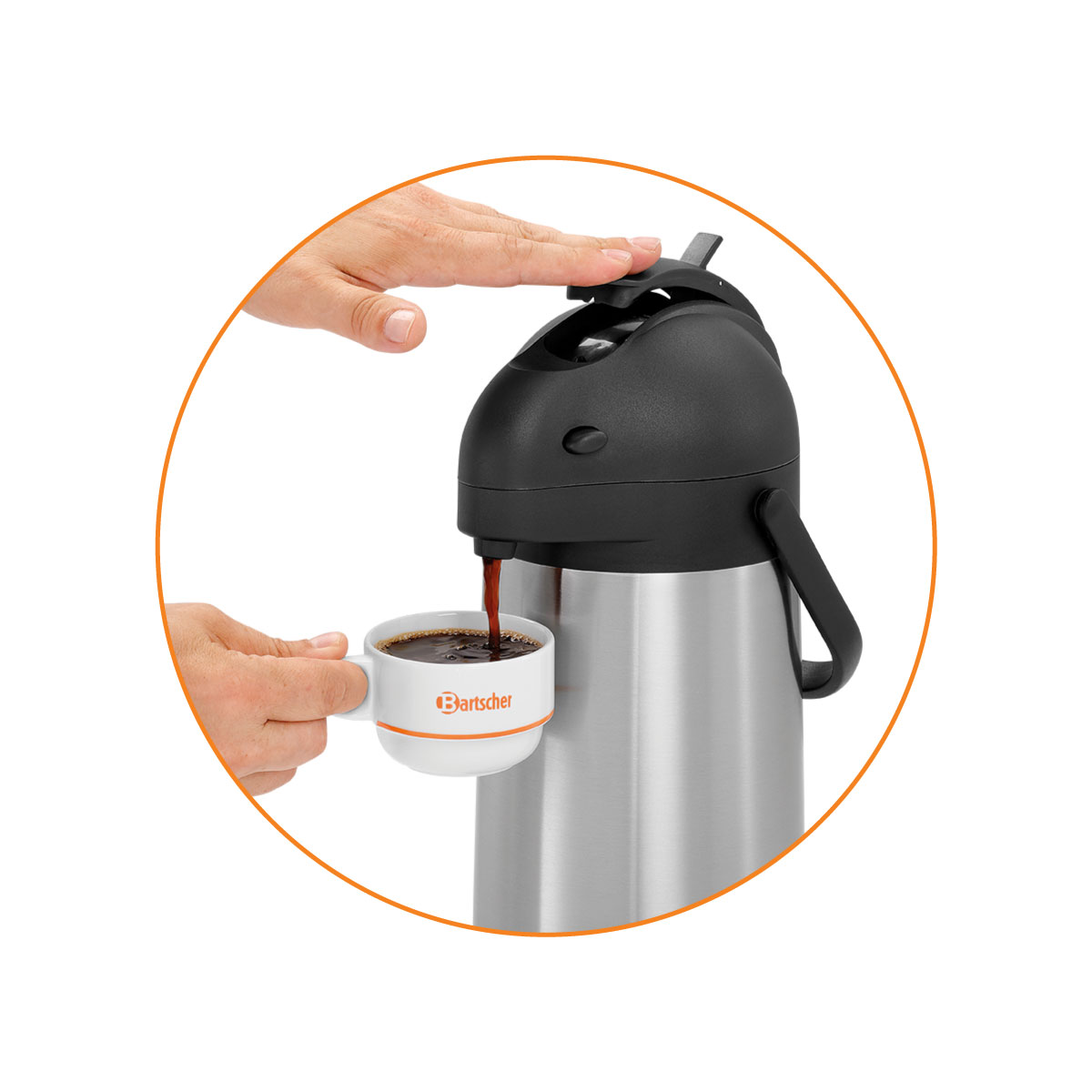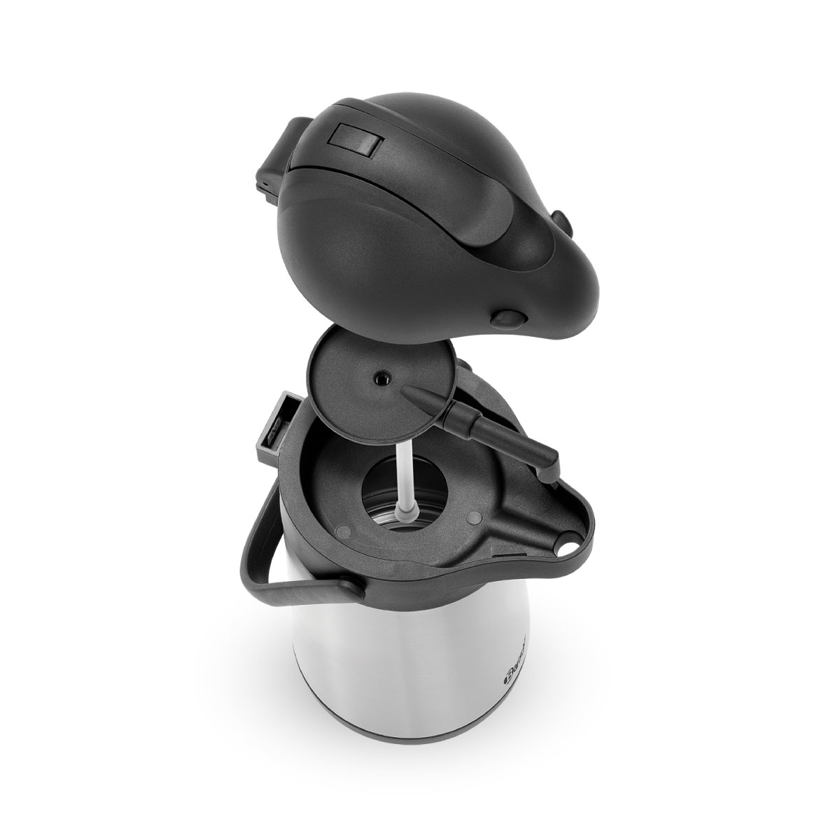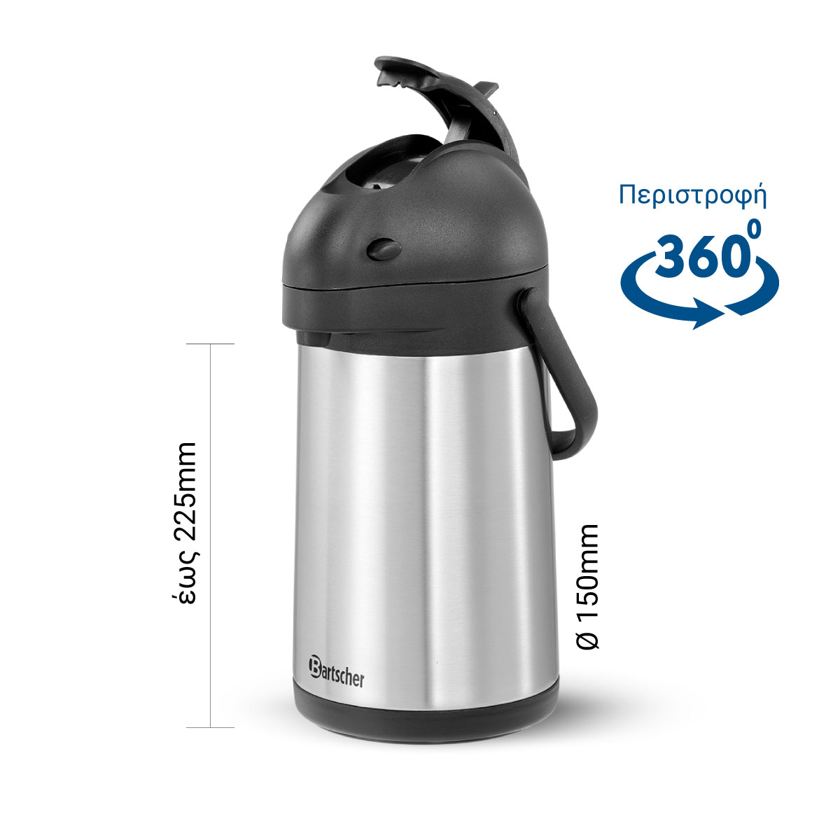 Διαστάσεις 150x200x390(h)mm Διάμετρος επιφάνειας τοποθέτησης Ø150mm Χωρητικότητα 1,9 lt Μέγιστο ύψος ποτηριών/φλιτζανιών 225 mm Υλικό Inox & πλαστικό Βάρος 1,3 kg Διπλά τοιχώματα Πάτος με ενσωματωμένο δακτύλιο για περιστροφή 360º της κανάτας. Κεφαλή αντλίας αποσπώμενη για εύκολη πλήρωση και καθαρισμό. Καπάκι & χειρολαβή πλαστικό. Ακατάλληλο για πλύσιμο σε πλυντήριο πιάτων