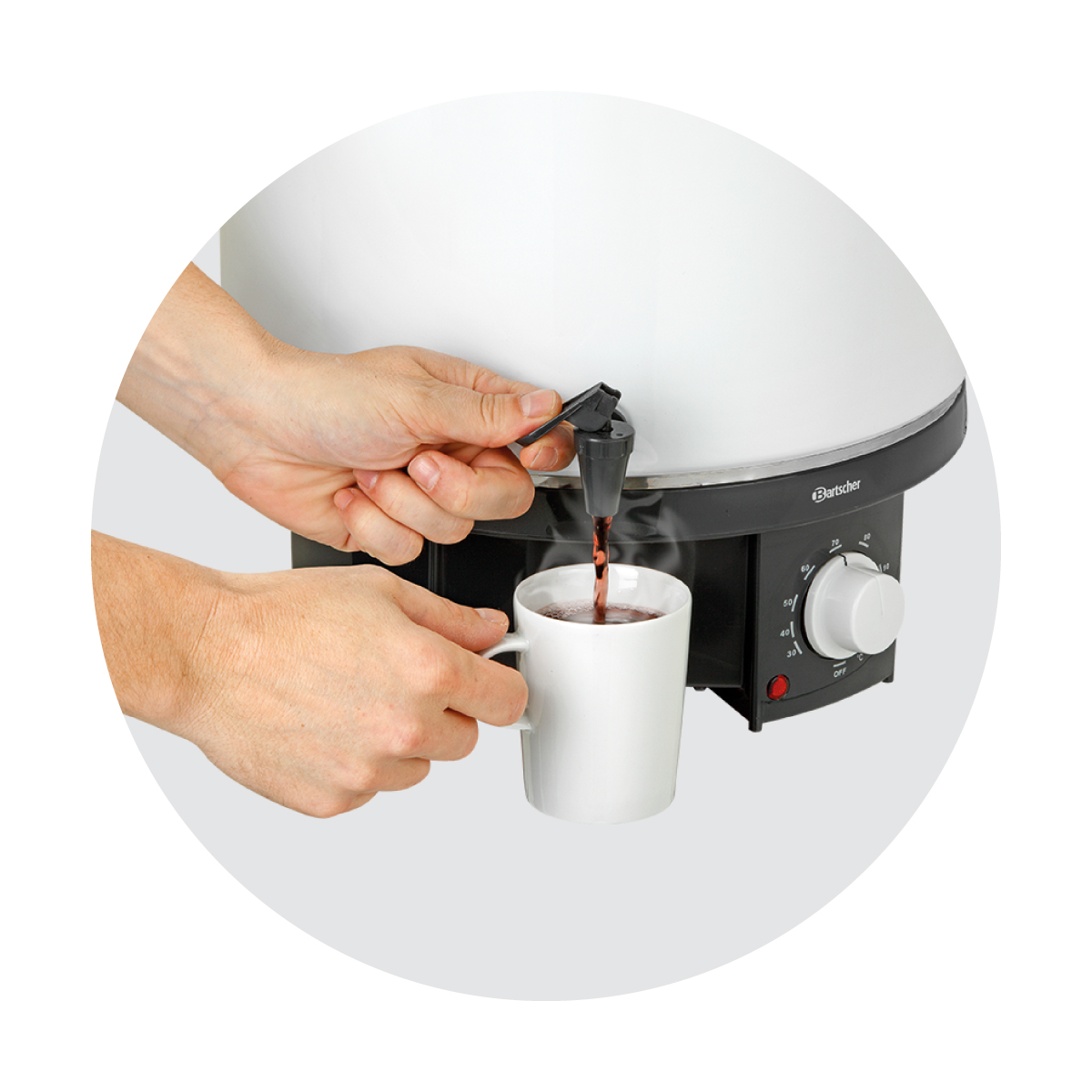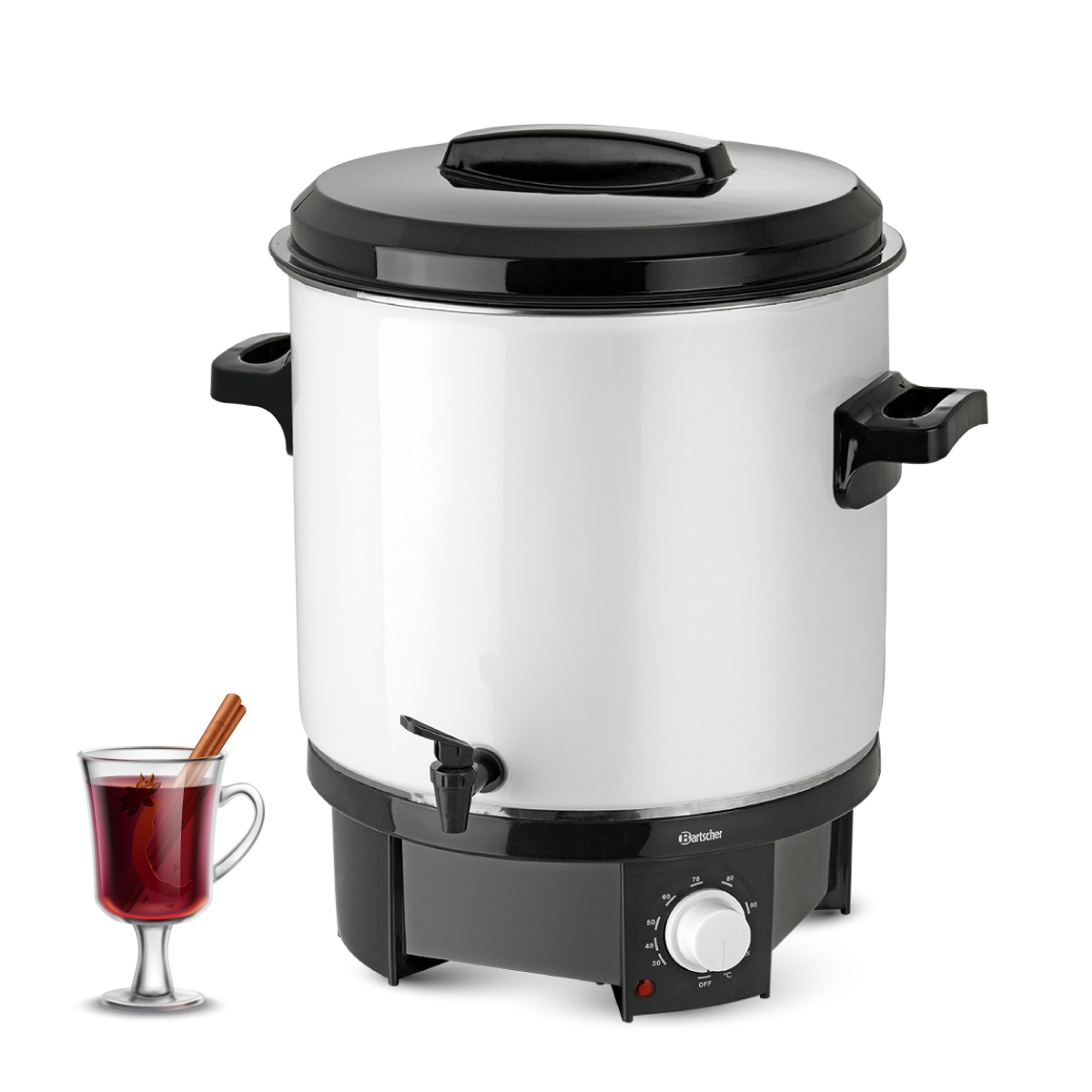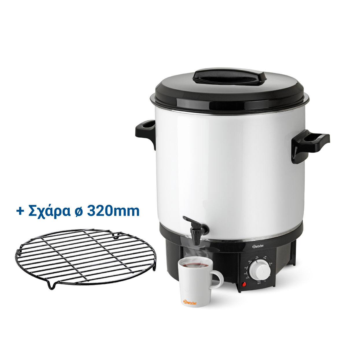 Διαστάσεις 370x370x500(h)mm Θερμοκρασία 30 - 100oC Ισχύς 1.8 ΚWatt, 230V / 50Ηz Χωρητικότητα 21 lt Σχάρα 1 x Ø320mm Βάρος 5.4 kg Κωδικός προϊόντος 200049 Κρουνός, λαβές και καπάκι από πλαστικό