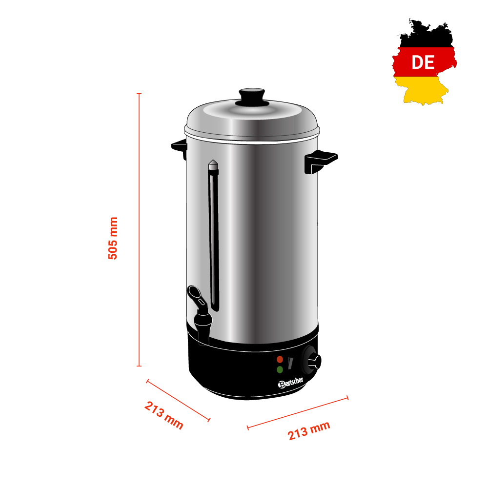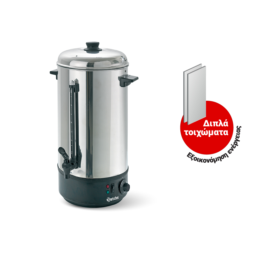 Διαστάσεις 213x213x505(h)mm Θερμοκρασία 30 - 100oC Ισχύς 2.5 ΚWatt, 230V / 50Ηz Χωρητικότητα 10 lt Βάρος 2.3 kg Κωδικός προϊόντος 200054 Inox σώμα και καπάκι, βάση από πλαστικό Δείκτης πλήρωσης