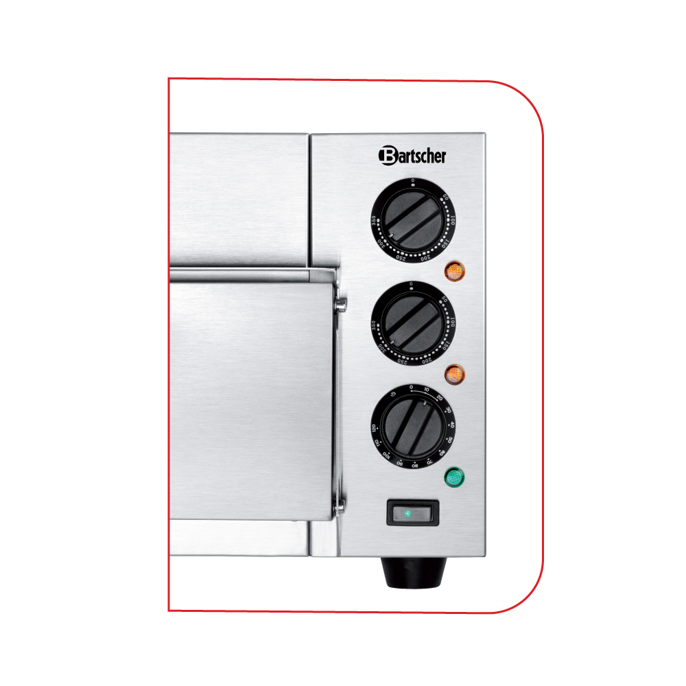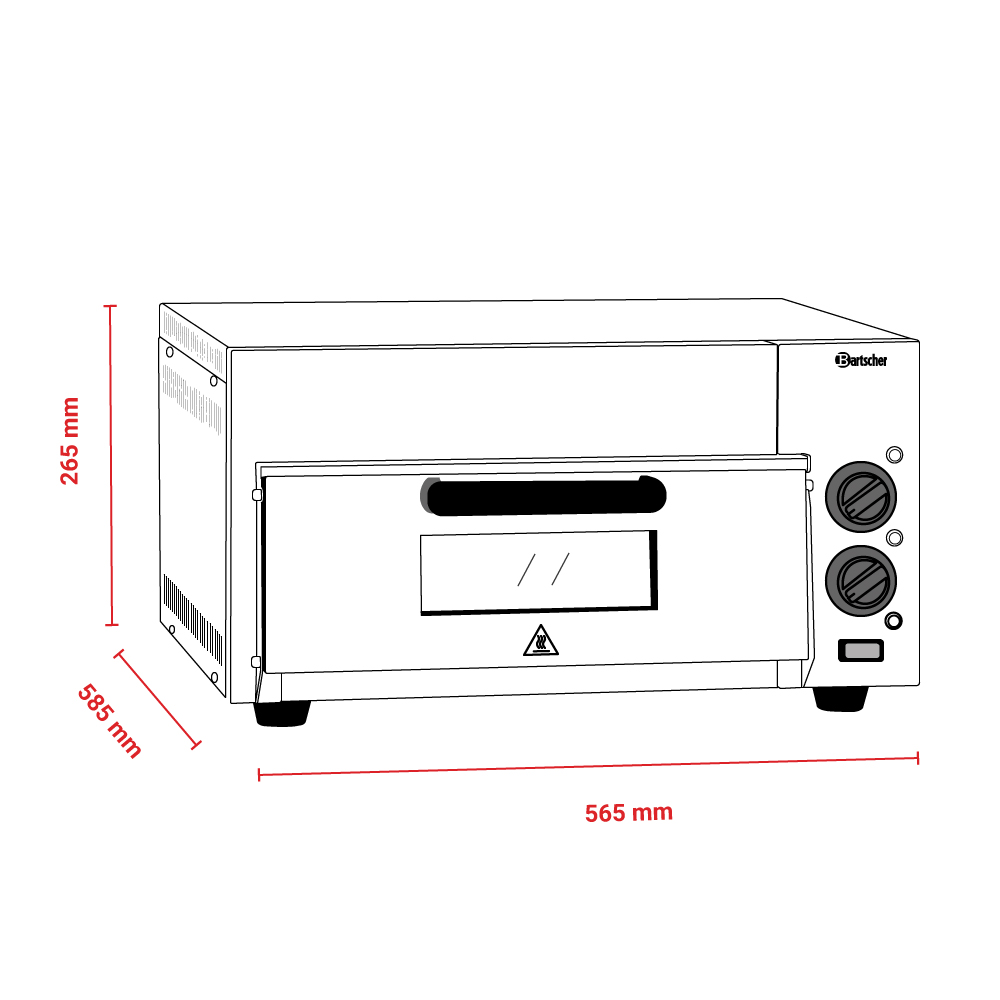 Διαστάσεις 565x585x265(h)mm Διαστάσεις θαλάμου 415x410x120(h)mm Ισχύς 2000 Watt, 230V / 50Hz Θερμοκρασία 50ºC - 350ºC Χρονοδιακόπτης 0-120 min Χρόνος θέρμανσης 10 min Διάμετρος πίτσας Ø 40cm Βάρος 20 kg Κωδικός προμηθευτή 2002102 Πάνω κάτω θερμανση (ξεχωριστή ρύθμιση) Εσωτερικός φωτισμός