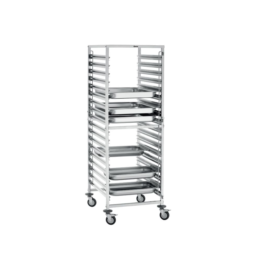 Καρότσι μεταφοράς προτύπων εστίασης (AGN1800-2/1) , χωρητικότητας 18 λαμαρινών GN2/1 ή GN 1/1 , Bartscher Γερμανίας. Με ασφάλεια δοχείων και από τις δύο πλευρές διασφαλίζεται γρήγορη και ασφαλής μεταφορά ή τακτοποίηση GN.