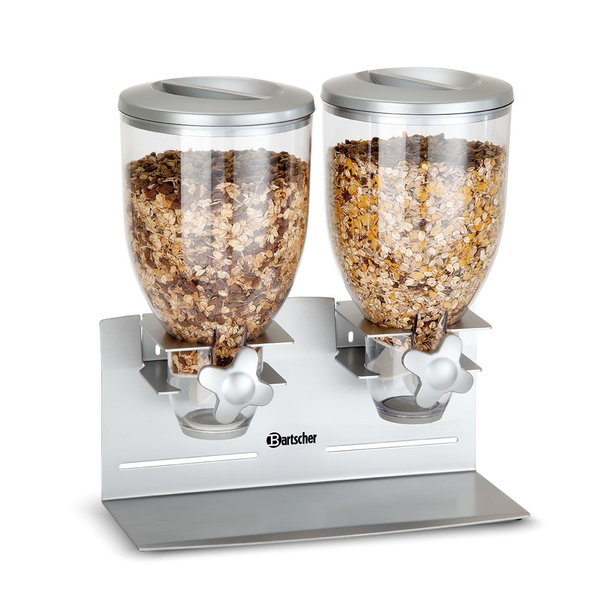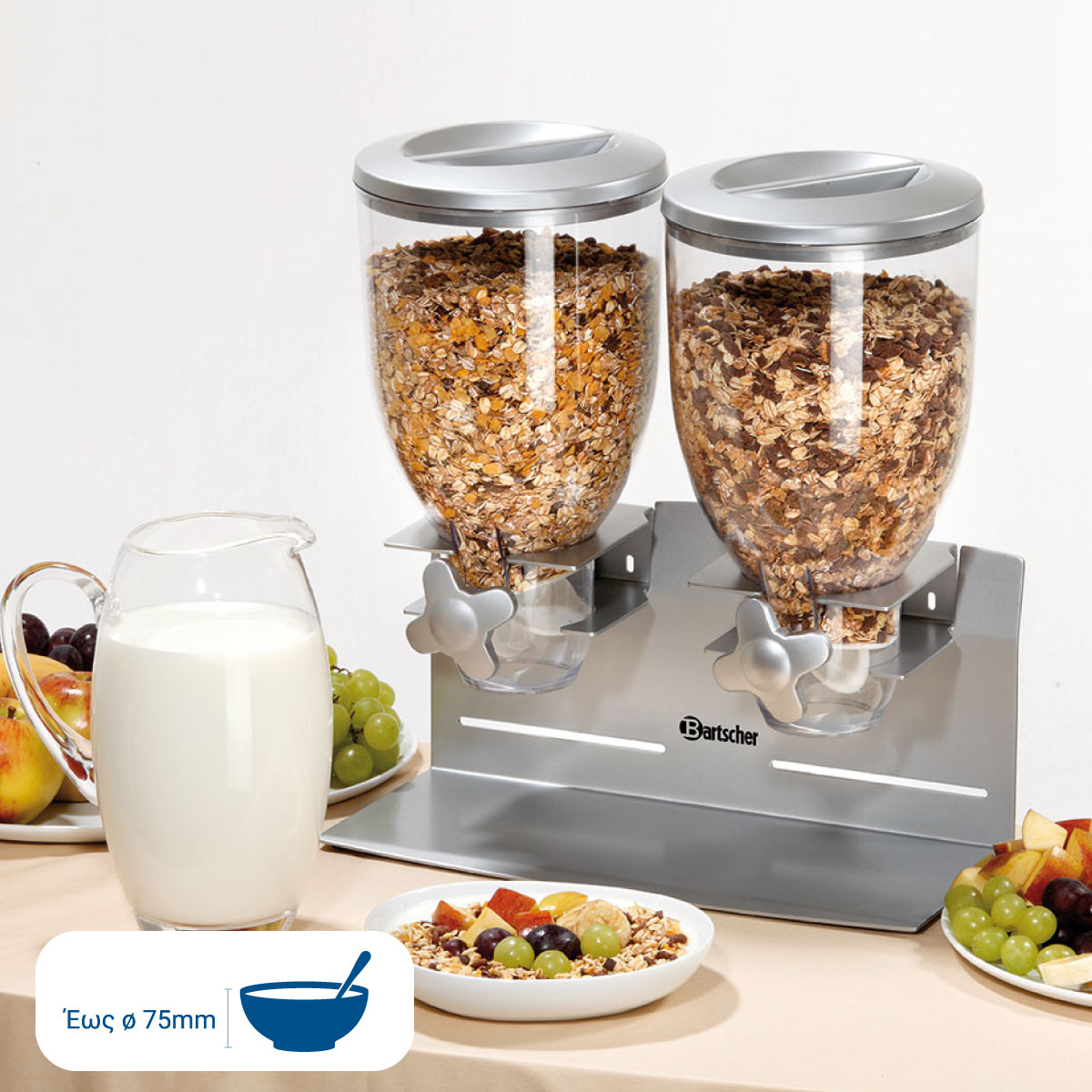 Διαστάσεις 360x170x395(h)mm Χωρητικότητα 2 x 3,5 lt Μέγιστο ύψος σκεύους 7,5 cm Βάρος 3.7 Kg Κωδικός προϊόντος 500378 Με δοσομετρητή Κατασκευή Inox Δοχείο ανθεκτικό σε γρατζουνιές Κατάλληλο για επιτοίχια τοποθέτηση Έχει κατασκευαστεί για δημητριακά ,κορν φλέικς , μούσλι ,ξηρούς καρπούς Δεν συμπεριλαμβάνεται μηχανισμός στερέωσης.