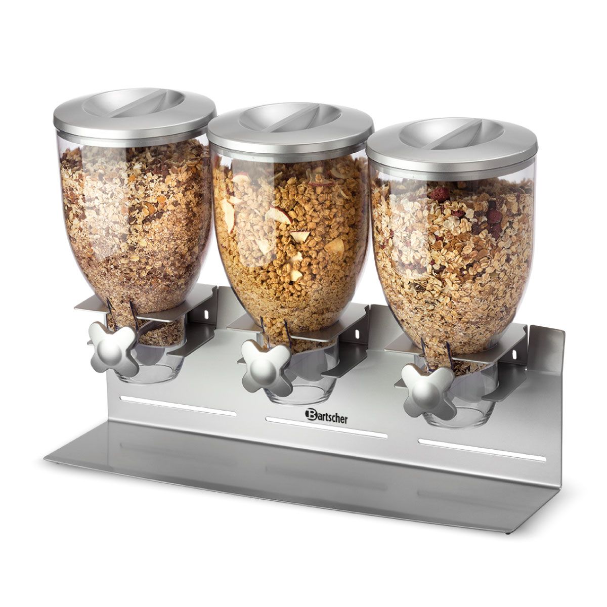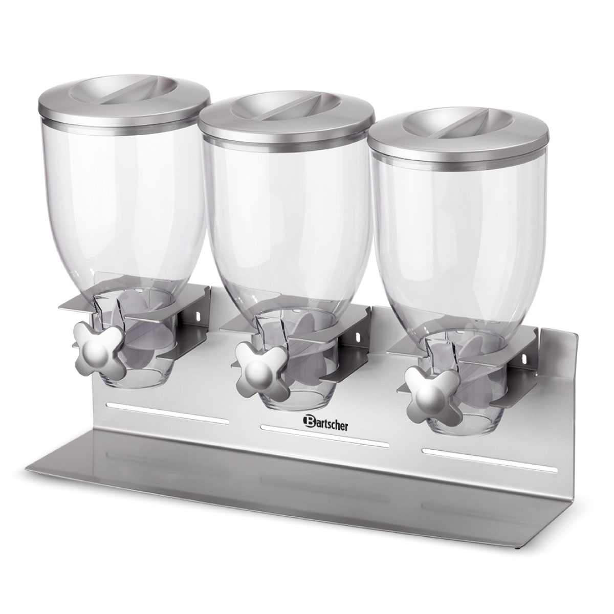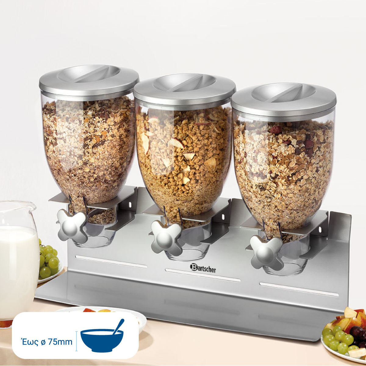 Διαστάσεις 540x170x395(h)mm Χωρητικότητα 3 x 3,5 lt Μέγιστο ύψος σκεύους 7,5 cm Βάρος 5.6 Kg Κωδικός προϊόντος 500379 Με δοσομετρητή Κατασκευή Inox Δοχείο ανθεκτικό σε γρατζουνιές Κατάλληλο για επιτοίχια τοποθέτηση Έχει κατασκευαστεί για δημητριακά ,κορν φλέικς , μούσλι ,ξηρούς καρπούς Δεν συμπεριλαμβάνεται μηχανισμός στερέωσης.