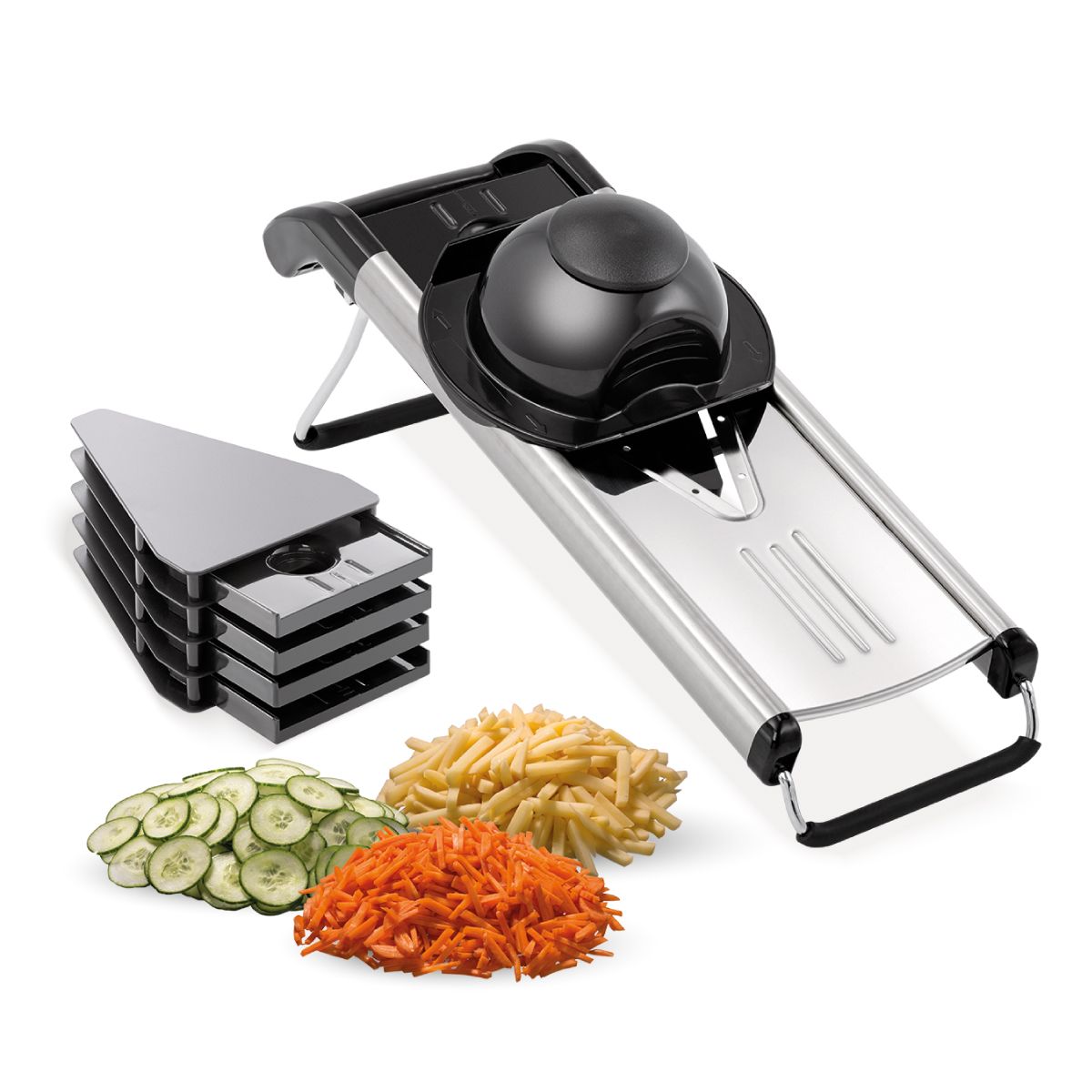Διαστάσεις 400x130x145(h)mm «Μαχαίρια» για φέτες 3 (1,5 - 2,5 - 3,5mm) «Μαχαίρια» για τρίψιμο 2 (3,5 - 7mm) Βάρος 0,93 kg Κωδικός προϊόντος 500393 Θήκη φύλαξης για 4 «μαχαίρια» Αντιολισθητική βάση Κατασκευή CNS18/10 και πλαστικό Τα «μαχαίρια» πλένονται στο πλυντήριο πιάτων Δεν ενδείκνυται για συνεχή και εντατική επαγγελματική χρήση