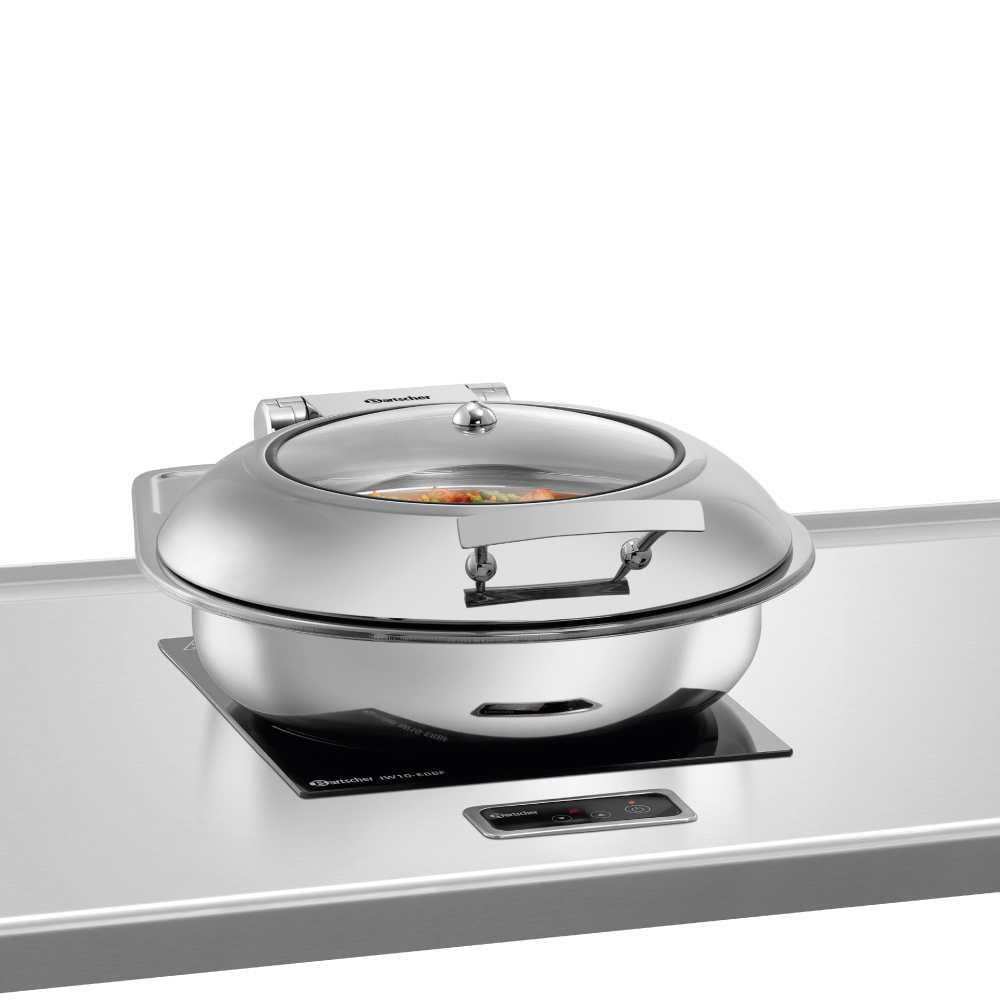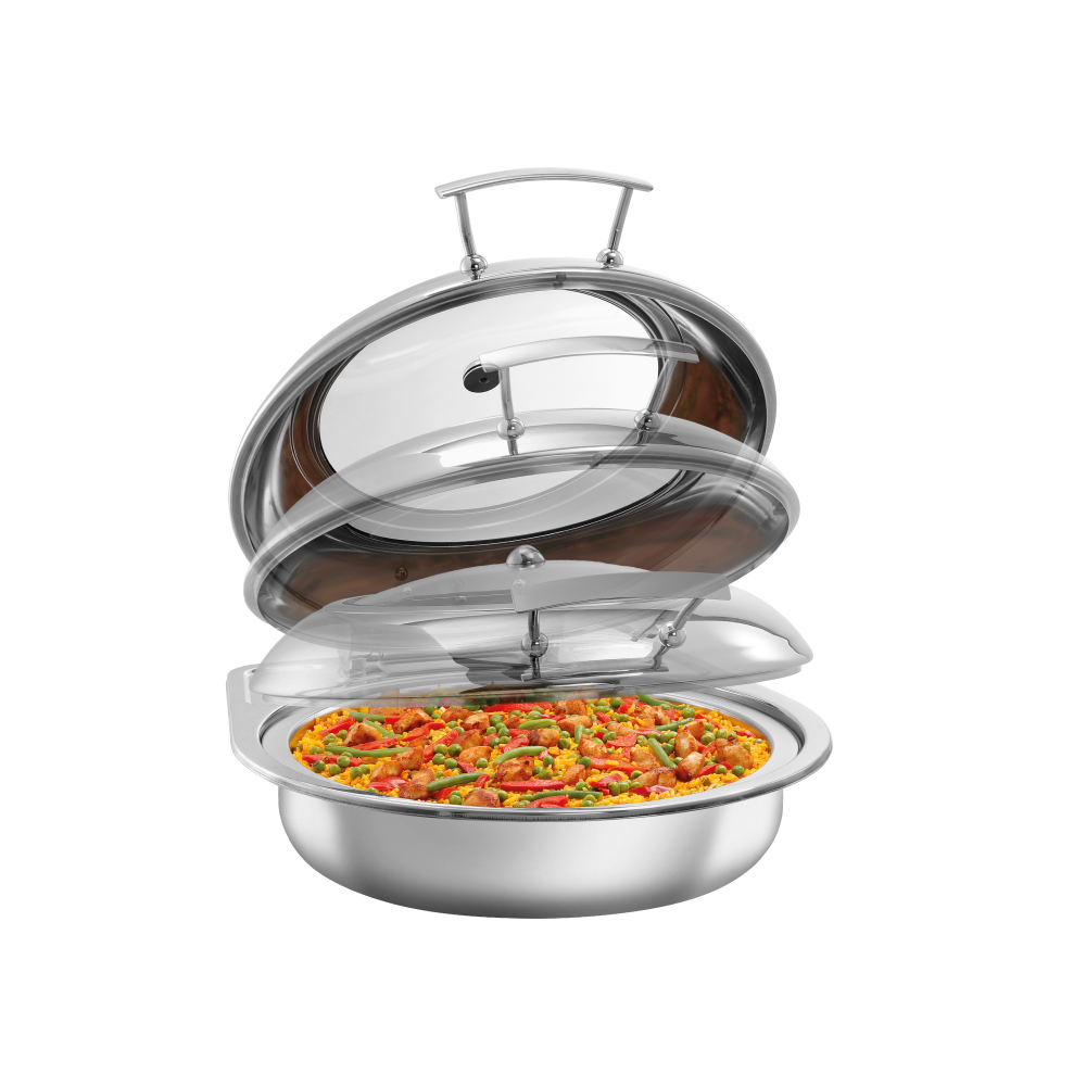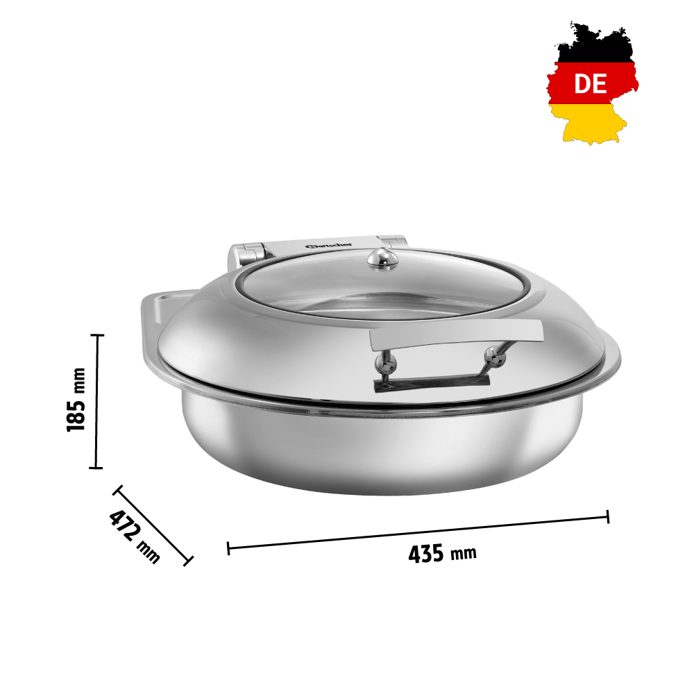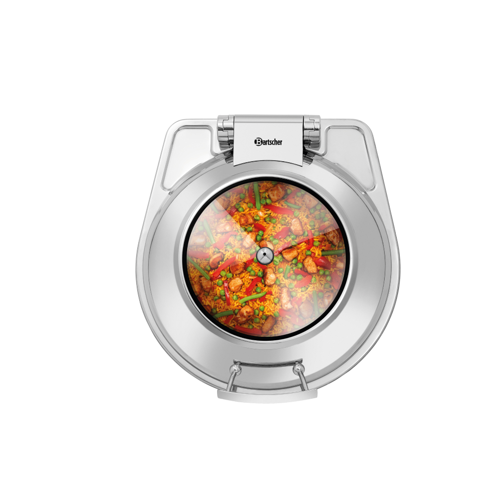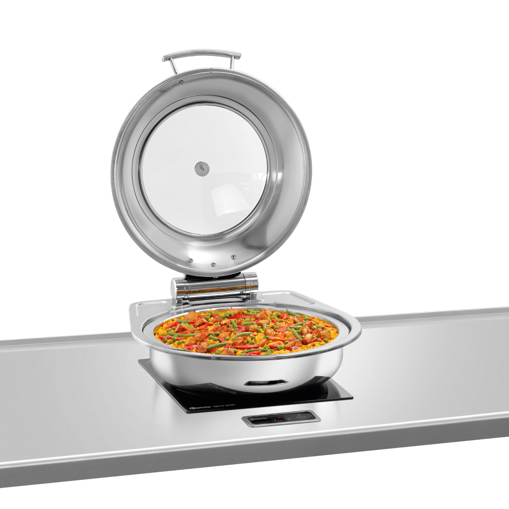 Διαστάσεις 435x472x185(h)mm Διάμετρος εσωτερικού δοχείου Ø 390 mm Μέγιστο βάθος δοχείων GN 65 mm Χωρητικότητα 6.2 lt Υλικό κατασκευής Inox Βάρος 5.4 kg Χαρακτηριστικά καπακιού : Παράθυρο ελέγχου / Μηχανισμός Soft-Close(υδραυλικοί μεντεσέδες καπακιού) Μηχανισμός Lift-up για δοχεία Κατάλληλο για επαγωγικες εστίες & θερμαινόμενες επιφάνειες Συμπεριλαμβάνεται 1 δοχείο Ø390mm βάθους 65mm