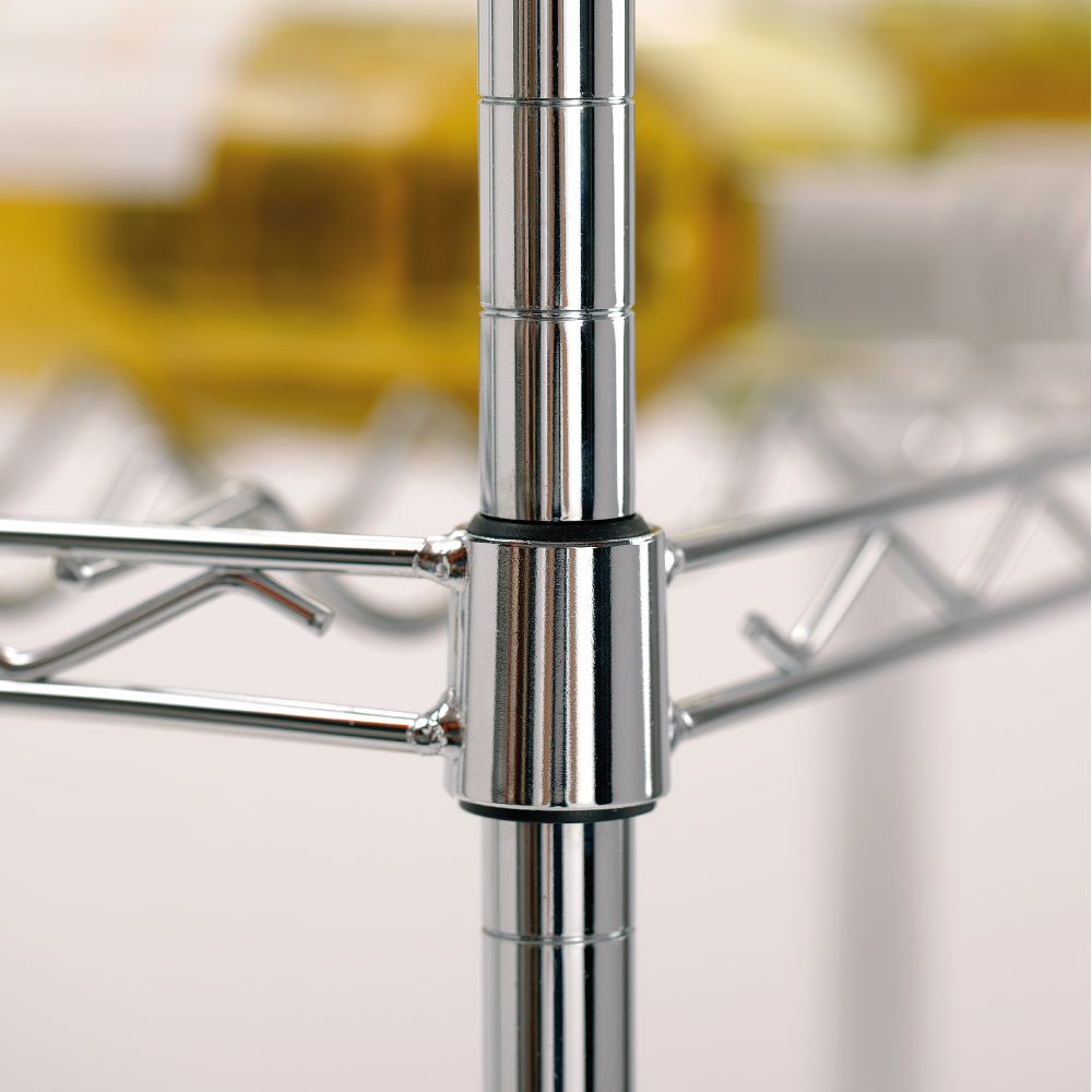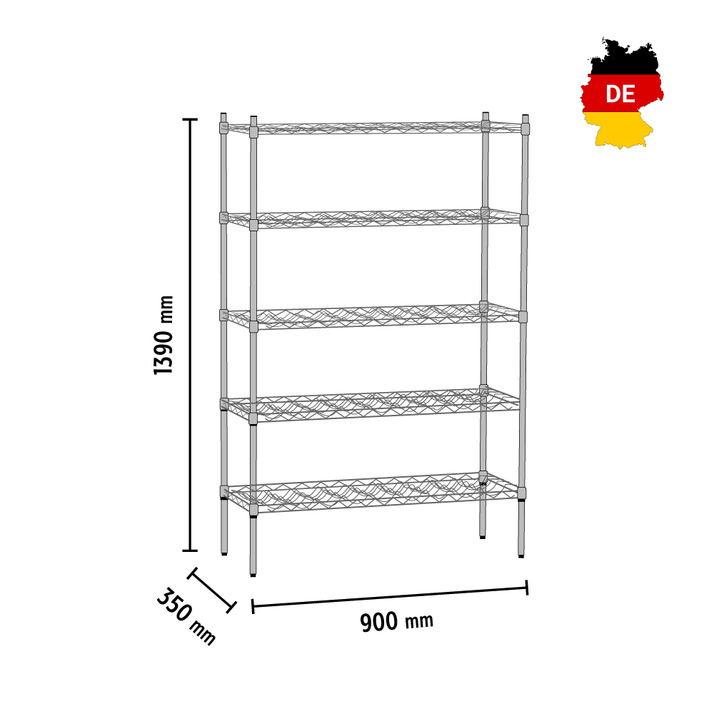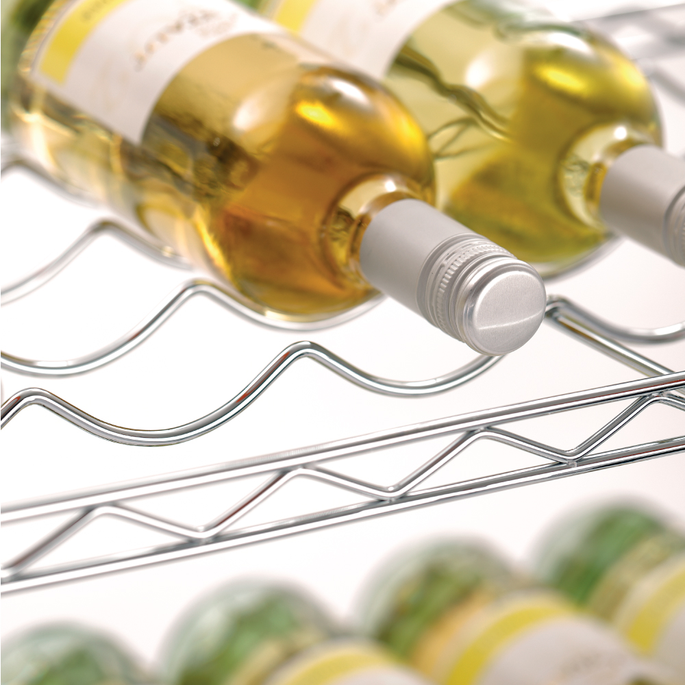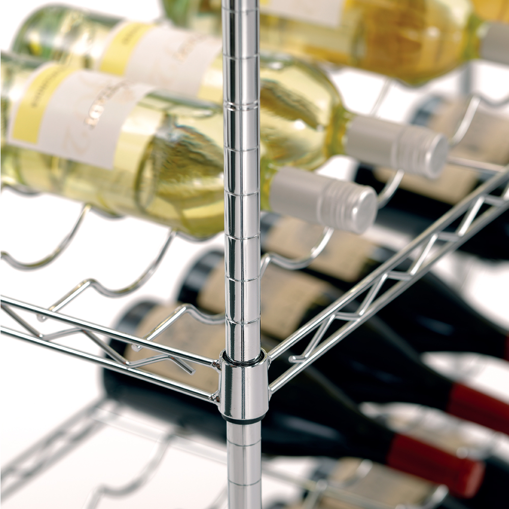 Διαστάσεις 900x350x1390(h)mm Διαστάσεις ραφιού 888x335mm Ράφια 5 (9 διαμορφωμένες εσοχές σε κάθε ράφι) Ορθοστάτες 4 γωνιακοί Μέγιστο βάρος ομοιόμορφα κατανεμημένο 200 Kg Μέγιστο βάρος ανά ράφι 50 Kg Χωρητικότητα 100 - 130 φιάλες κρασιού οριζόντια τοποθετημένες Βάρος 12,5 kg Κατασκευή χρωμίου 5 ράφια με ρύθμιση ύψους Απαιτείται συναρμολόγηση από τον χρήστη