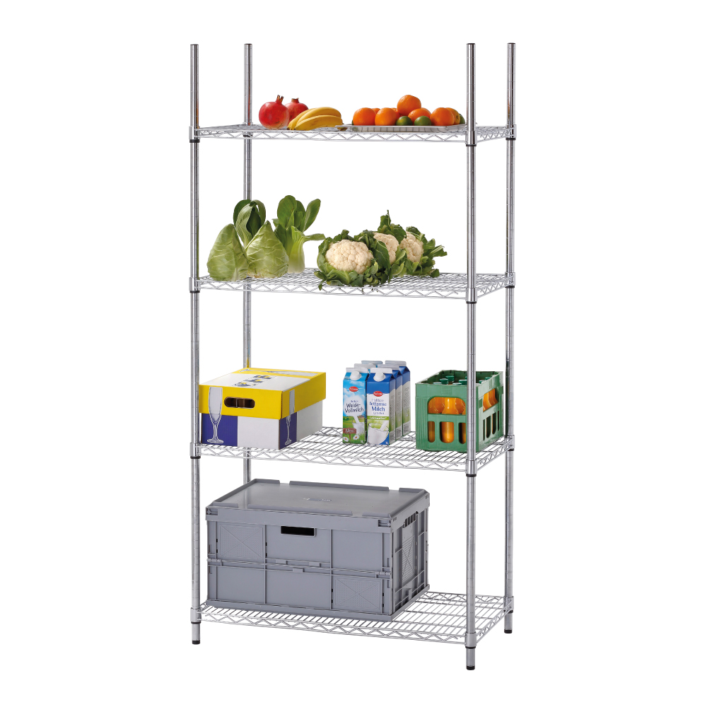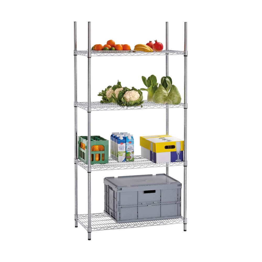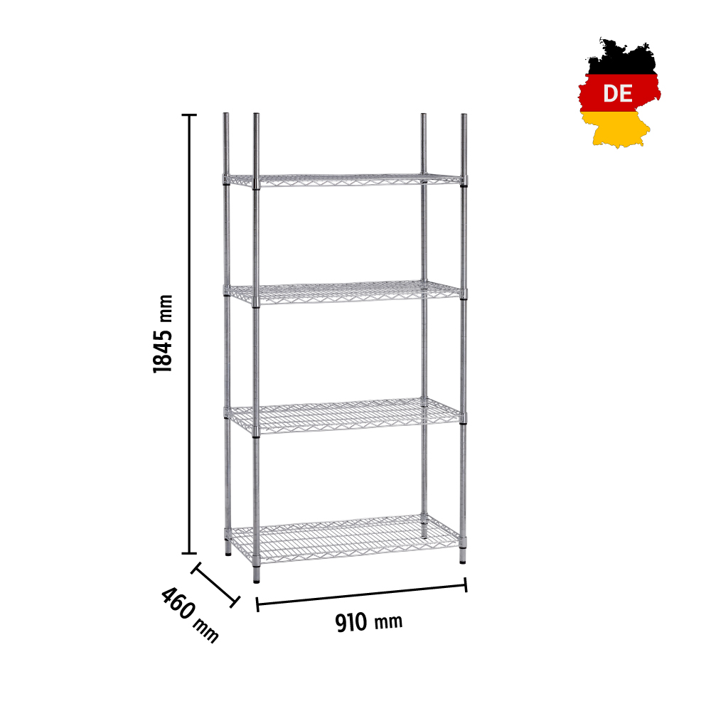 Διαστάσεις 910x460x1845(h)mm Διαστάσεις ραφιού 898x447mm Ράφια 4 Ορθοστάτες 4 γωνιακοί (σύστημα σύνδεσης) Μέγιστο βάρος ομοιόμορφα κατανεμημένο 200 Kg Μέγιστο βάρος ανά ράφι 50 Kg Βάρος 14,3 kg Κατασκευή χρωμίου 4 ράφια με ρύθμιση ύψους Απαιτείται συναρμολόγηση από τον χρήστη