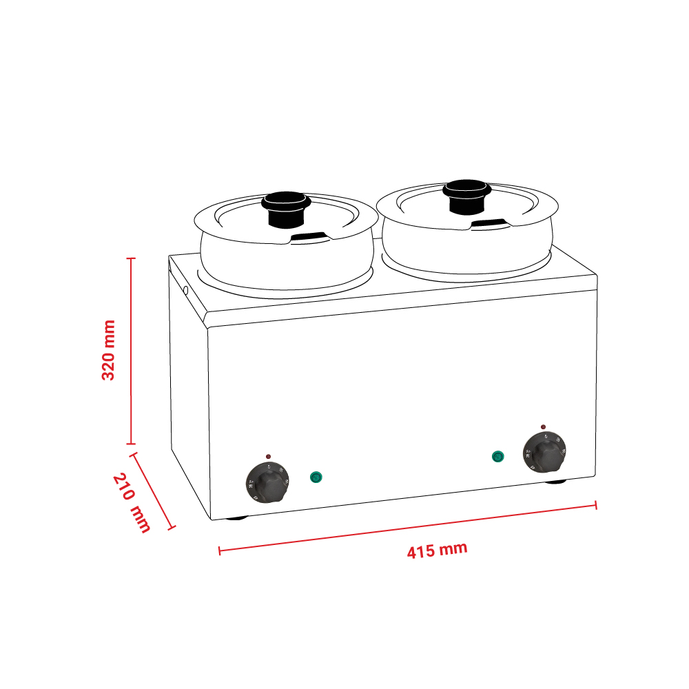 Διαστάσεις 415x210x320(h)mm (με δύο δοχεία και καπάκια) Ισχύς 300 Watt, 230V / 50-60Hz Χωρητικότητα 2 x 3,5 lt Θερμοκρασία 35 - 95οC Βάρος 6,5 kg Κωδικός προϊόντος 606035 Συμπεριλαμβάνονται: δυο δοχεία (κωδικός προϊόντος: 609035) και δύο καπάκια (κωδικός προϊόντος:609135) ΠΡΟΣΟΧΗ!!!ΛΕΙΤΟΥΡΓΕΙ ΜΟΝΟ ΜΕ ΝΕΡΟ!!!