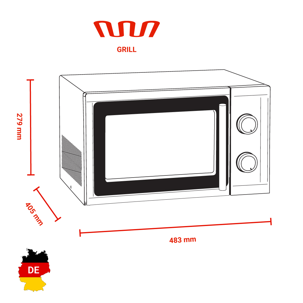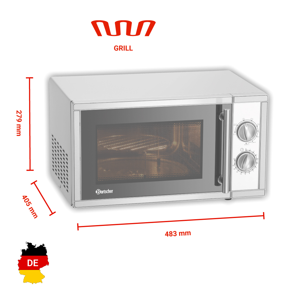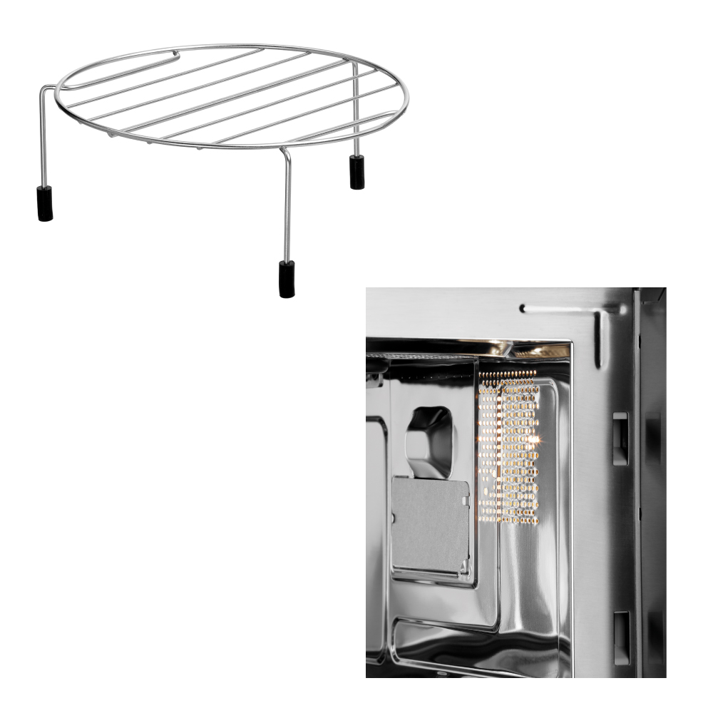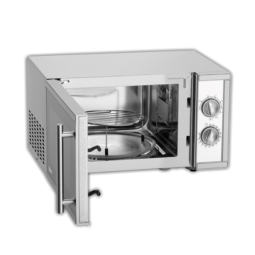 Εξωτερικές διαστάσεις 483x405x279(h)mm Εσωτερικές διαστάσεις 315x312x198(h)mm Χωρητικότητα 23 lt Συνολική Ισχύς 1400 Watt , 230V / 50Hz Ισχύς μικροκυμάτων 900 Watt Ισχύς Grill 1000 Watt Επίπεδα ισχύος 9 Χρονοδιακόπτης 30 λεπτών Magnetron 1 Φωτισμός Εσωτερικός Βάρος 15.4 Kg Inox κατασκευή Λειτουργίες : Απόψυξη / Θέρμανση / Grill (συνδυαζόμενο) Περιστρεφόμενος γυάλινος δίσκος Ø270mm Συμπεριλαμβάνεται σκελετός grill Ø189mm 79mm(h)