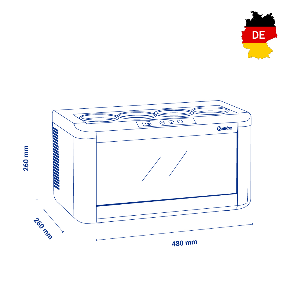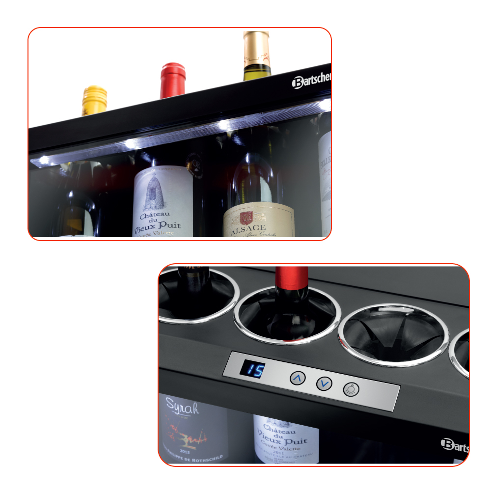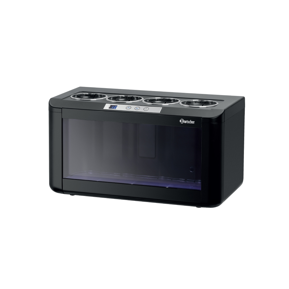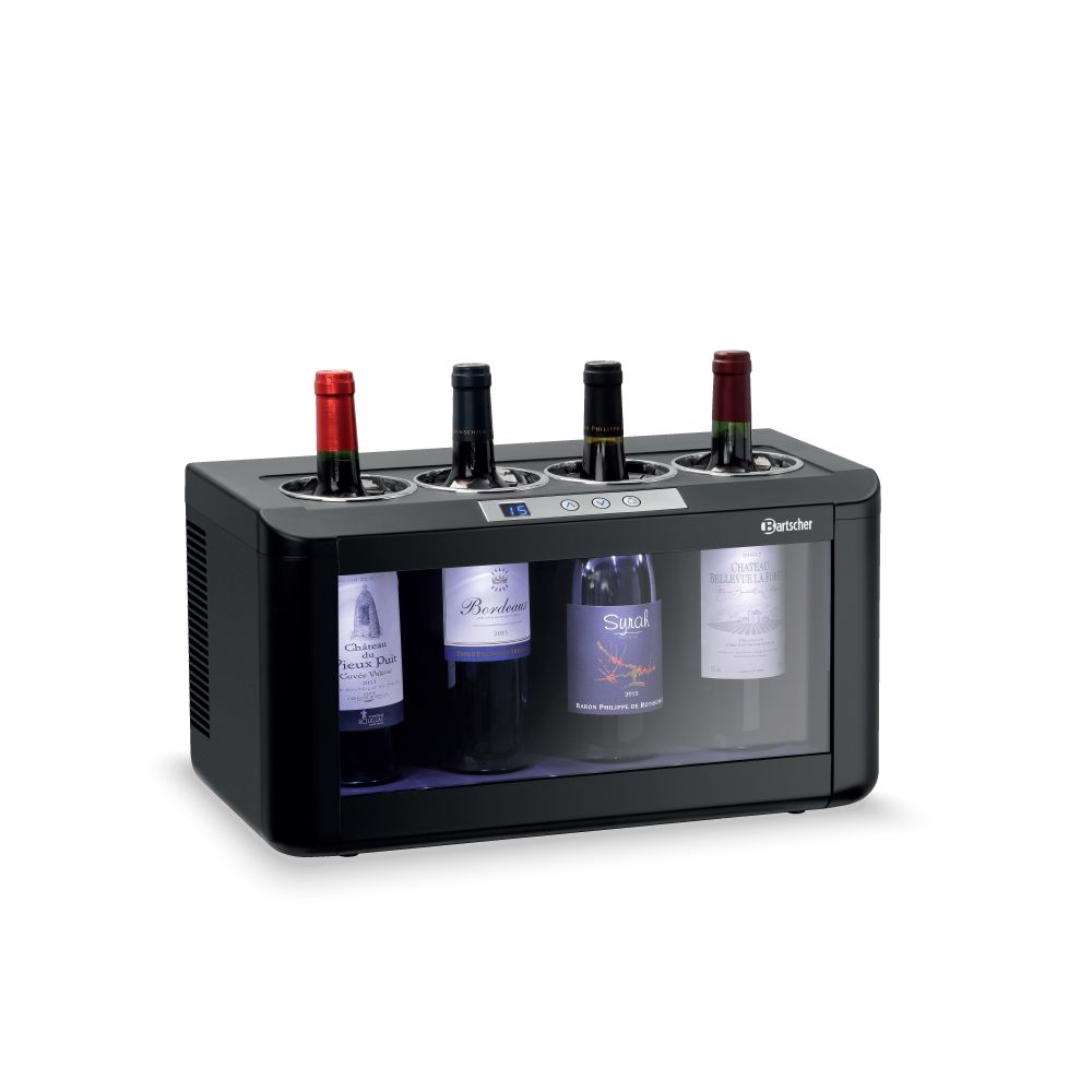 Εξωτερικές διαστάσεις 480x260x260(h)mm Χωρητικότητα 4 φιάλες Θερμοκρασία +5ºC / +18ºC Ισχύς 50Watt / 230V / 50 Hz Άνοιγμα φιάλης Ø 90mm Φωτισμός LED (ξεχωριστά ρυθμιζόμενο) Βάρος 6.8 Kg Ηλεκτρονικό Θερμόμετρο / Ηλεκτρονικός Θερμοστάτης Ρύθμιση θερμοκρασίας ηλεκτρονικά (σε βαθμίδες των 1°C) Ανεμιστήρας