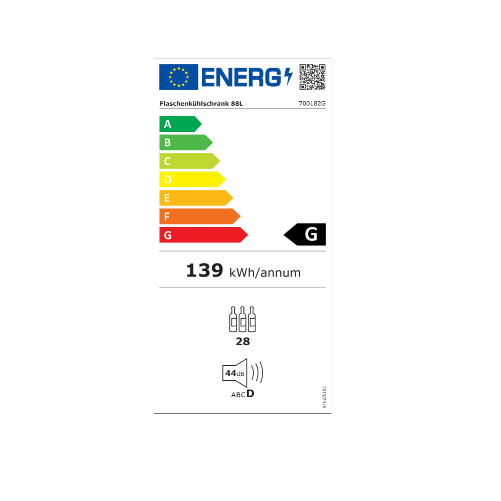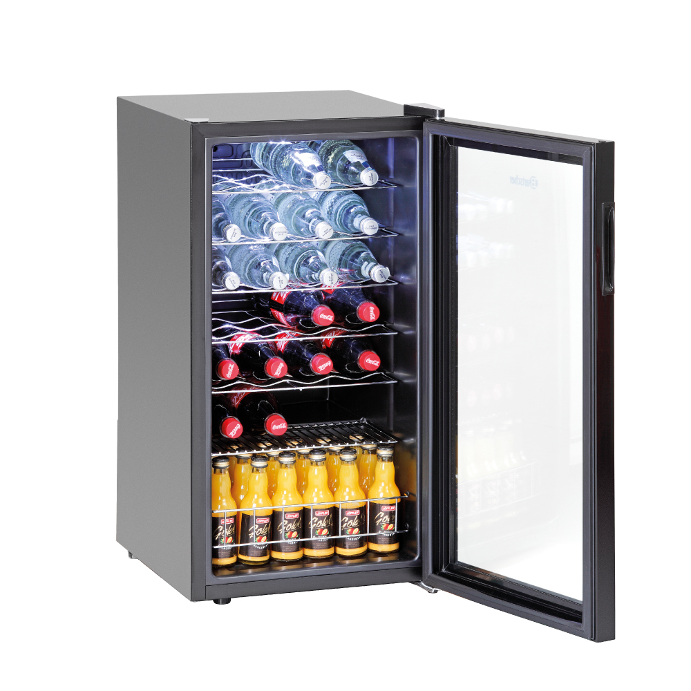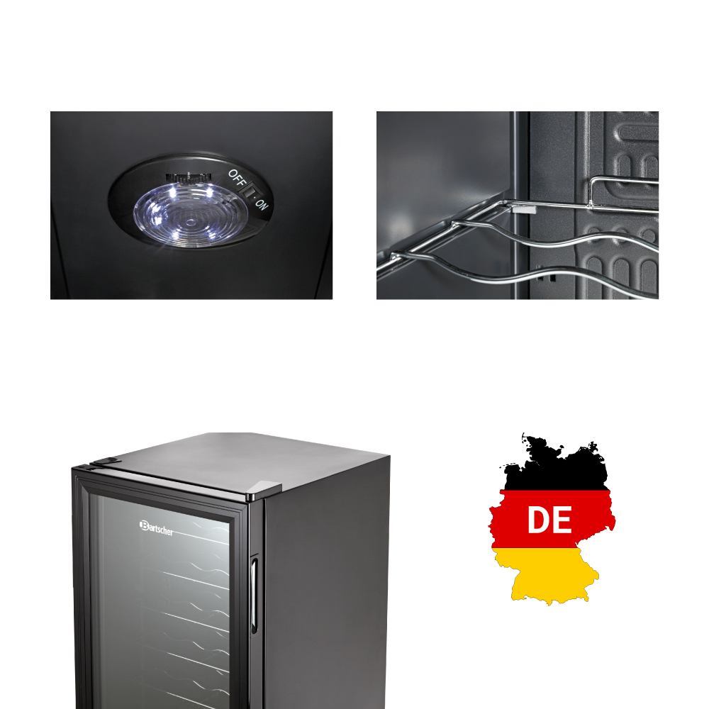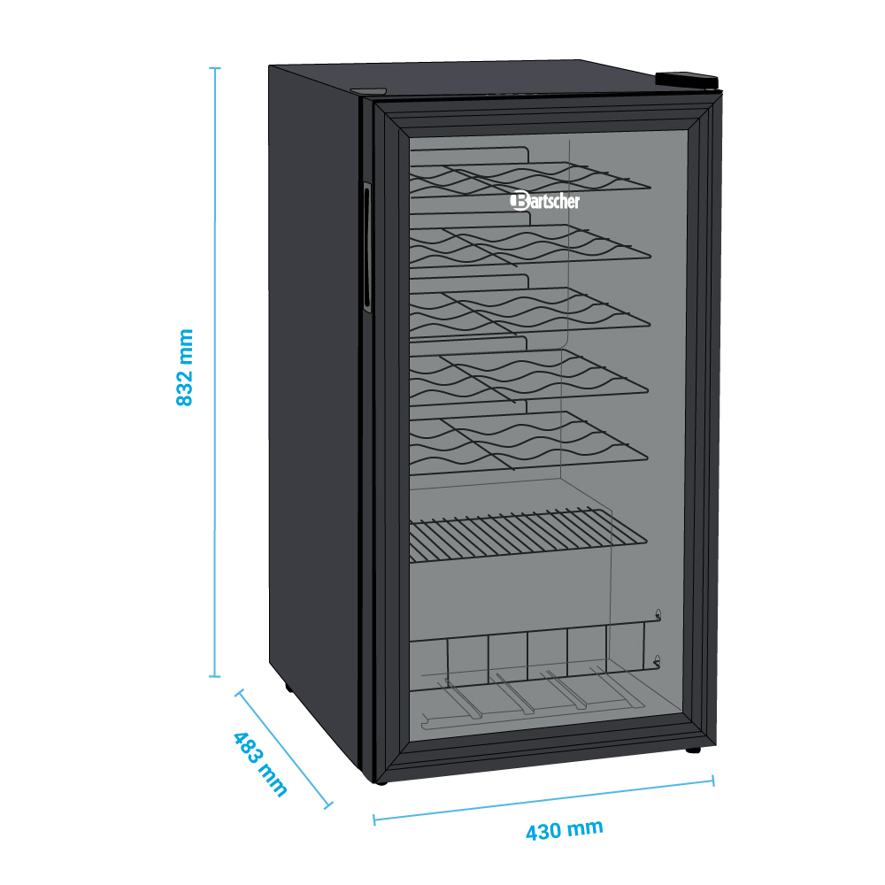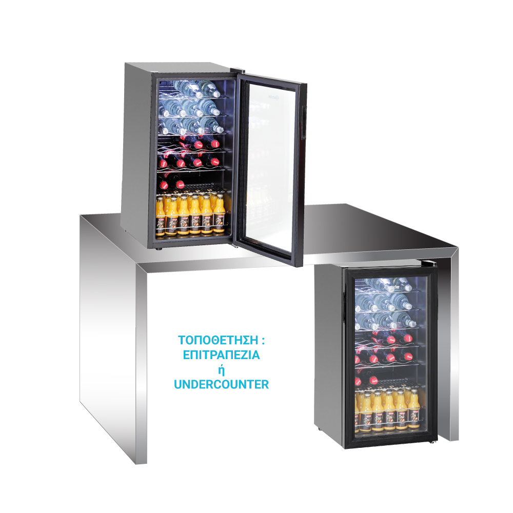 Εξωτερικές διαστάσεις 430x483x832(h)mm Χωρητικότητα 88 lt Θερμοκρασία +2ºC / +10ºC Ισχύς 85Watt / 220-240V / 50Hz Ψύξη Στατική Απόψυξη Χειροκίνητη Ψυκτικό υγρό R600a Επίπεδα προβολής 7 Σχάρες 6 Φωτισμός LED Βάρος 23,4 Kg 5 επινικελομένες σχάρες για μπουκάλια 1 επινικελομένη σχάρα επίπεδη Ανοιγόμενη πόρτα με διπλό κρύσταλλο Δυνατότητα αναστροφής φοράς πόρτας Θερμοστάτης