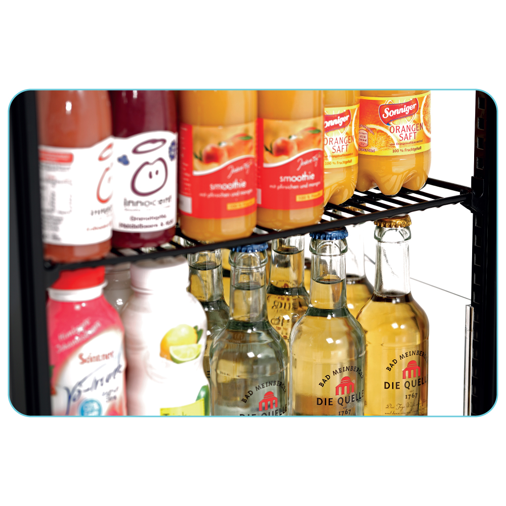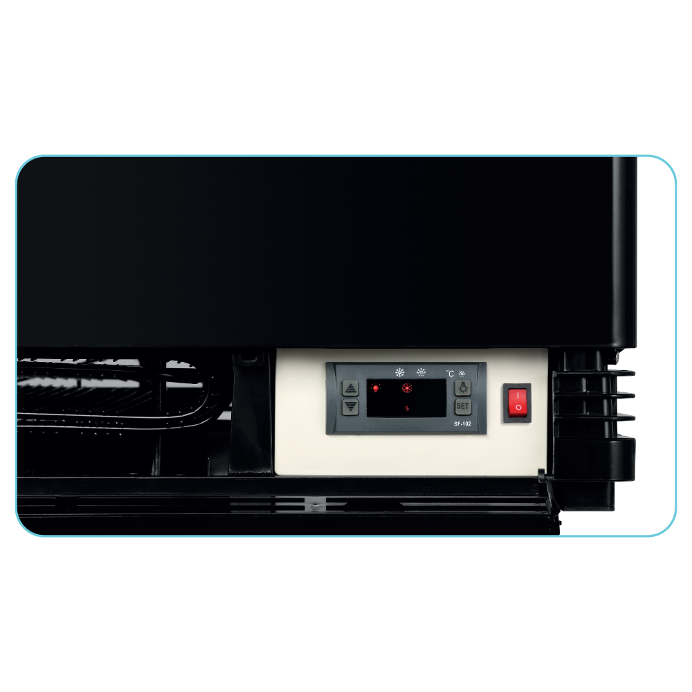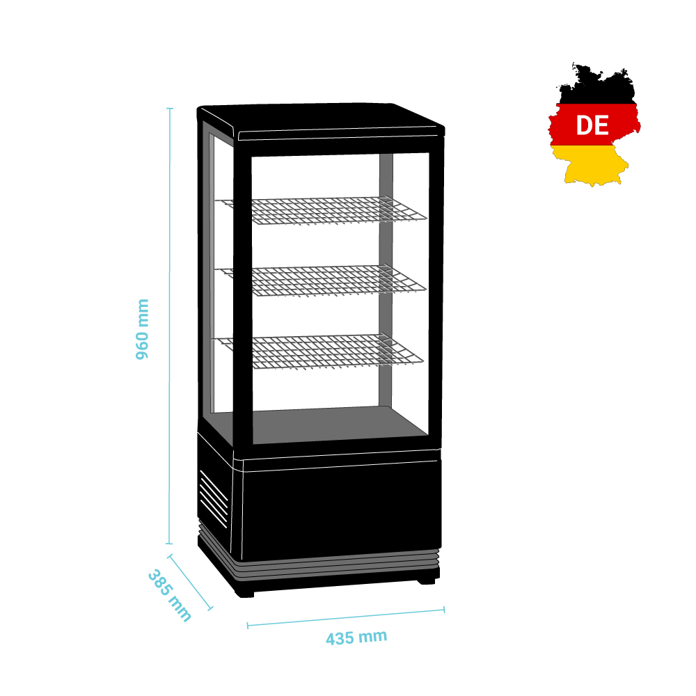 'Εξωτερικές διαστάσεις 435x385x960(h)mm Χωρητικότητα 78 lt Θερμοκρασία +2ºC / +12 οC Ισχύς 180Watt / 230V / 50Hz Ψύξη Βεβιασμένη Απόψυξη Αυτόματη Ψυκτικό υγρό R600a Επίπεδα προβολής 4 Σχάρες 3 (380x325mm) Φωτισμός LED Κλιματική κλάση 4 (30°C & 55%RH) Βάρος 33,2 Kg Ανοιγόμενη πόρτα εμπρός Ρυθμιζόμενες καθ'' ύψος σχάρες Διακόπτης ON/OFF'