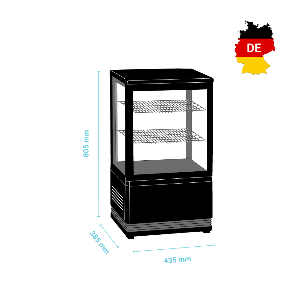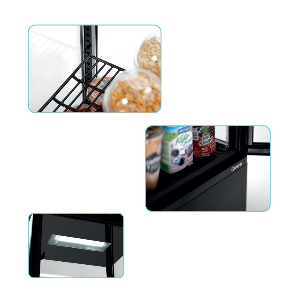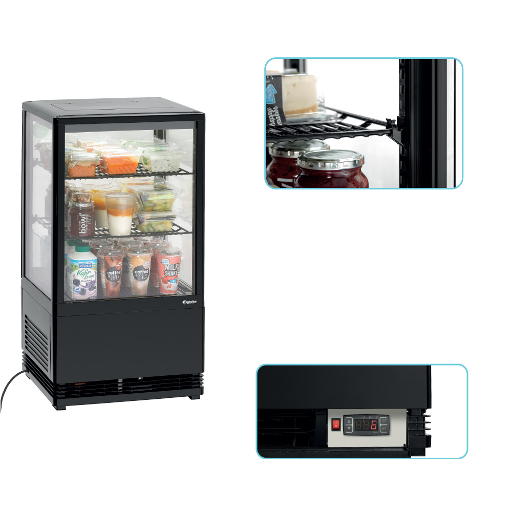 'Εξωτερικές διαστάσεις 435x385x805(h)mm Χωρητικότητα 58 lt Θερμοκρασία +2ºC / +12 οC Ισχύς 180Watt / 230V / 50Hz Ψύξη Βεβιασμένη Απόψυξη Αυτόματη Ψυκτικό υγρό R600a Επίπεδα προβολής 3 Σχάρες 2 (380x325mm) Φωτισμός LED Κλιματική κλάση 4 (30°C & 55%RH) Βάρος 28,5 Kg Ανοιγόμενη πόρτα εμπρός Ρυθμιζόμενες καθ'' ύψος σχάρες Διακόπτης ON/OFF'