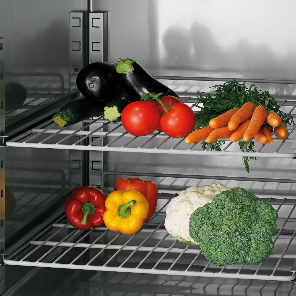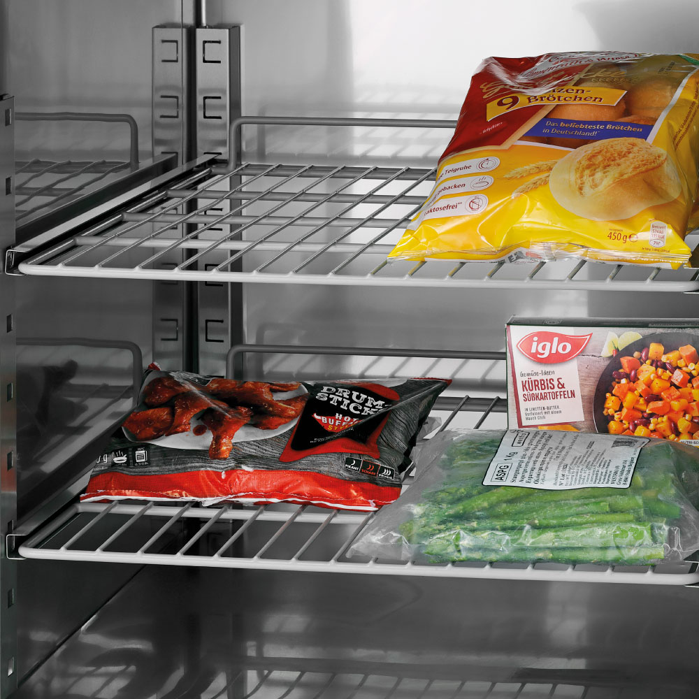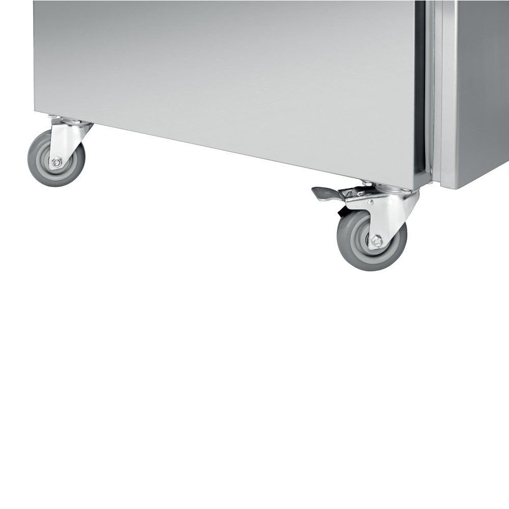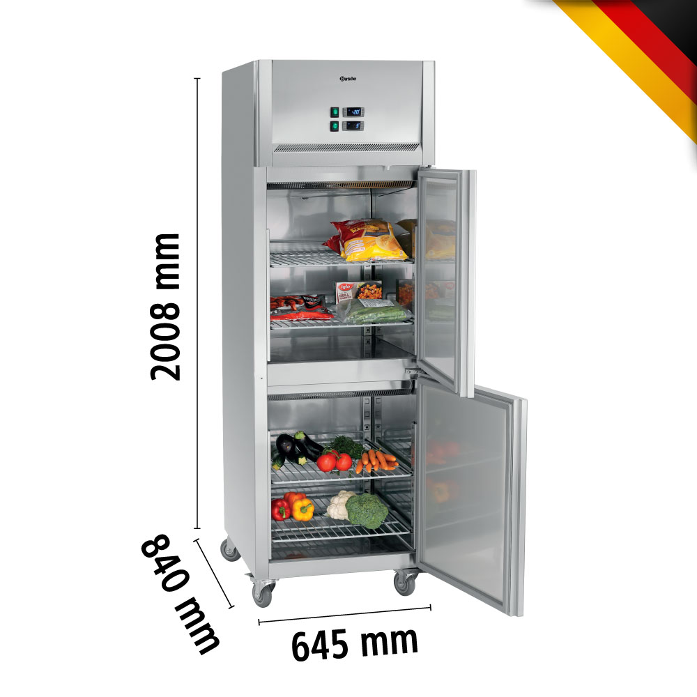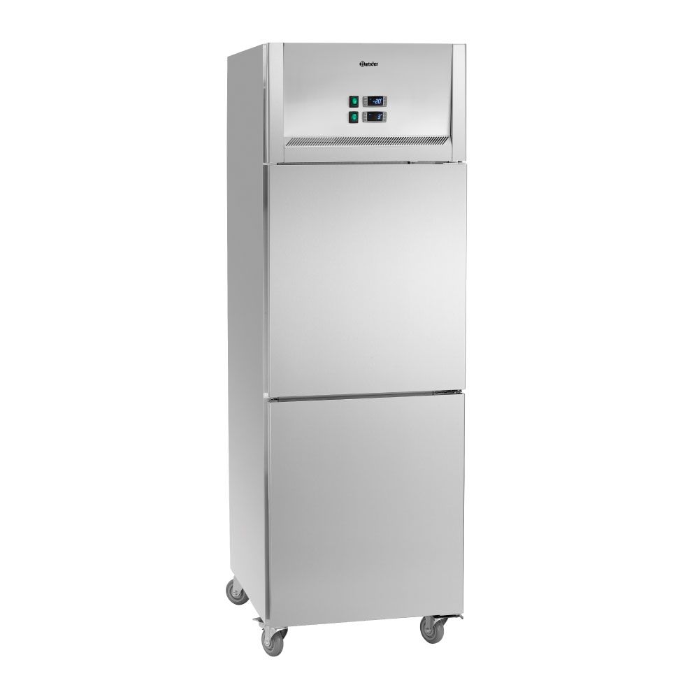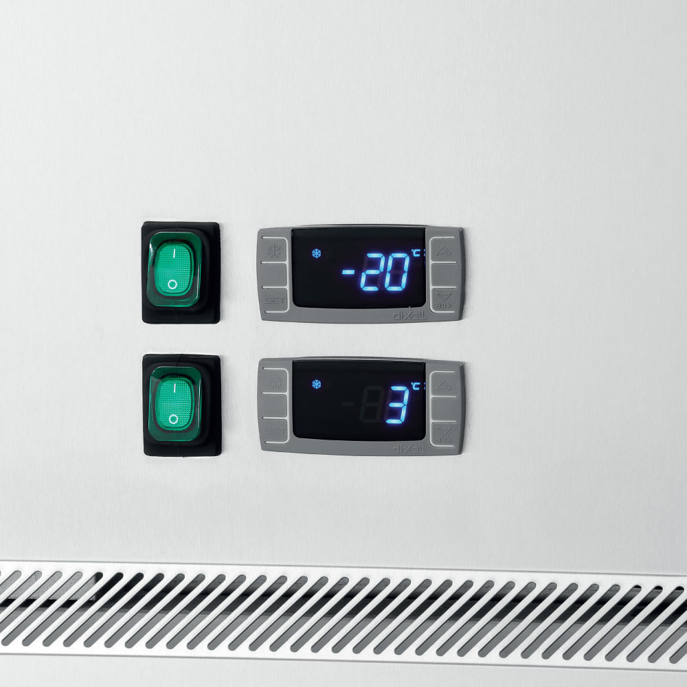 Εξωτερικές διαστάσεις 645x840x2008(h)mm Χωρητικότητα 484 lt Θερμοκρασία συντήρησης (κάτω) +1ºC / +10ºC Θερμοκρασία κατάψυξης(άνω) -18°C / - 22ºC Ισχύς 767 Watt / 230V / 50Hz Ψύξη Βεβιασμένη Απόψυξη Αυτόματη Ψυκτικό υγρό R290 Αριθμός ενδιάμεσων επιφανειών αποθήκευσης 4 (525x640mm) Απόσταση ανάμεσα στις υποδοχές 55 mm Βάρος 122.8 Kg 4 ρόδες πολλαπλής κατεύθυνσης (οι 2 με φρένο) Ηλεκτρονικός πίνακας λειτουργιών Διακόπτες On/off ξεχωριστά για συντήρηση - κατάψυξη Τα GN δεν συμπεριλαμβάνονται