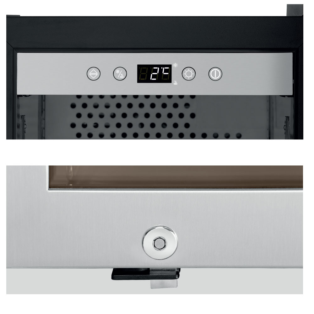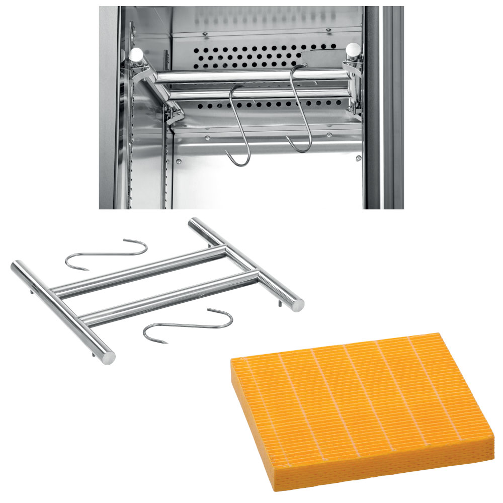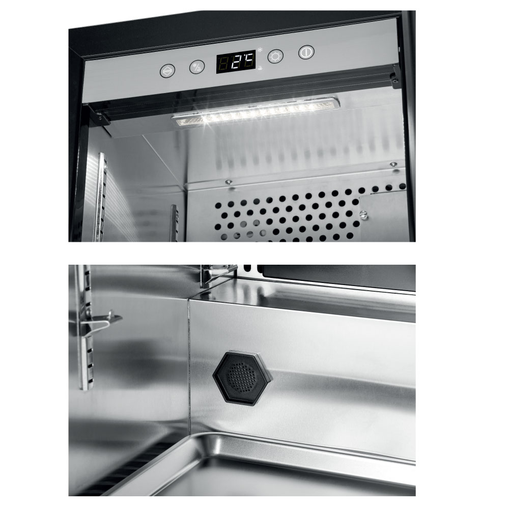 Εξωτερικές Διαστάσεις 400x605x875(h)mm Εσωτερικές Διαστάσεις 310x370x480(h)mm Χωρητικότητα 63 lt Θερμοκρασία 2oC έως 14oC Ρύθμιση θερμοκρασίας ανα 1°C Ισχύς 135Watt / 230V / 50Hz Ψύξη Βεβιασμένη Απόψυξη Χειροκίνητη Ψυκτικό υγρό R600a Υγρασία αέρα 50% έως 85% Ρύθμιση υγρασίας ανά 1% Ενδιάμεσες επιφάνειες 4 σχάρες (295x245mm) Επιτρεπόμενο φορτίο ανά βάση ανάρτησης 20 kg Φωτισμός LED Βάρος 40.6 Kg Συμπεριλαμβάνονται: 1 φίλτρο ενεργού άνθρακα 1 λαμαρίνα συγκράτησης 1 λαβή με υλικό συναρμολόγησης 1 βάση ανάρτησης & 3 γάντζοι για κρέας 1 σφουγγάρι υδαταποθήκευσης & συλλέκτης υγρών 4 σχάρες 2 κλειδιά