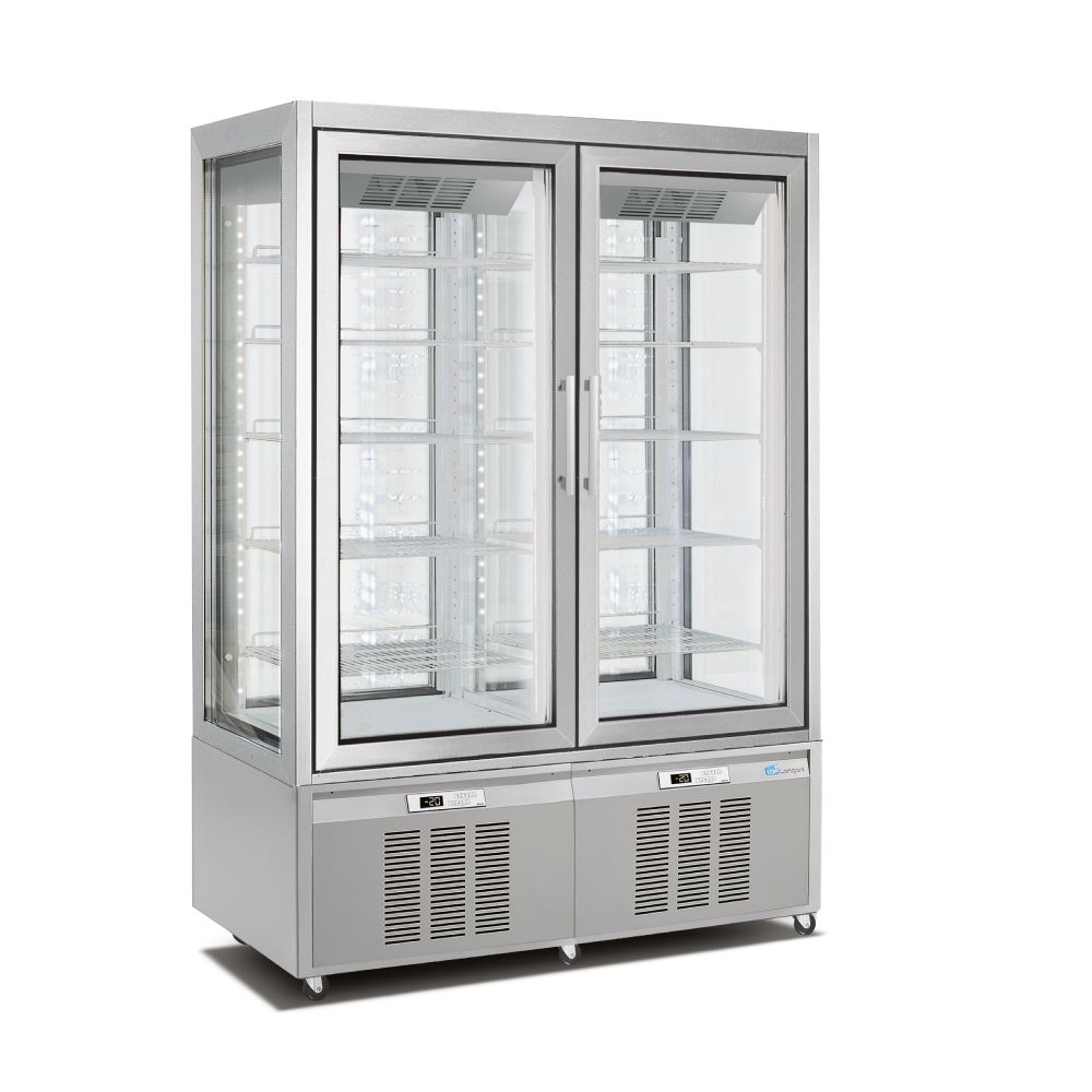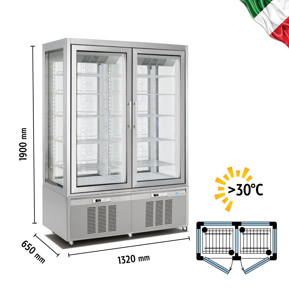 Εξωτερικές διαστάσεις 1320x650x1900(h)mm Χωρητικότητα 840 lt Ισχύς 1800 Watt / 230V / 50 Hz Θερμοκρασία +5ºC / -20 οC Ψύξη Βεβιασμένη Απόψυξη Αυτόματη Freon R290 Ράφια 5+5 (530x450mm) Φωτισμός LED Βάρος 308 Kg Ψηφιακό Θερμόμετρο / Ηλεκτρονικός Θερμοστάτη