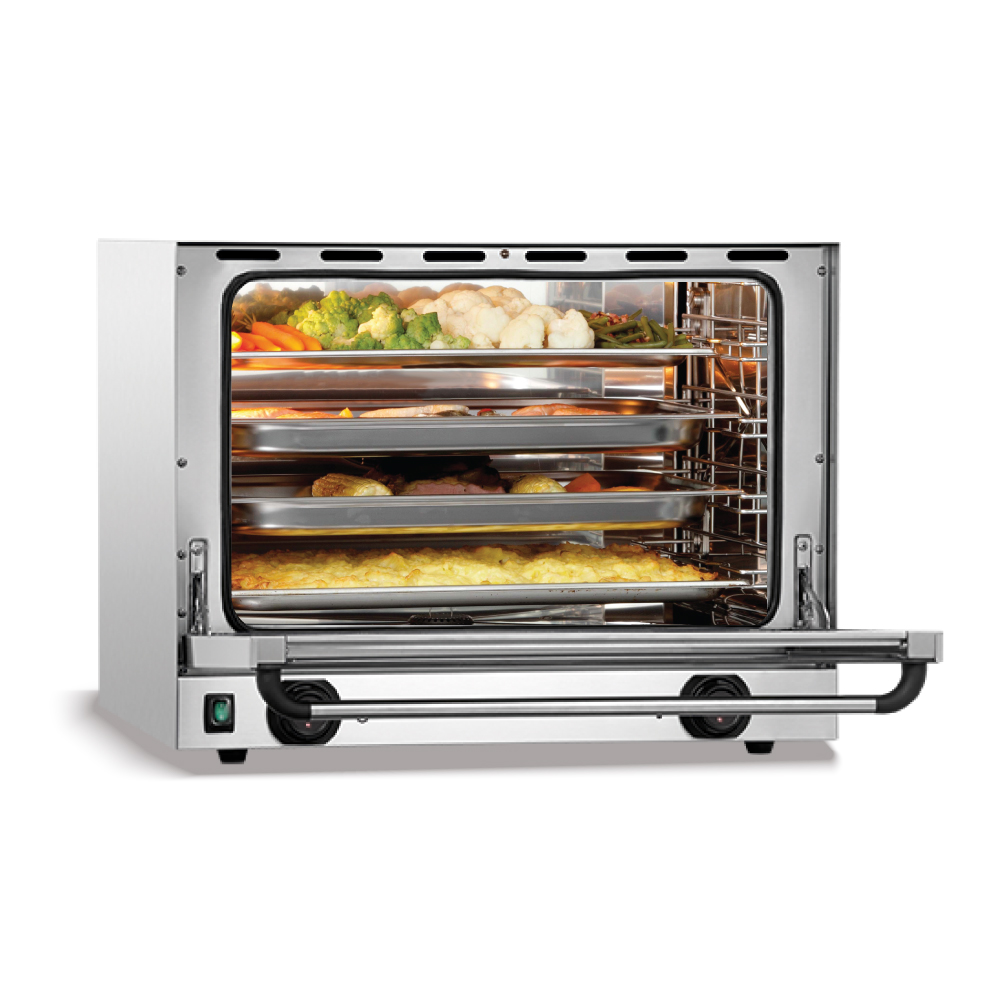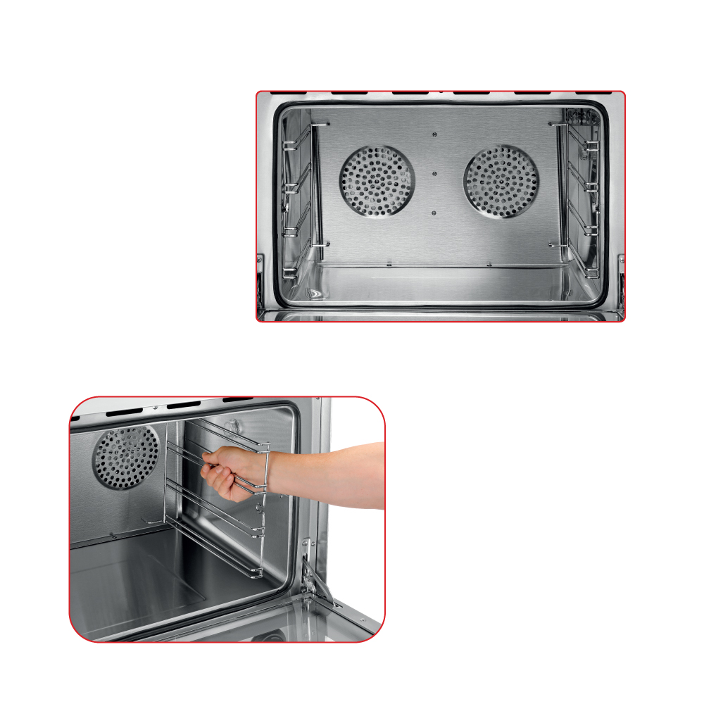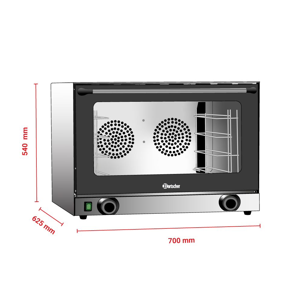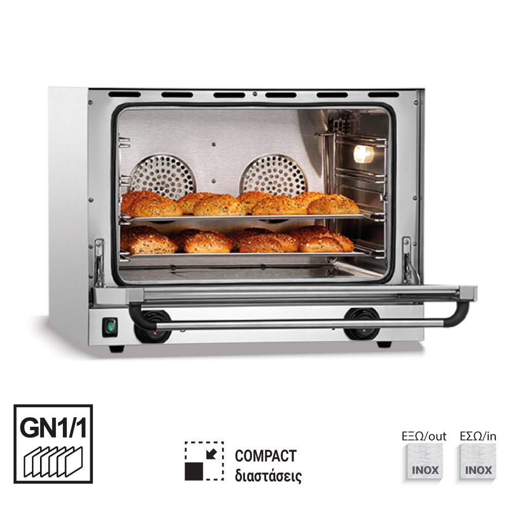 'Εξωτερικές διαστάσεις 700x625x540(h)mm Εσωτερικές διαστάσεις 565x385x350(h)mm Χωρητικότητα 4 υποδοχές GN 1/1 Απόσταση μεταξύ υποδοχών 70 mm Ισχύς 3 KWatt, 230V / 50Hz Ανεμιστήρες 2 Θερμοκρασία 50°C - 300°C Χρονοδιακόπτης 0-120'' Χρόνος θέρμανσης περίπου 12 λεπτά σε 150° Λειτουργίες Κυκλοφορία αέρα Φωτισμός Εσωτερικός Βάρος 42.2 Kg Διπλό τζάμι πόρτας Στρογγυλεμένος θάλαμος ψησίματος Αφαιρούμενες ράβδοι απόθεσης Ακουστικό σήμα μετα την λήξη του χρόνου Μοχλός με ψηφιακή ένδειξη για θερμοκρασία & χρόνο Ρύθμιση θερμοκρασίας :Ηλεκτρονικά σε βήματα 1°C Περιλαμβάνονται 1 Σχάρα & 1 ταψί GN 1/1'