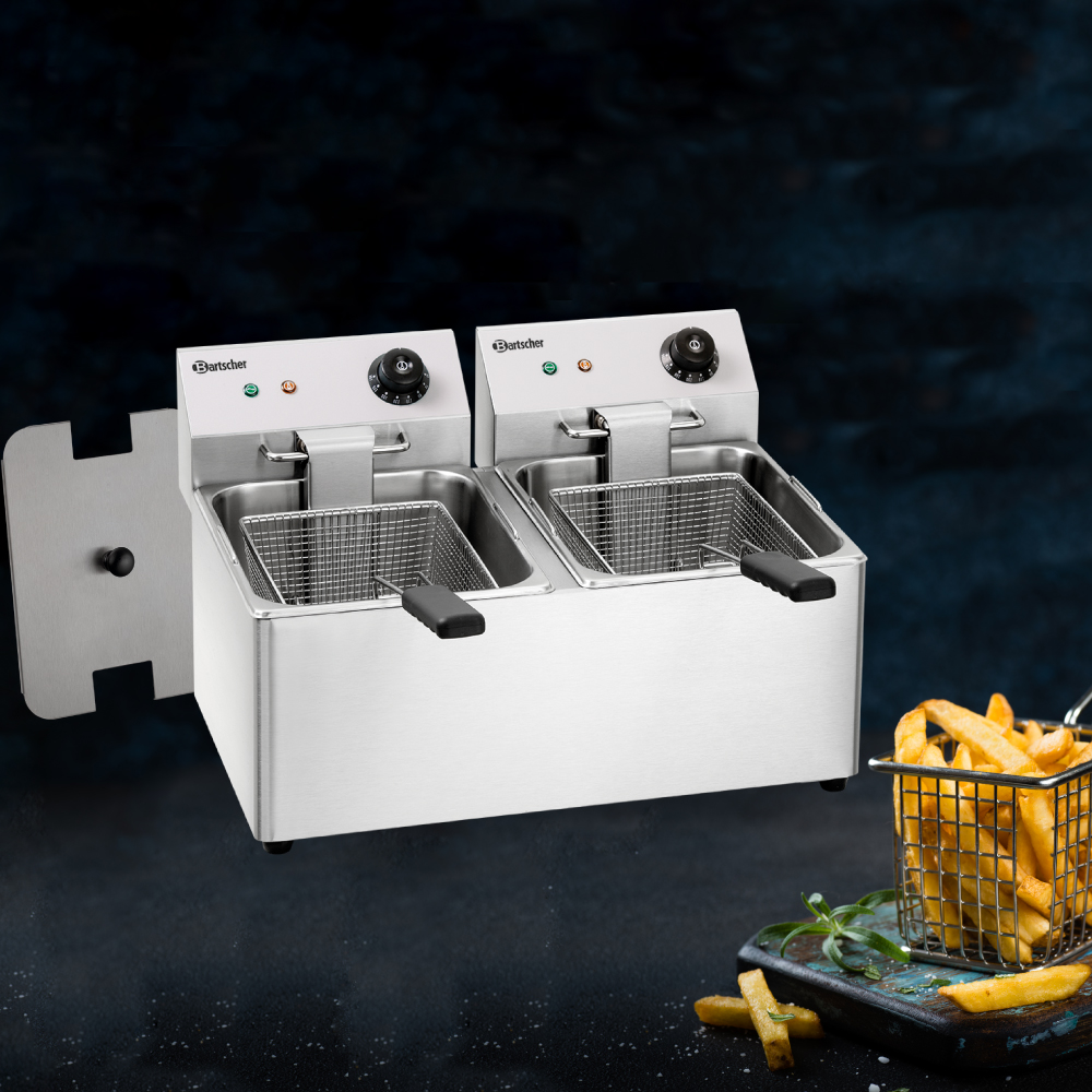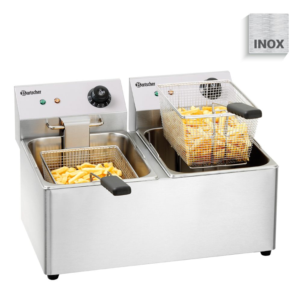 Διαστάσεις 550x580x340(h)mm Χωρητικότητα κάδων 8+8 lt Διαστάσεις καλαθιού 195x245x140(h)mm Θερμοκρασία ρυθμιζόμενη 50 - 190οC Ισχύς 3,25 + 3,25 KWatt (2 φις), 230V / 50Hz Βάρος 12,5 kg Κωδικός Προϊόντος A162812E Σύστημα κρύας ζώνης (cold zone system) Θερμοστάτης ασφαλείας (για υπερθέρμανση) Ιnox περίβλημα , καπάκι & πίνακας διακοπτών Κατάλληλη για λάδια τηγανίσματος & στερεά λίπη Περιλαμβάνει δύο καλάθια τηγανίσματος (κωδικός προϊόντος: 165523)