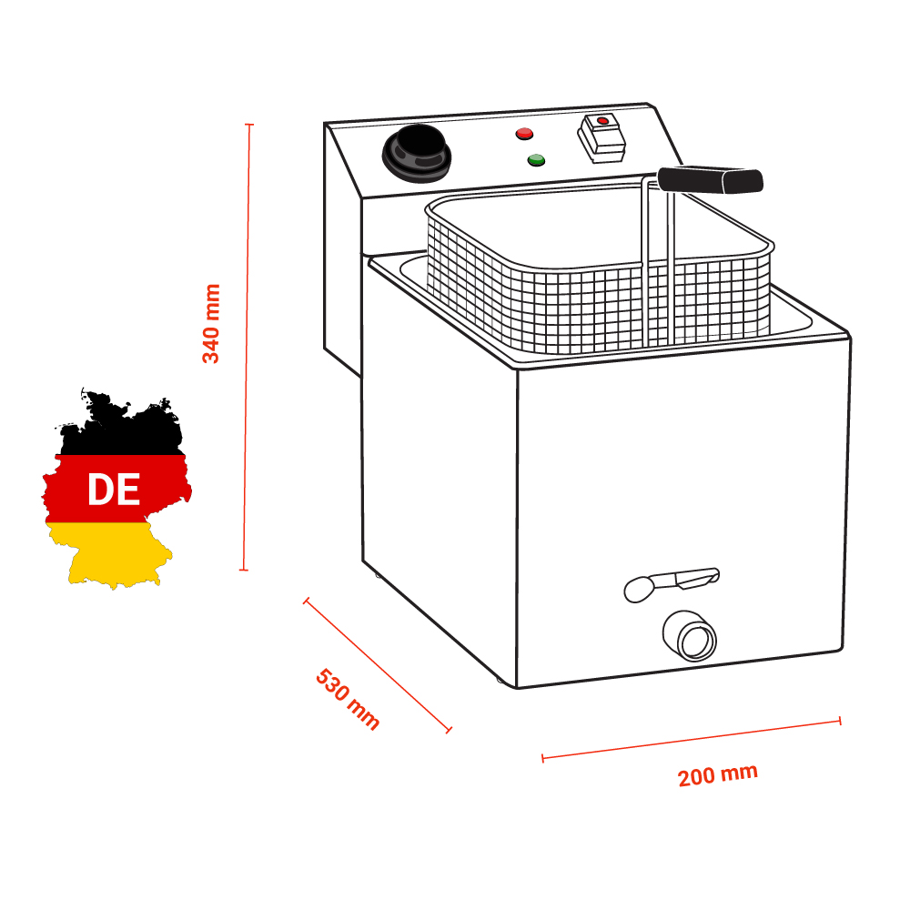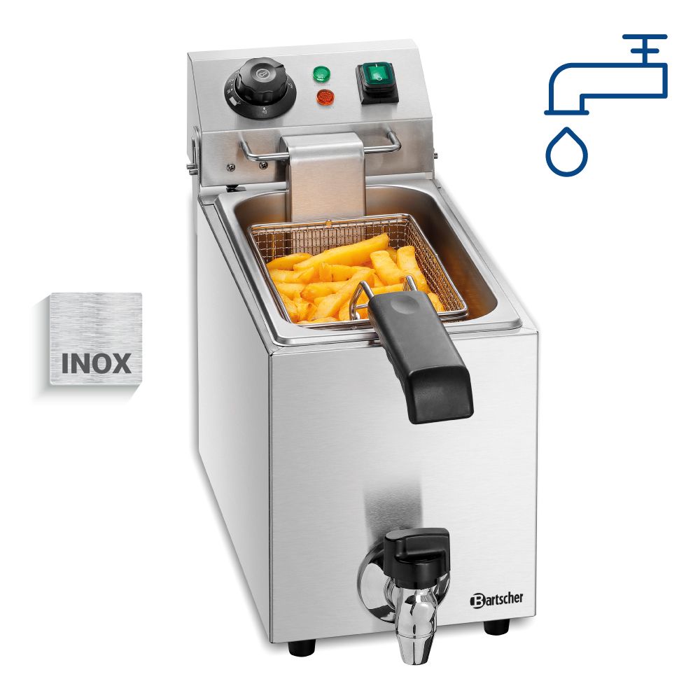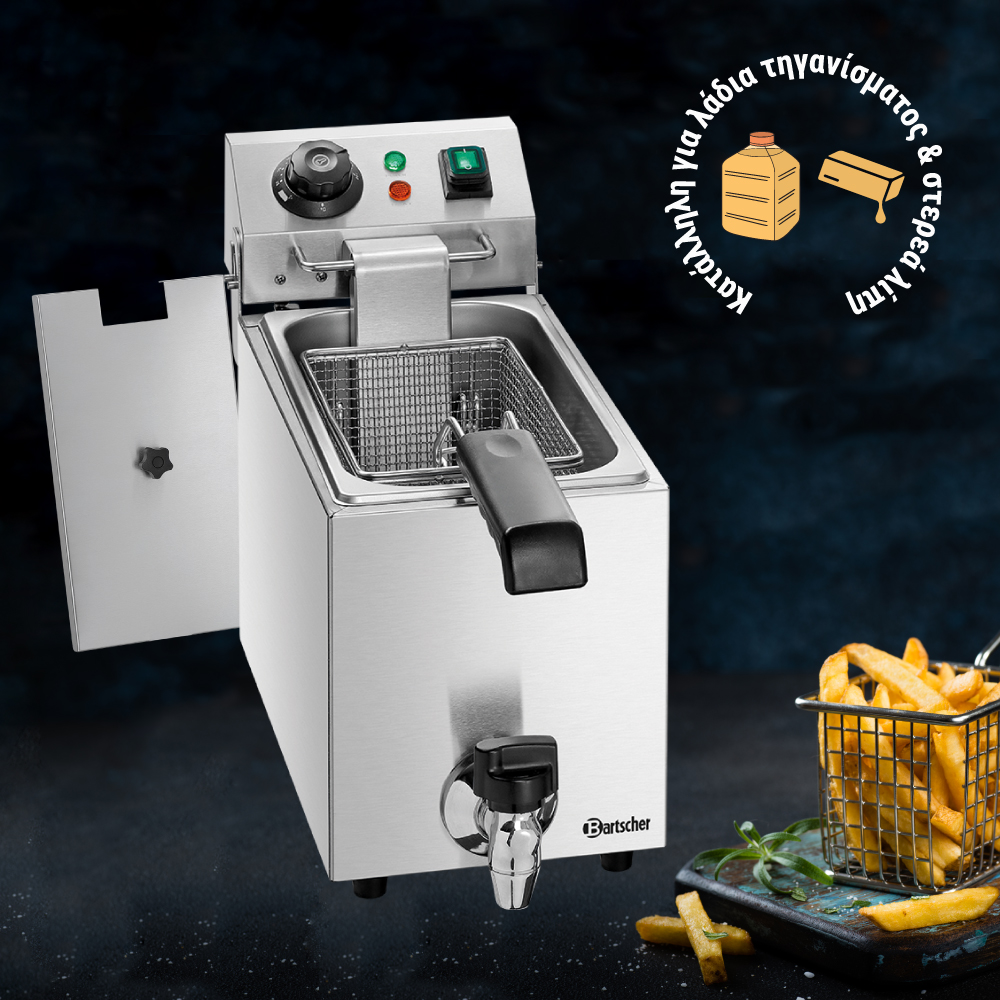 Διαστάσεις 200x530x340(h)mm Χωρητικότητα κάδου 4 lt Θερμοκρασία ρυθμιζόμενη 50 - 190οC Ισχύς 2 KWatt, 230V / 50-60 Hz Βάρος 4.2 kg Κωδικός Προϊόντος A162820E INOX περίβλημα , καπάκι & πίνακας διακοπτών Σύστημα κρύας ζώνης (cold zone system) Θερμοστάτης ασφαλείας (για υπερθέρμανση) Περιλαμβάνει ένα καλάθι τηγανίσματος (κωδικός προϊόντος: 162826)